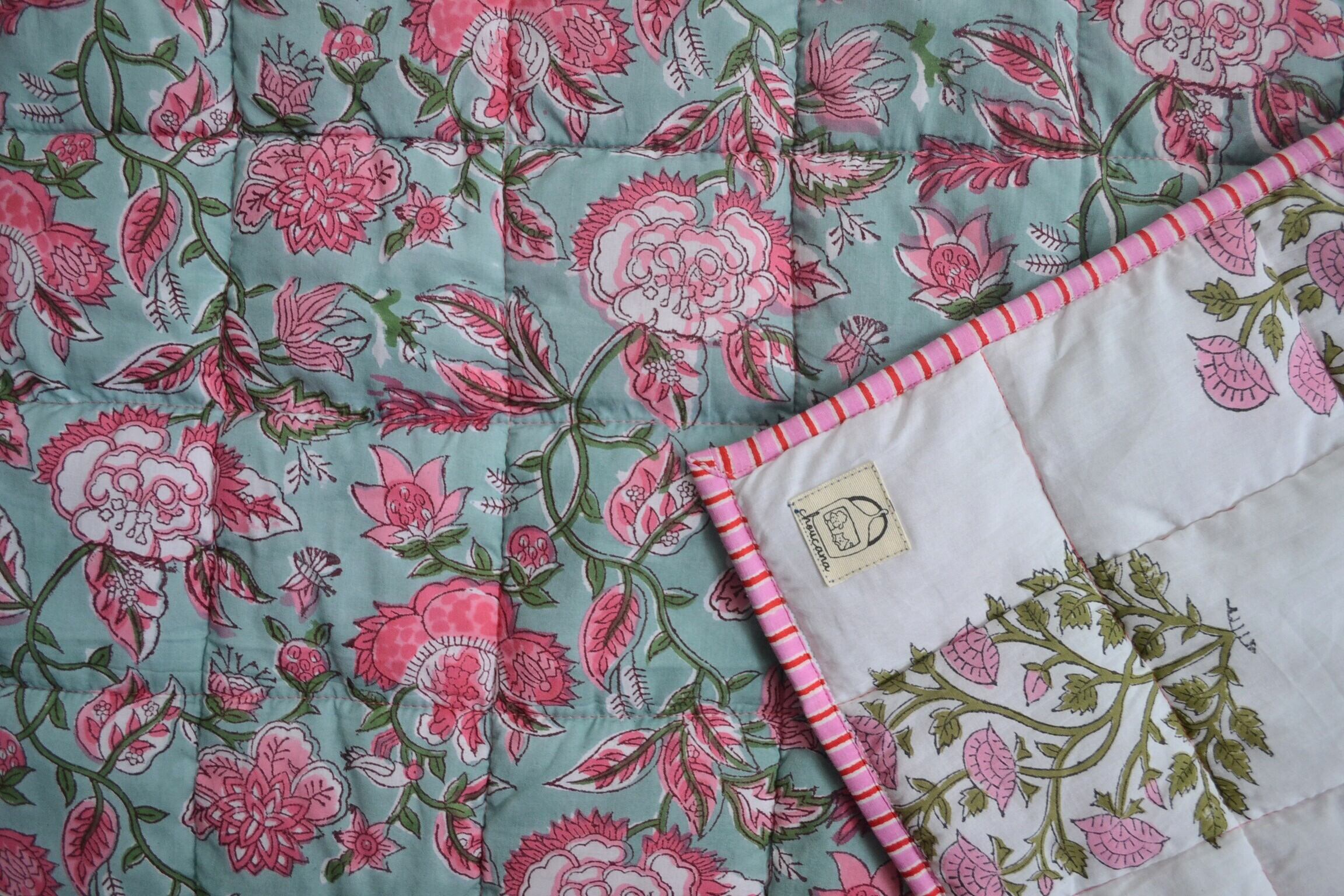 インドのブロックプリントは木版画を押し付けて職人がひとつひとつ模様を描いている為、色のズレや濃淡、染料のハネなどがございます。又、キルトステッチの糸の飛び出しがある場合がございますのでご了承くださいませ。
