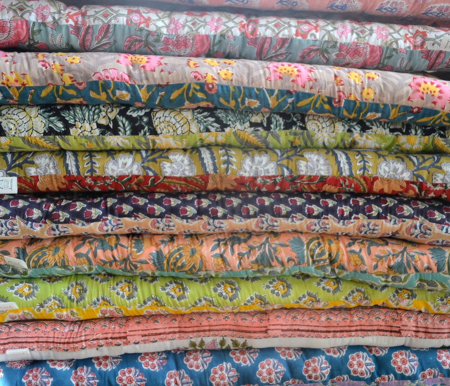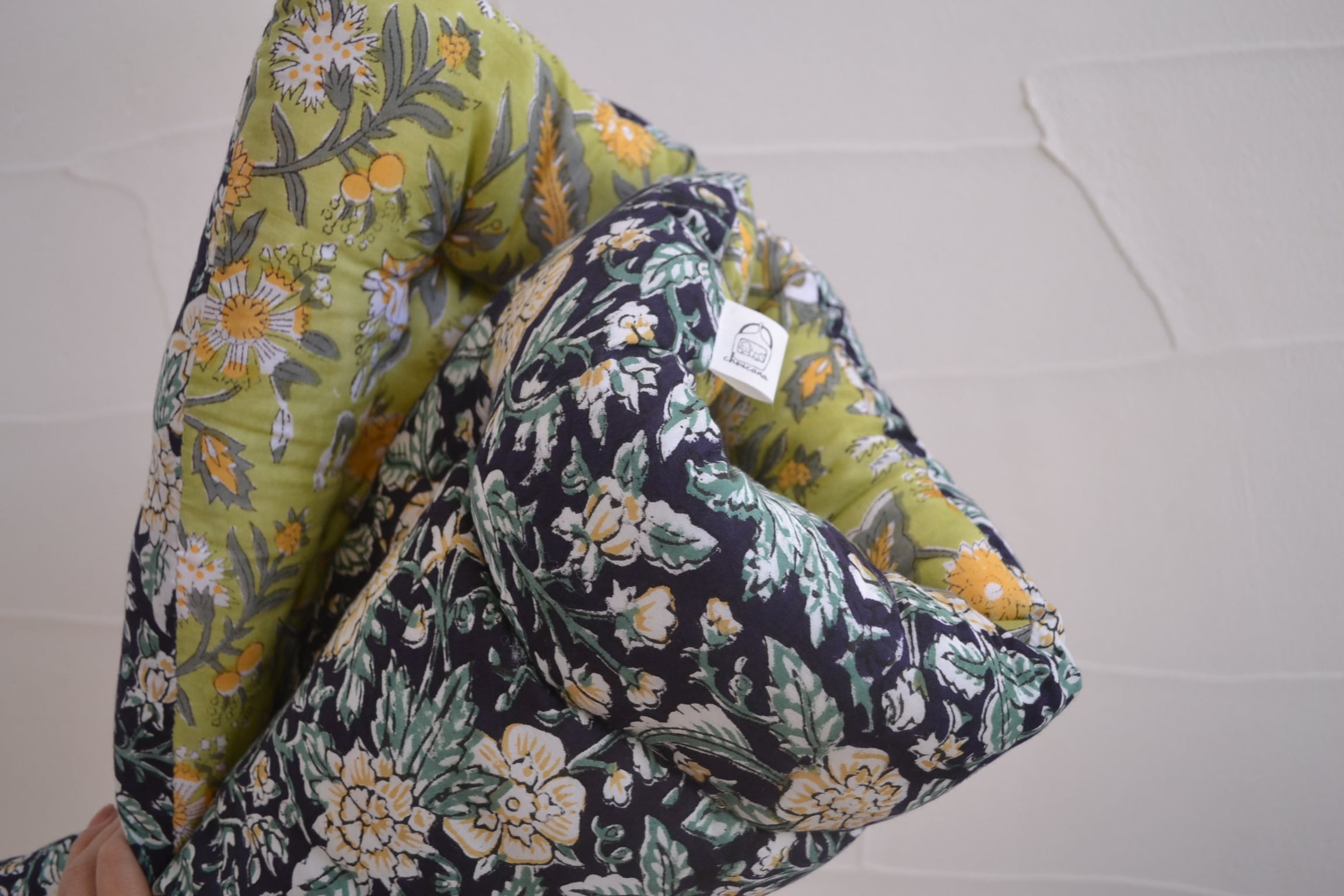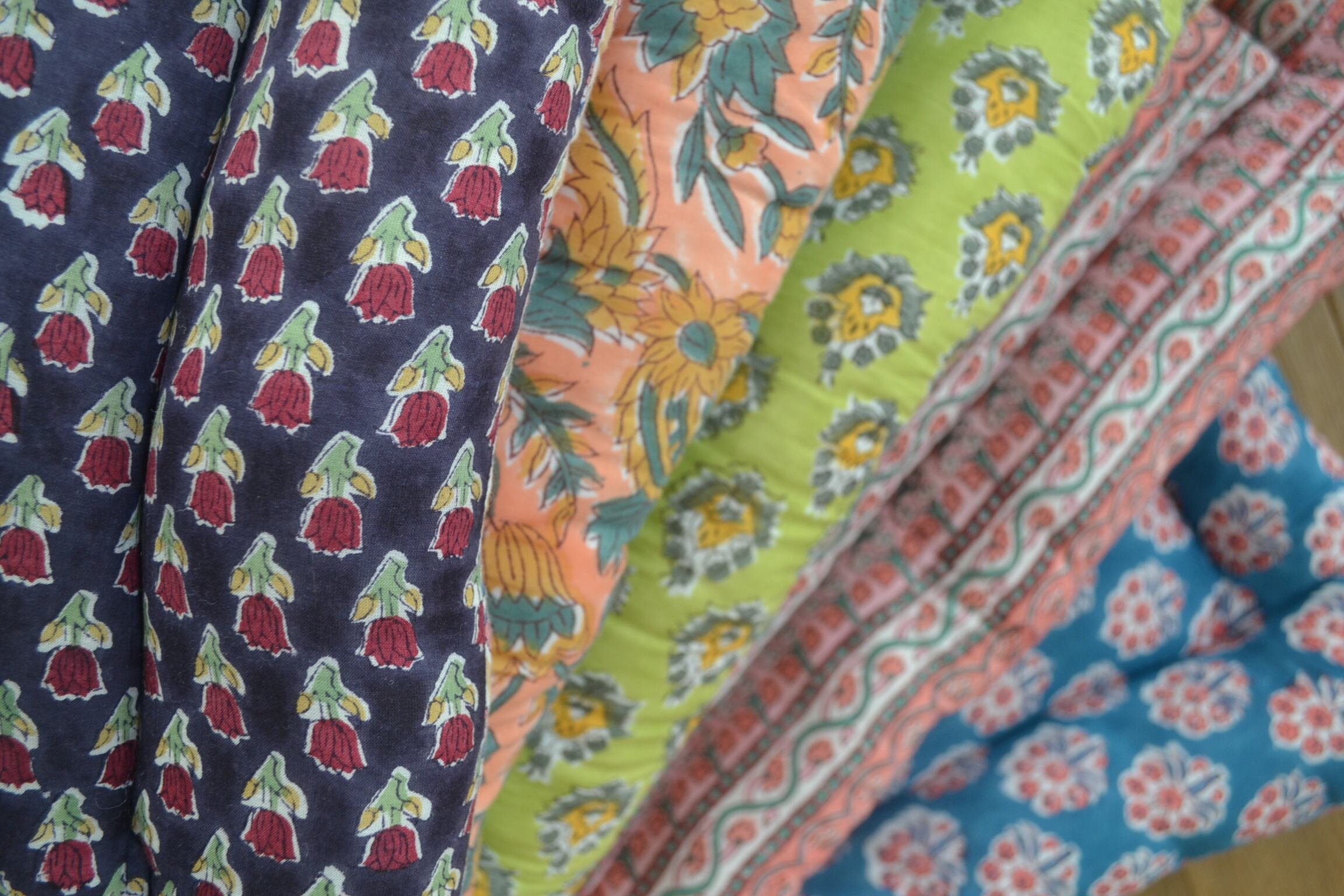 インドのブロックプリントは木版画を押し付けて職人がひとつひとつ模様を描いている為、色のズレや濃淡、染料のハネなどがございます。