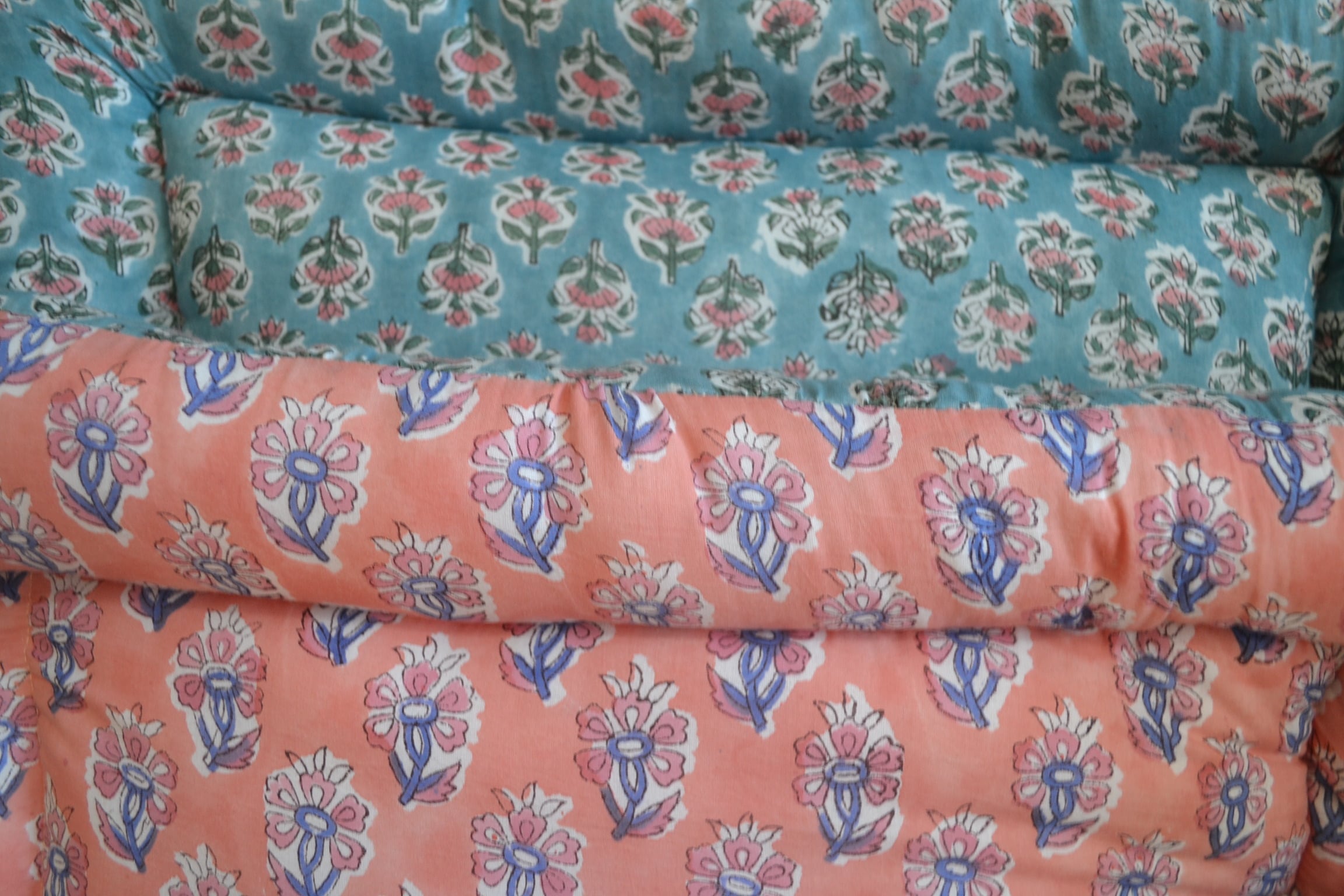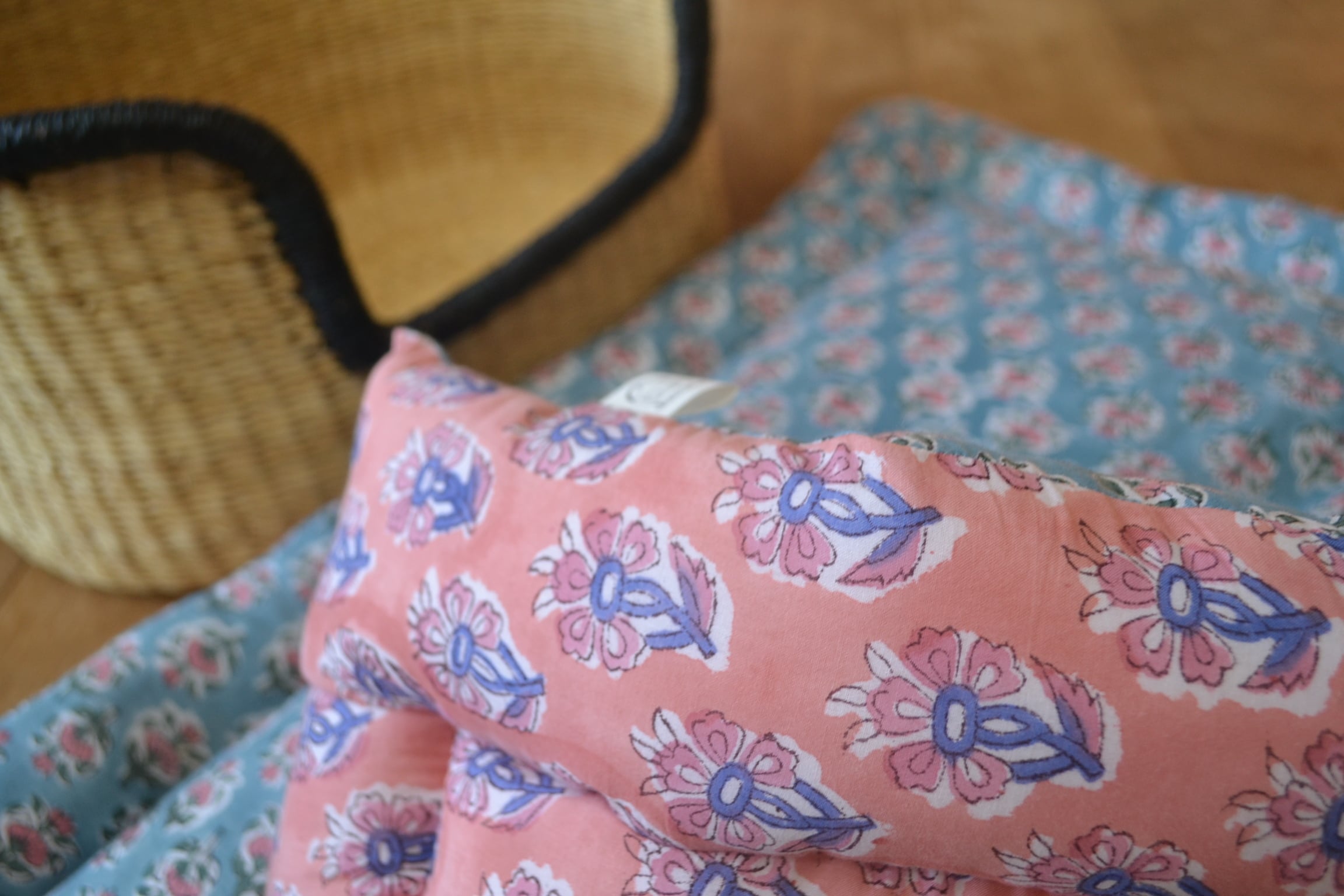 インドのブロックプリントは木版画を押し付けて職人がひとつひとつ模様を描いている為、色のズレや濃淡、染料のハネなどがございます。