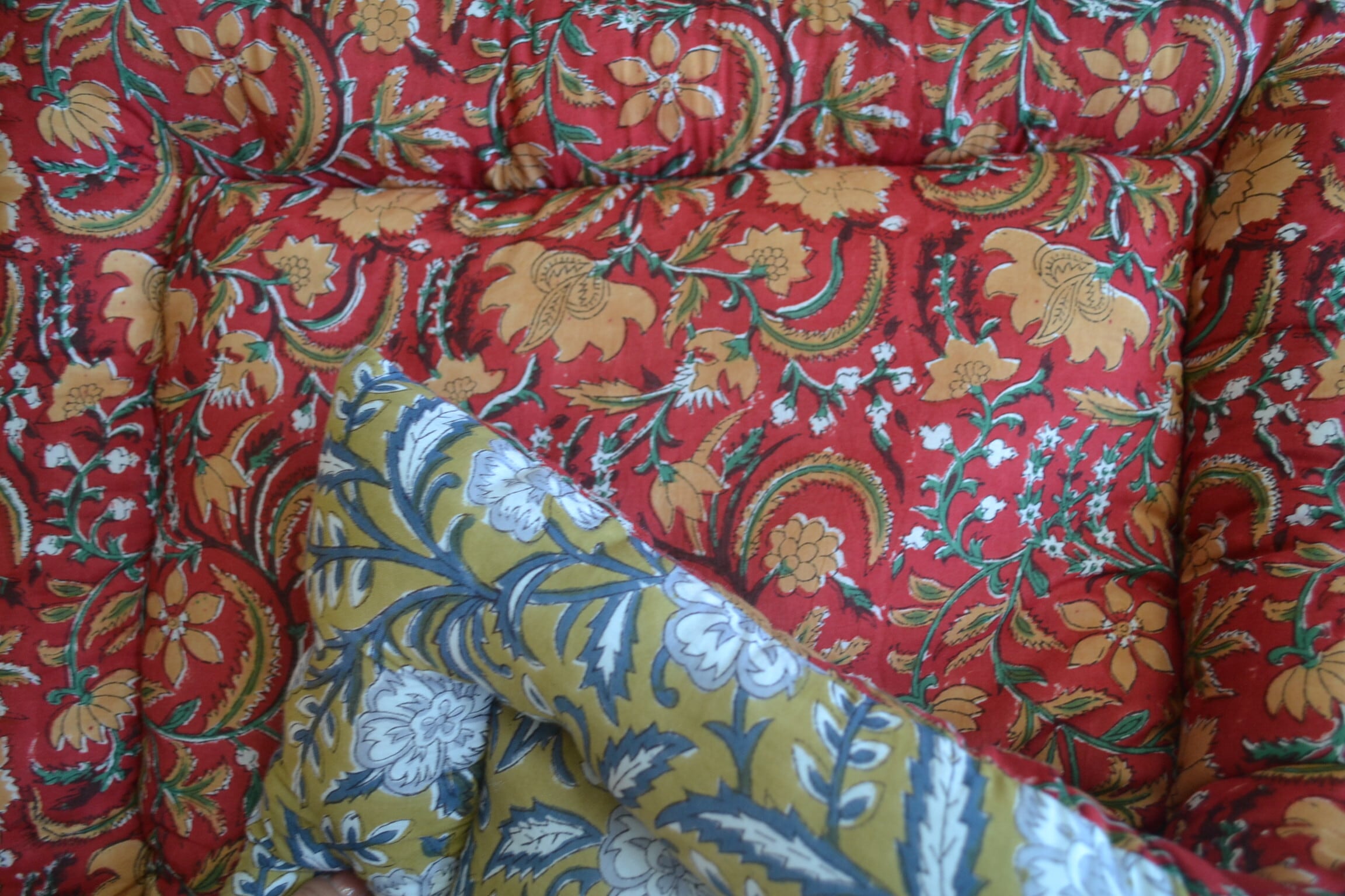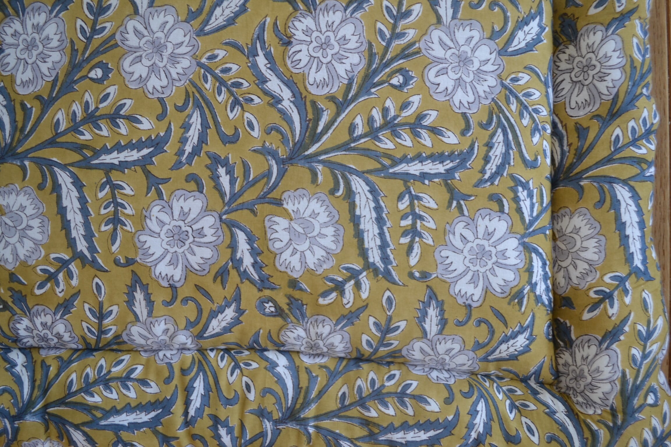 インドのブロックプリントは木版画を押し付けて職人がひとつひとつ模様を描いている為、色のズレや濃淡、染料のハネなどがございます。