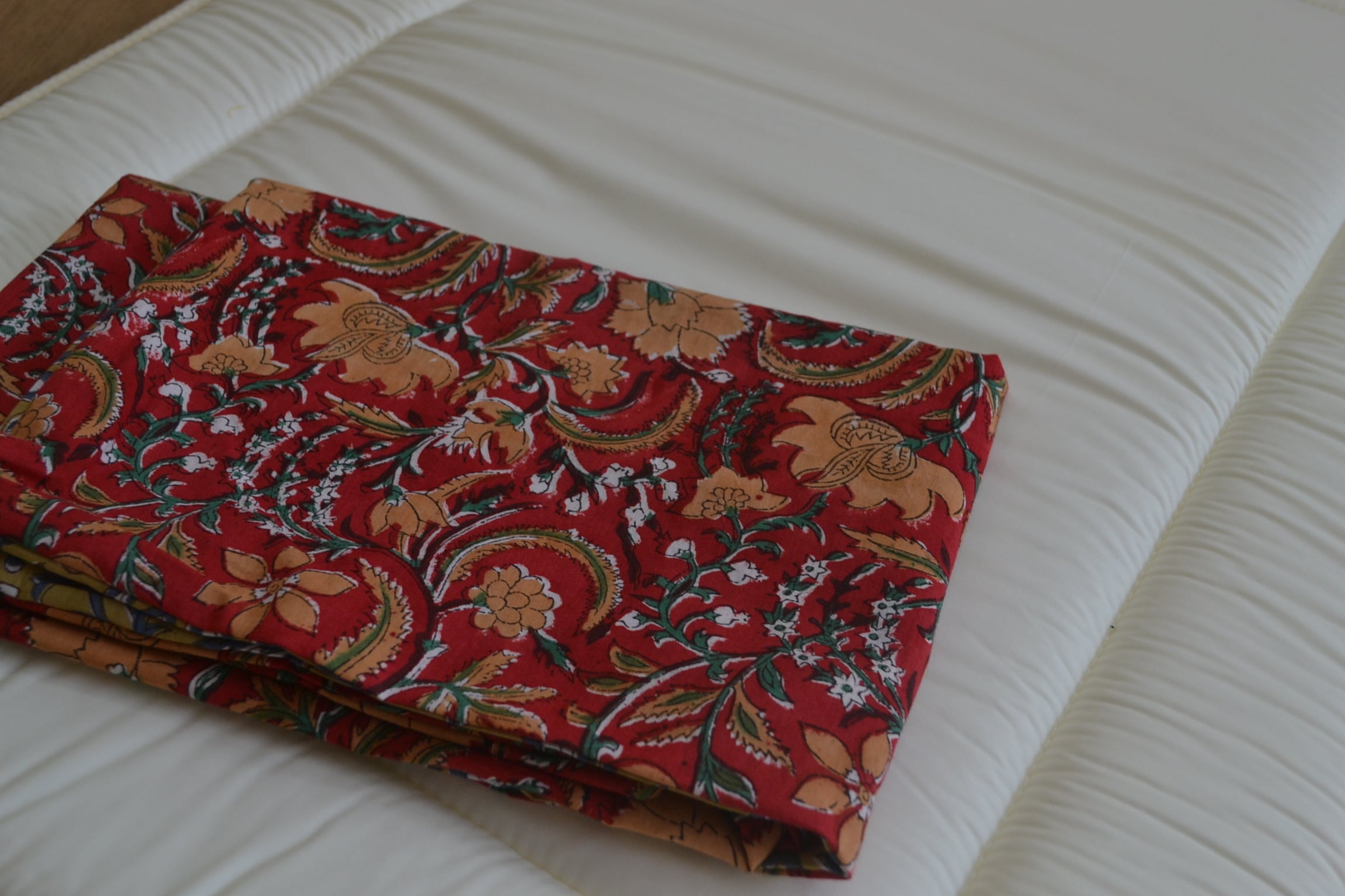 インドのブロックプリントは木版画を押し付けて職人がひとつひとつ模様を描いている為、色のズレや濃淡、染料のハネなどがございます。