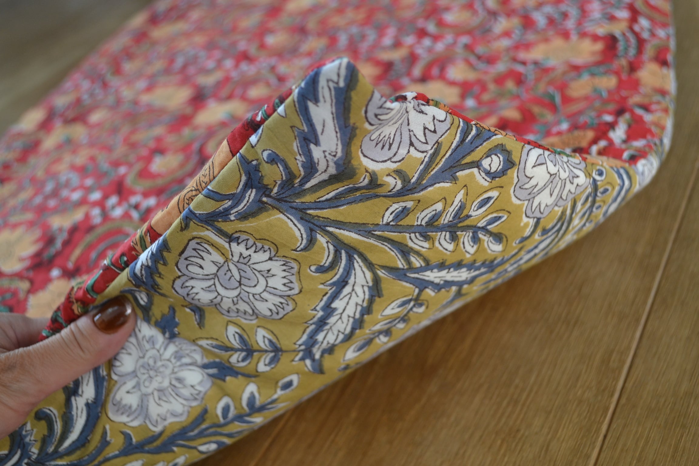 ブロックプリント生地はインドからお取寄せ、マットは国内で一つ一つ丁寧に製作。主も裁断、縫製を行っており、心を込めて制作しています。