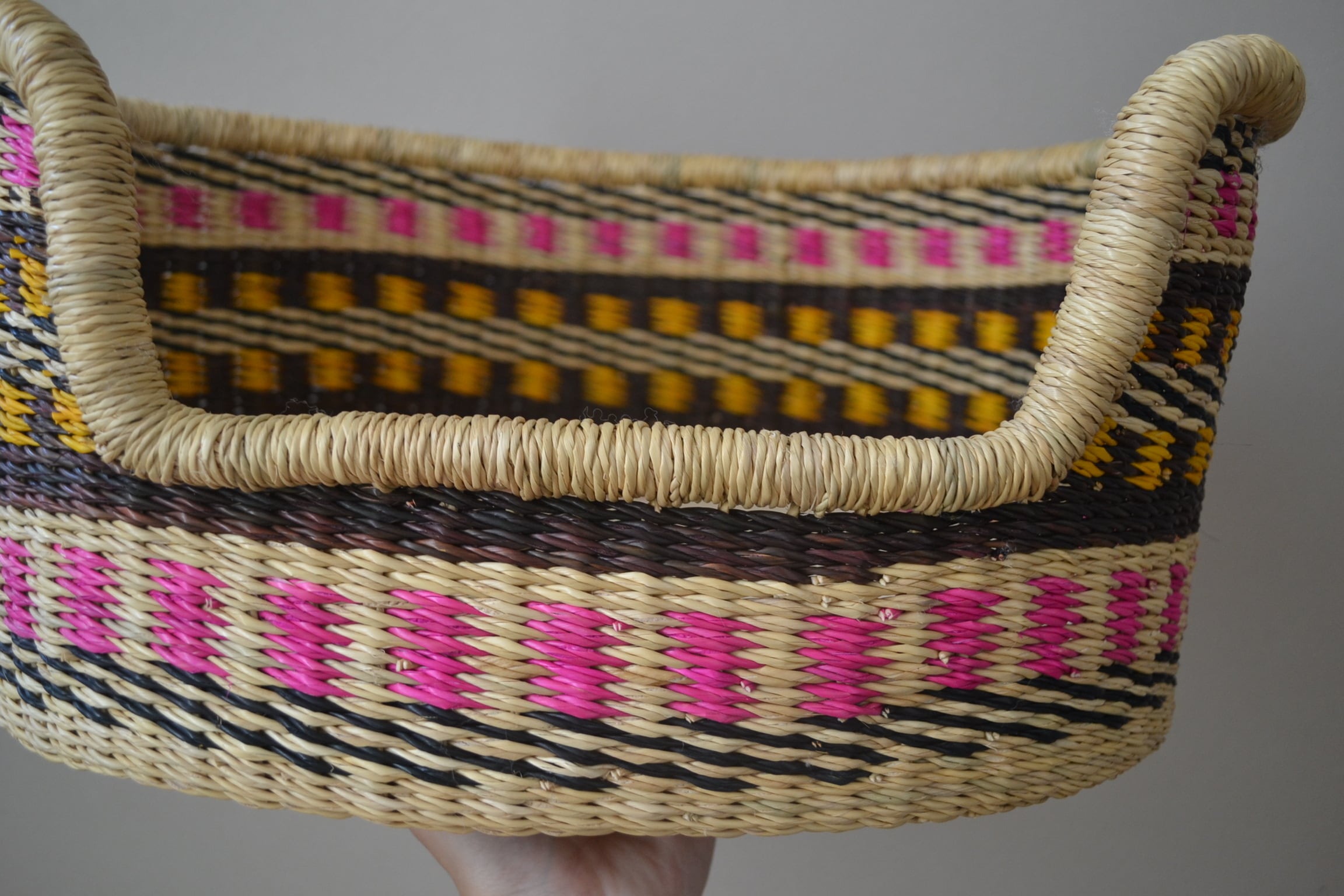 ボルガバスケットは、ガーナ北部で育む特産のボルガグラスを使用しています。草木の汁で染め上げられた鮮やかな色彩は、手作りならではの味わいを感じさせます。職人の手仕事で編まれた優雅なフォルムは、インテリアとしても映え、どんな空間にもマッチします!