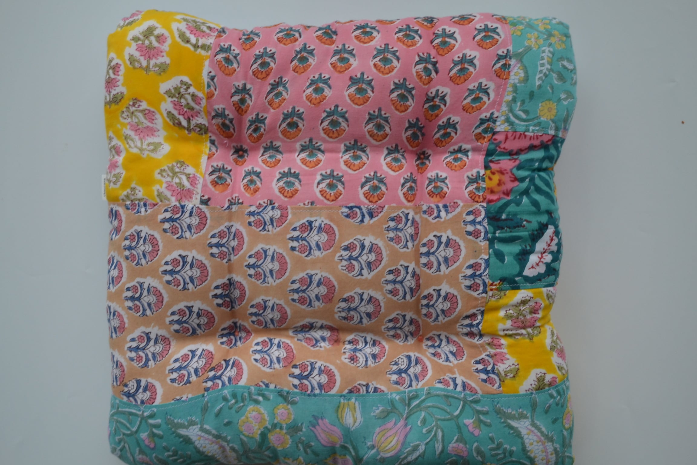ブロックプリント生地はインドからお取寄せ、マットは国内で一つ一つ丁寧に製作。