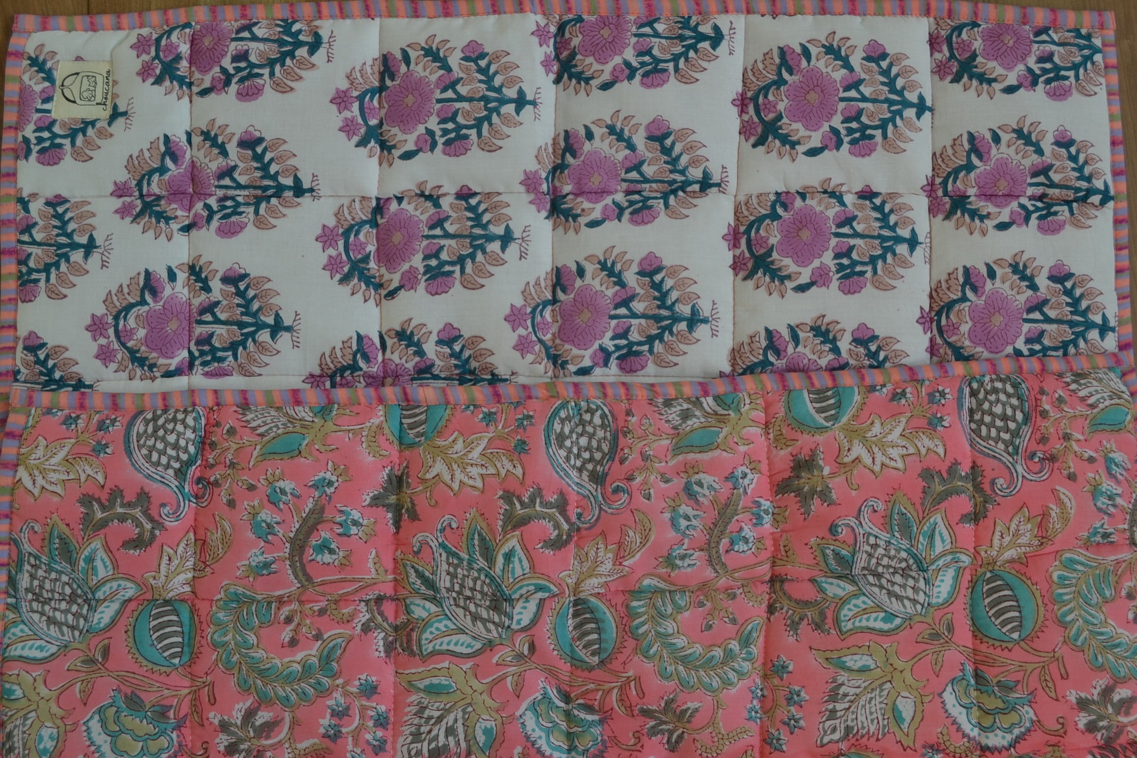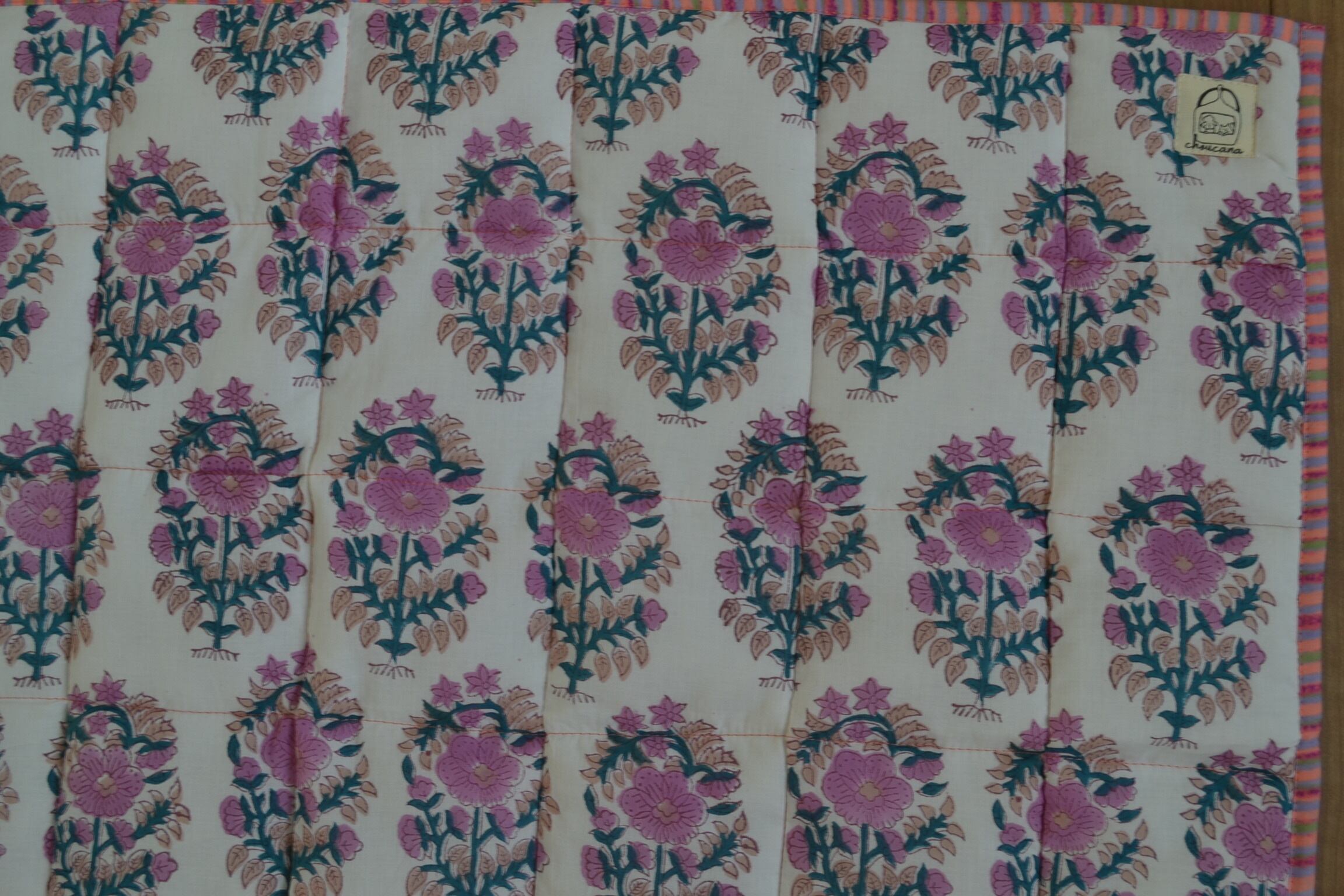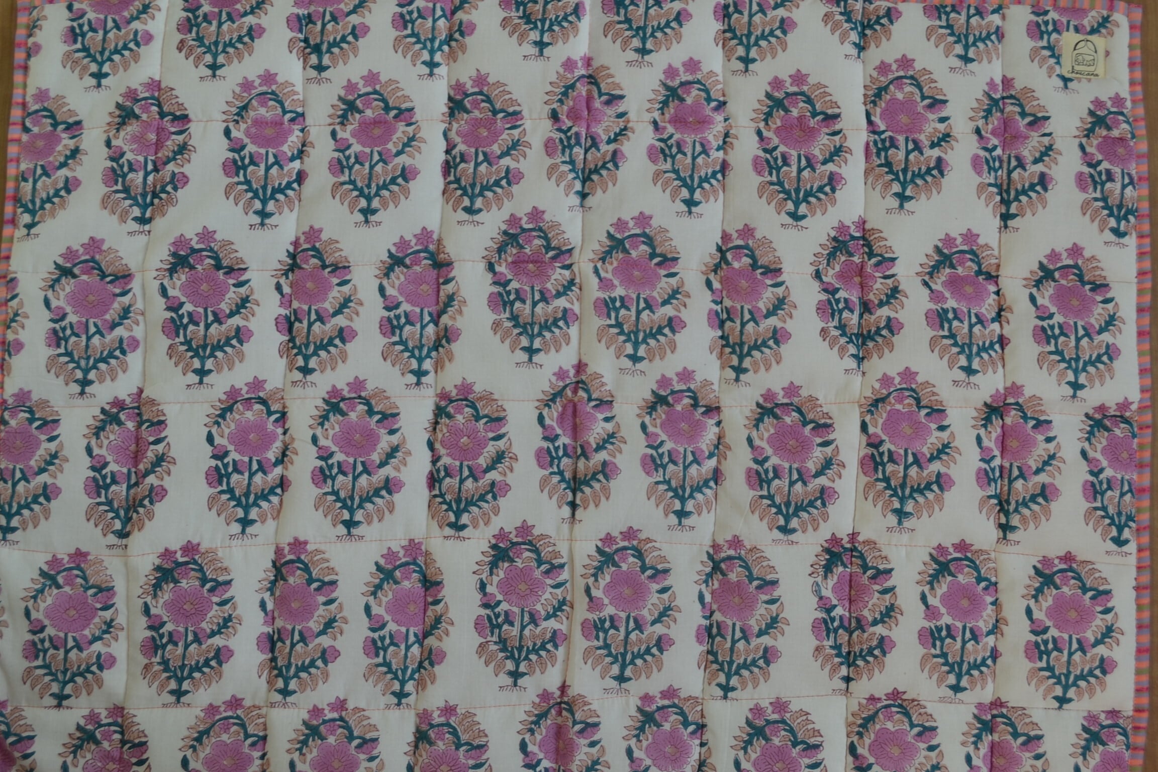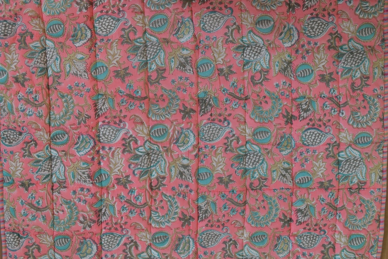 インドのブロックプリントは木版画を押し付けて職人がひとつひとつ模様を描いている為、色のズレや濃淡、染料のハネなどがございます。又、キルトステッチの糸の飛び出しがある場合がございますのでご了承くださいませ。