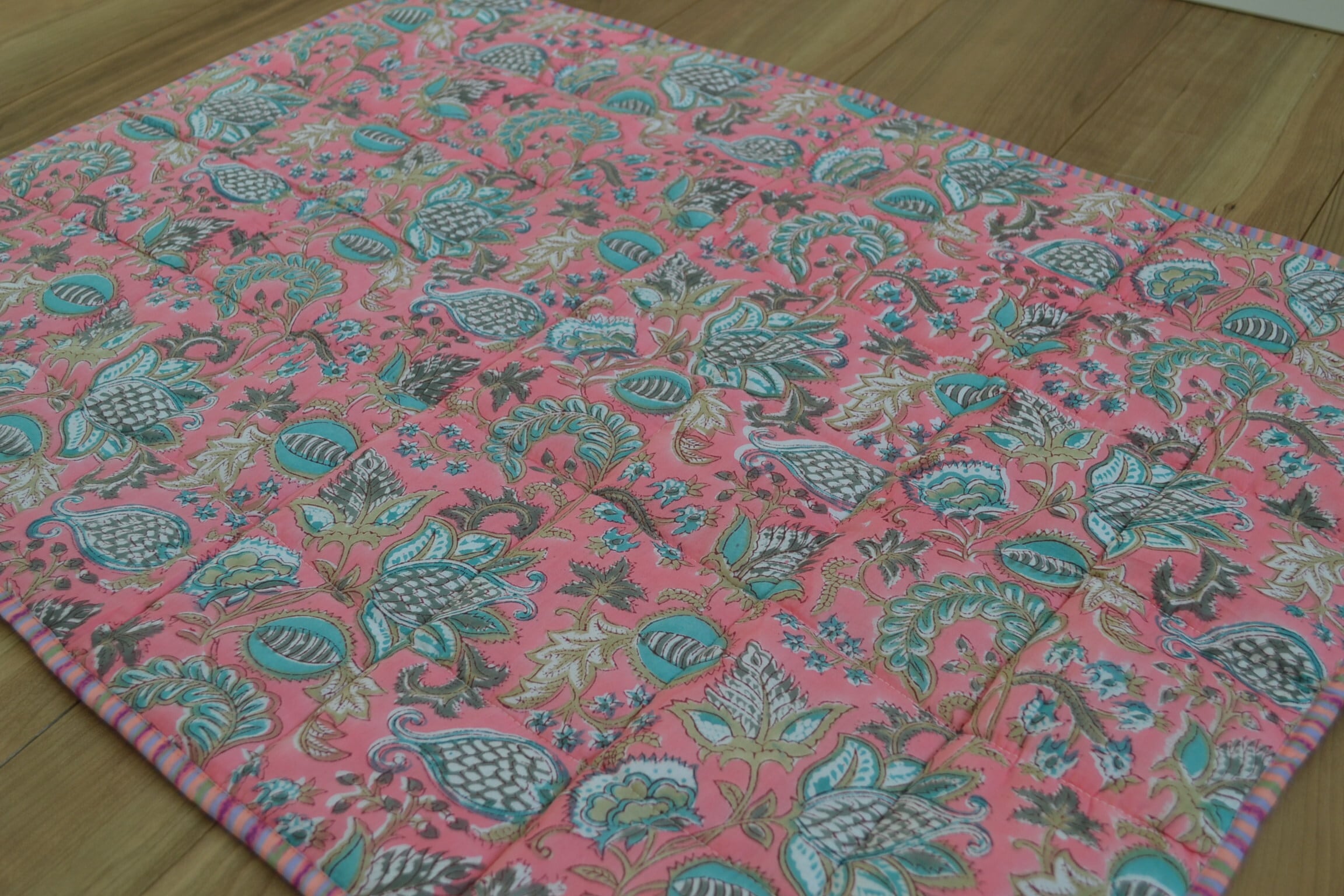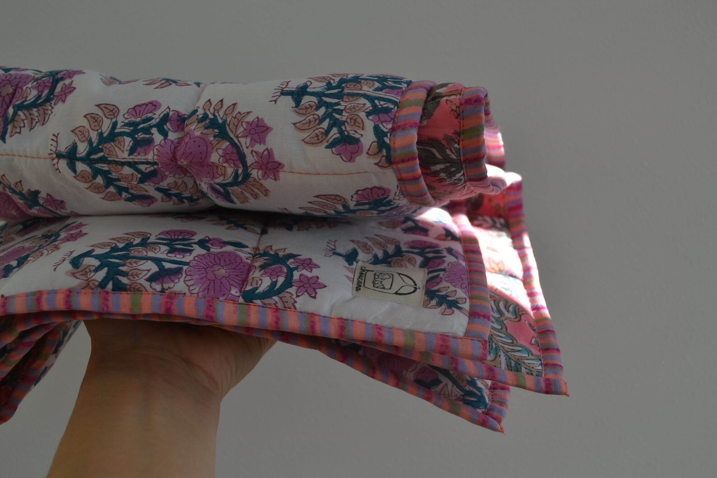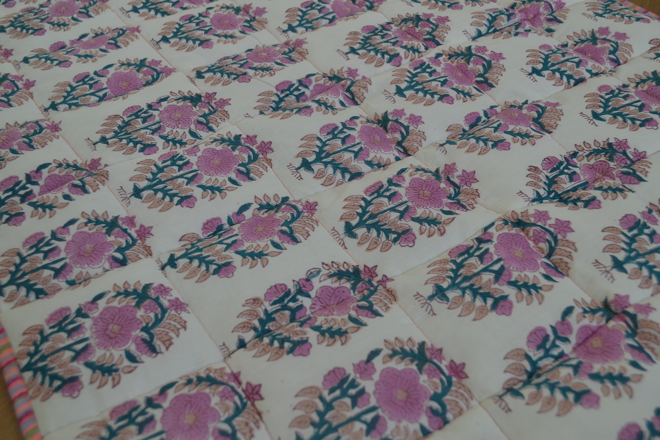インドのブロックプリントは木版画を押し付けて職人がひとつひとつ模様を描いている為、色のズレや濃淡、染料のハネなどがございます。又、キルトステッチの糸の飛び出しがある場合がございますのでご了承くださいませ。