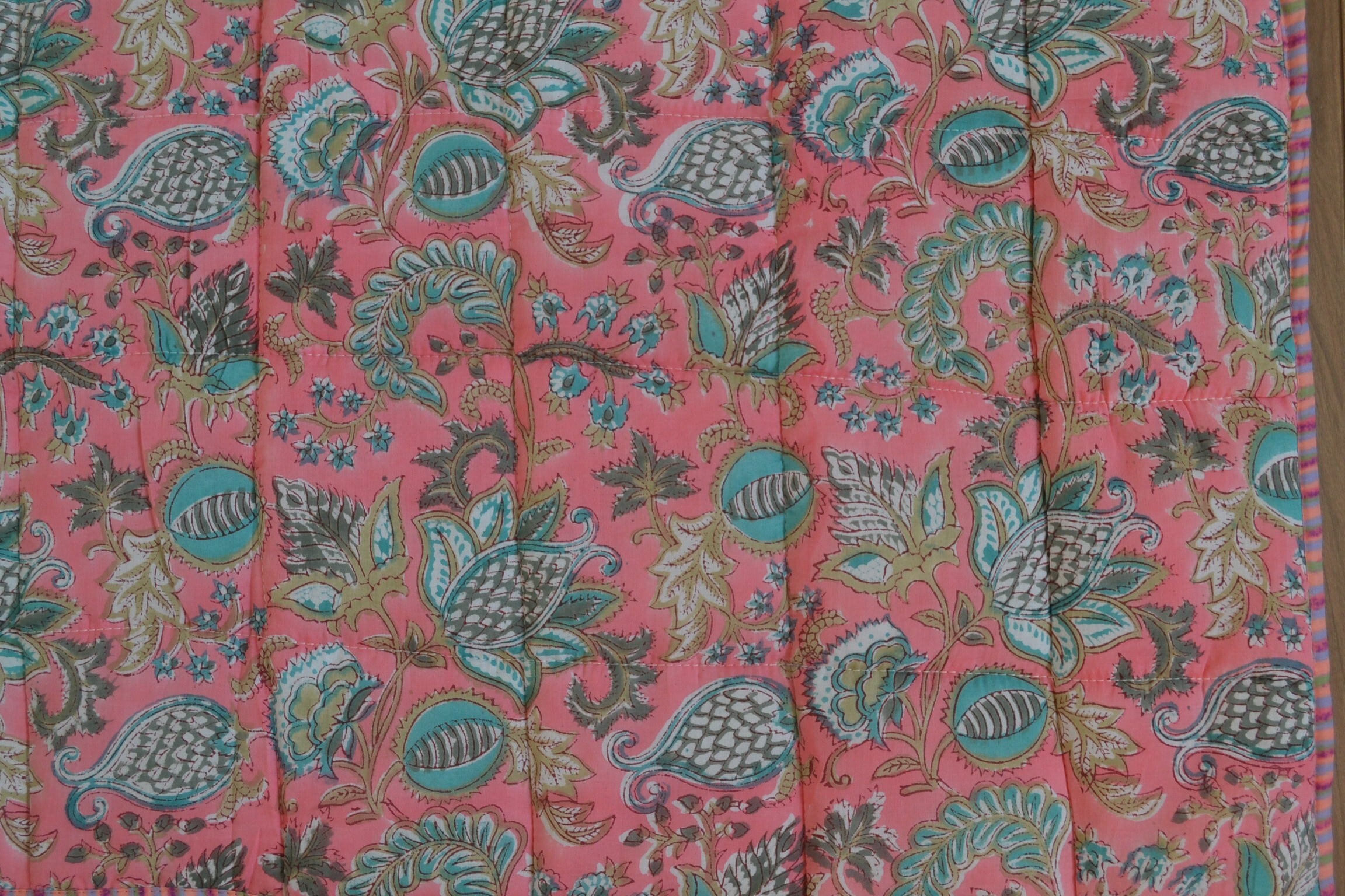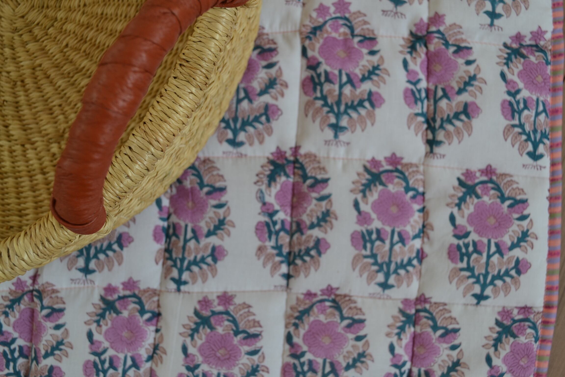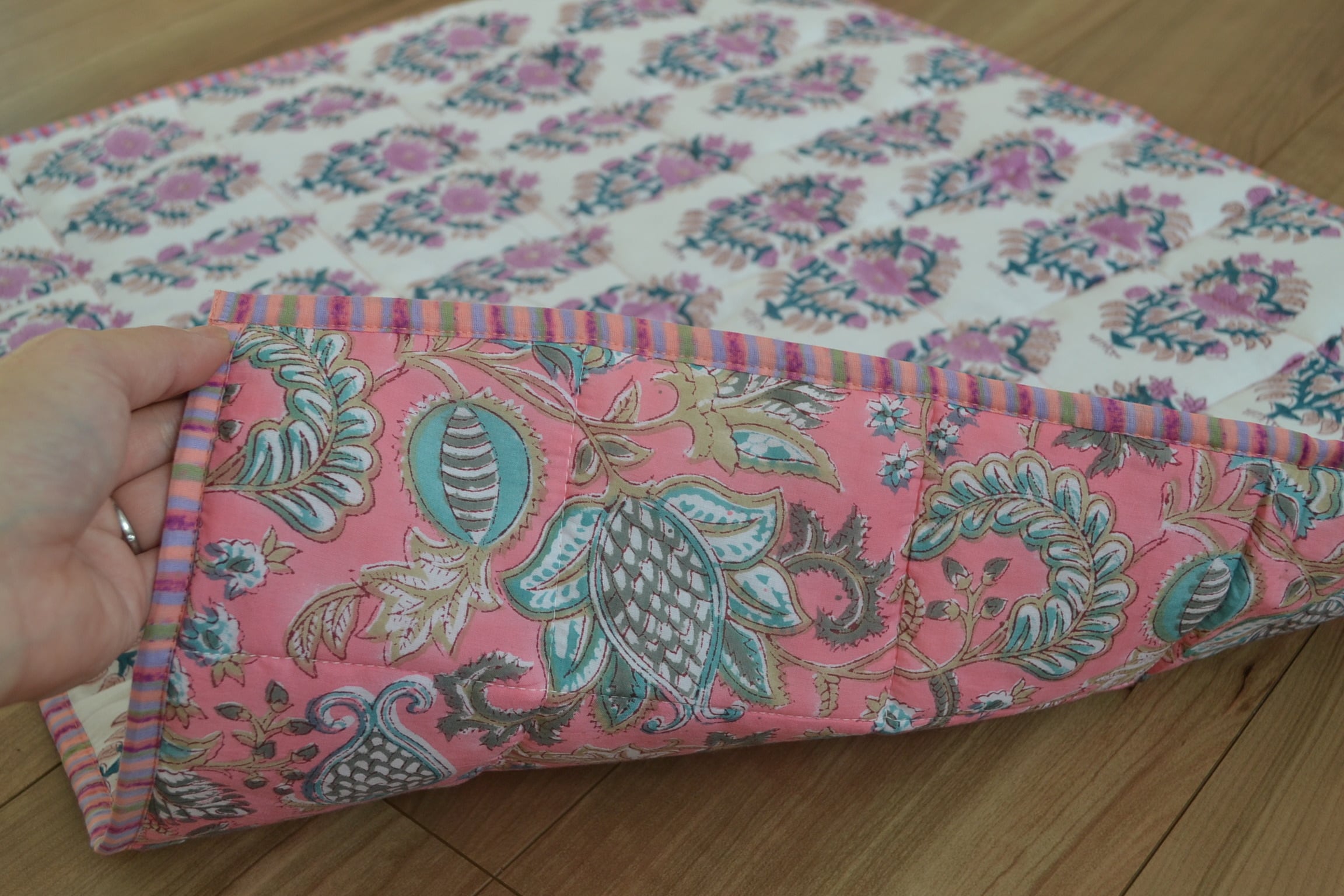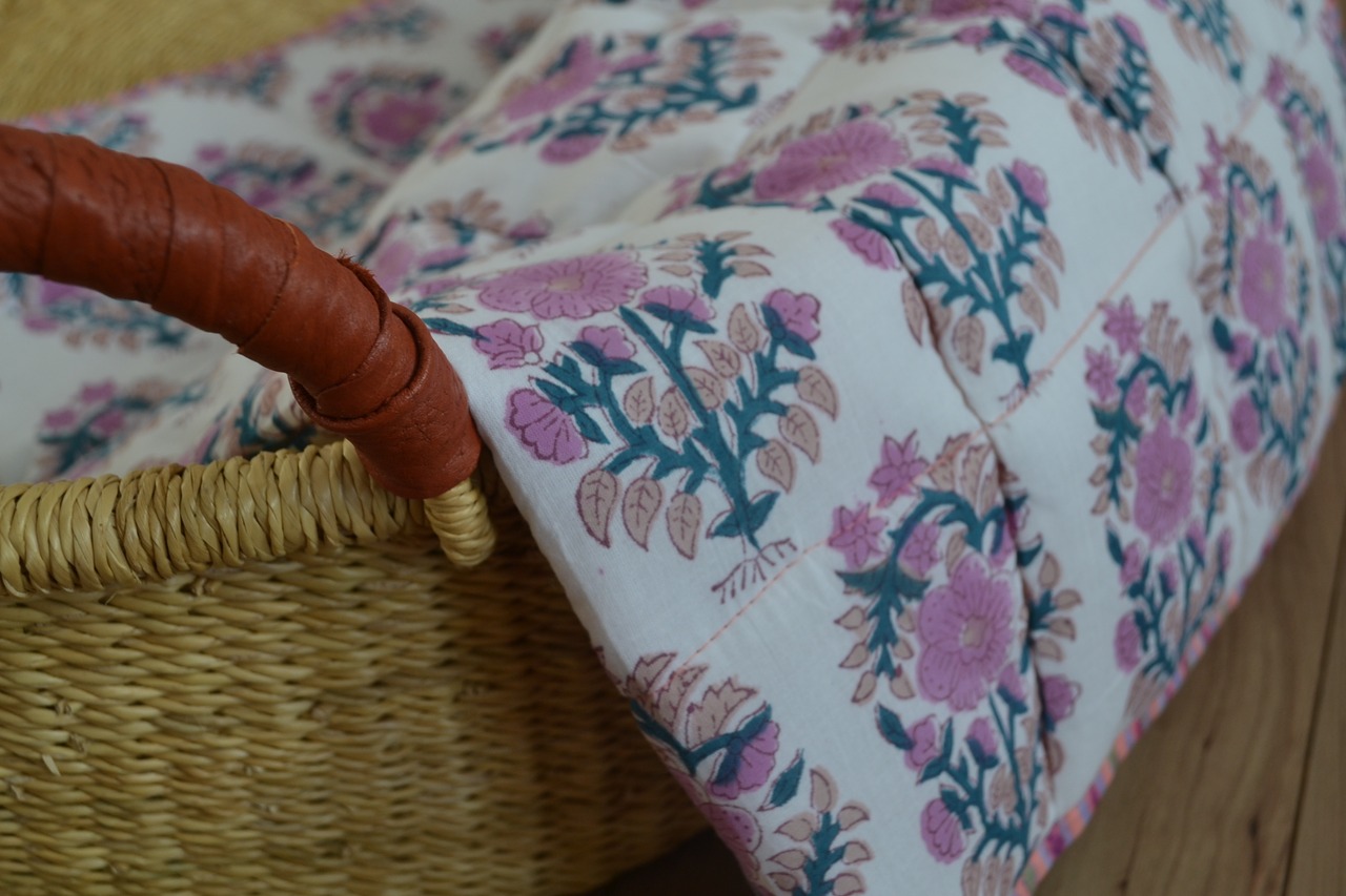 インドのブロックプリントは木版画を押し付けて職人がひとつひとつ模様を描いている為、色のズレや濃淡、染料のハネなどがございます。又、キルトステッチの糸の飛び出しがある場合がございますのでご了承くださいませ。