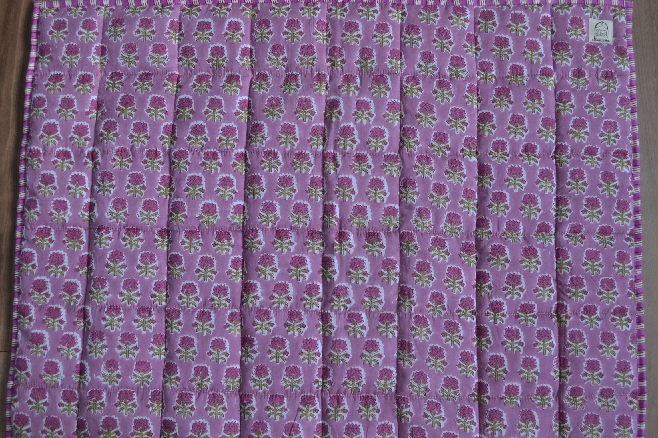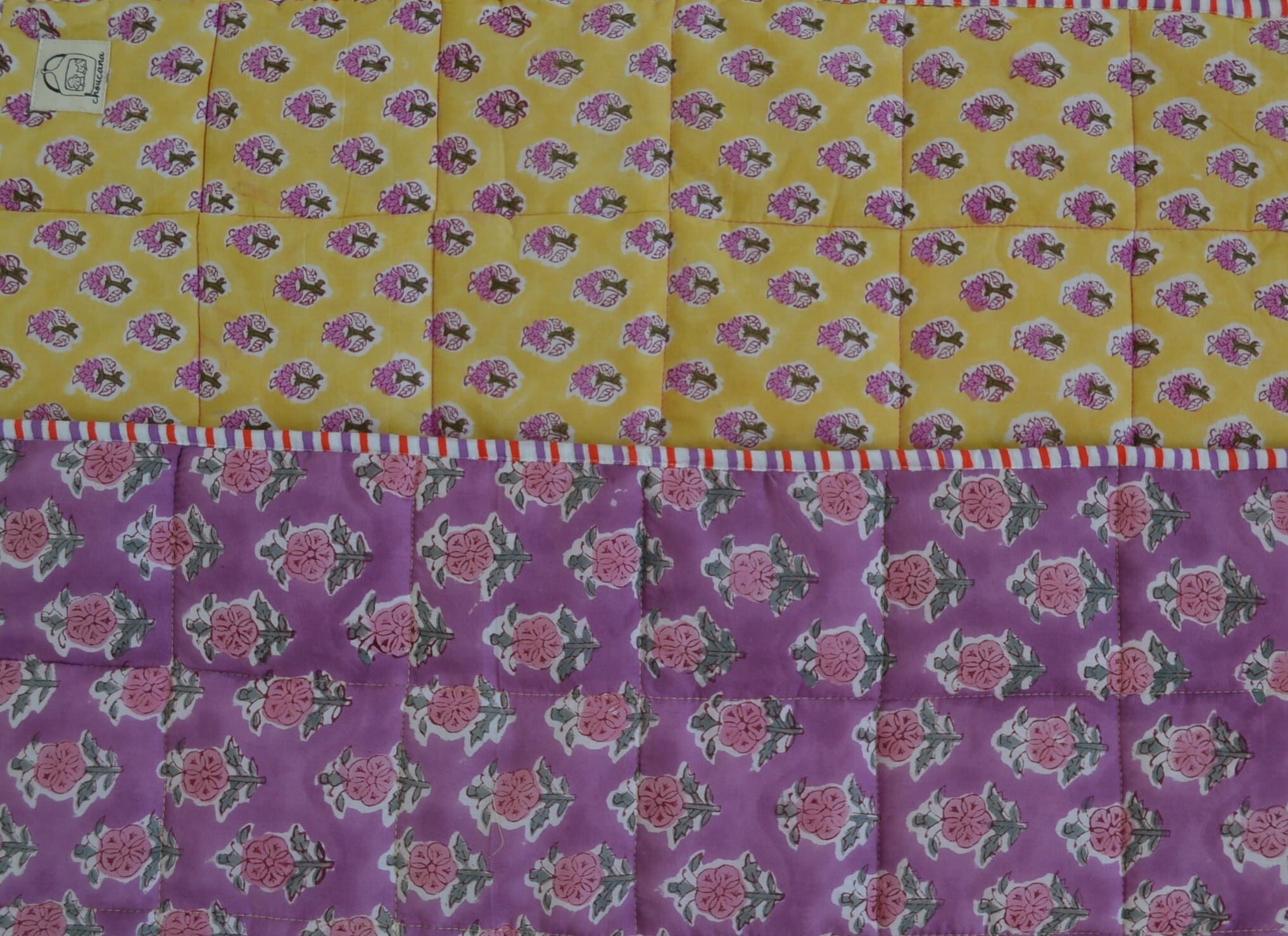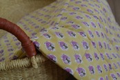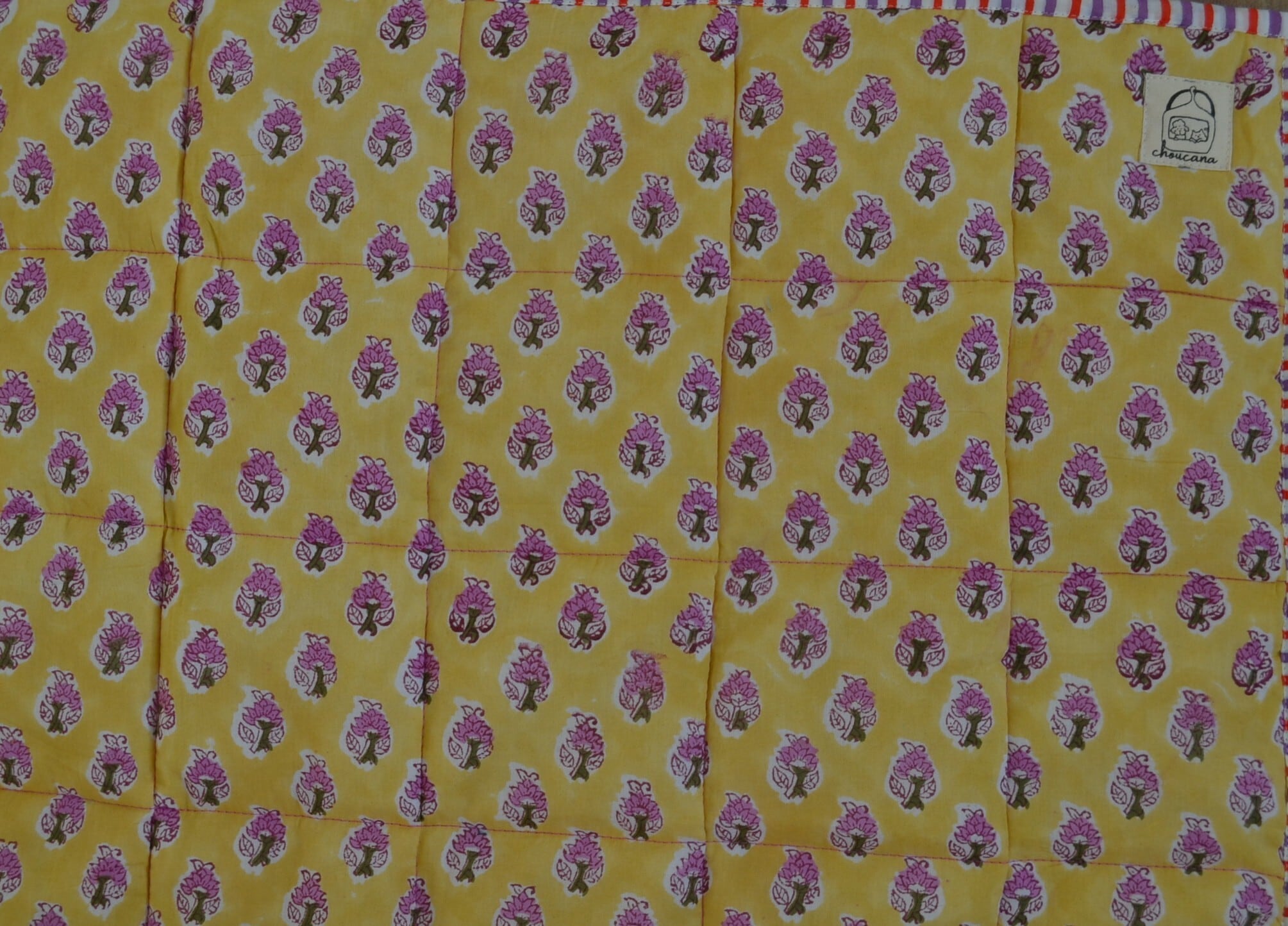 インドのブロックプリントは木版画を押し付けて職人がひとつひとつ模様を描いている為、色のズレや濃淡、染料のハネなどがございます。又、キルトステッチの糸の飛び出しがある場合がございますのでご了承くださいませ。