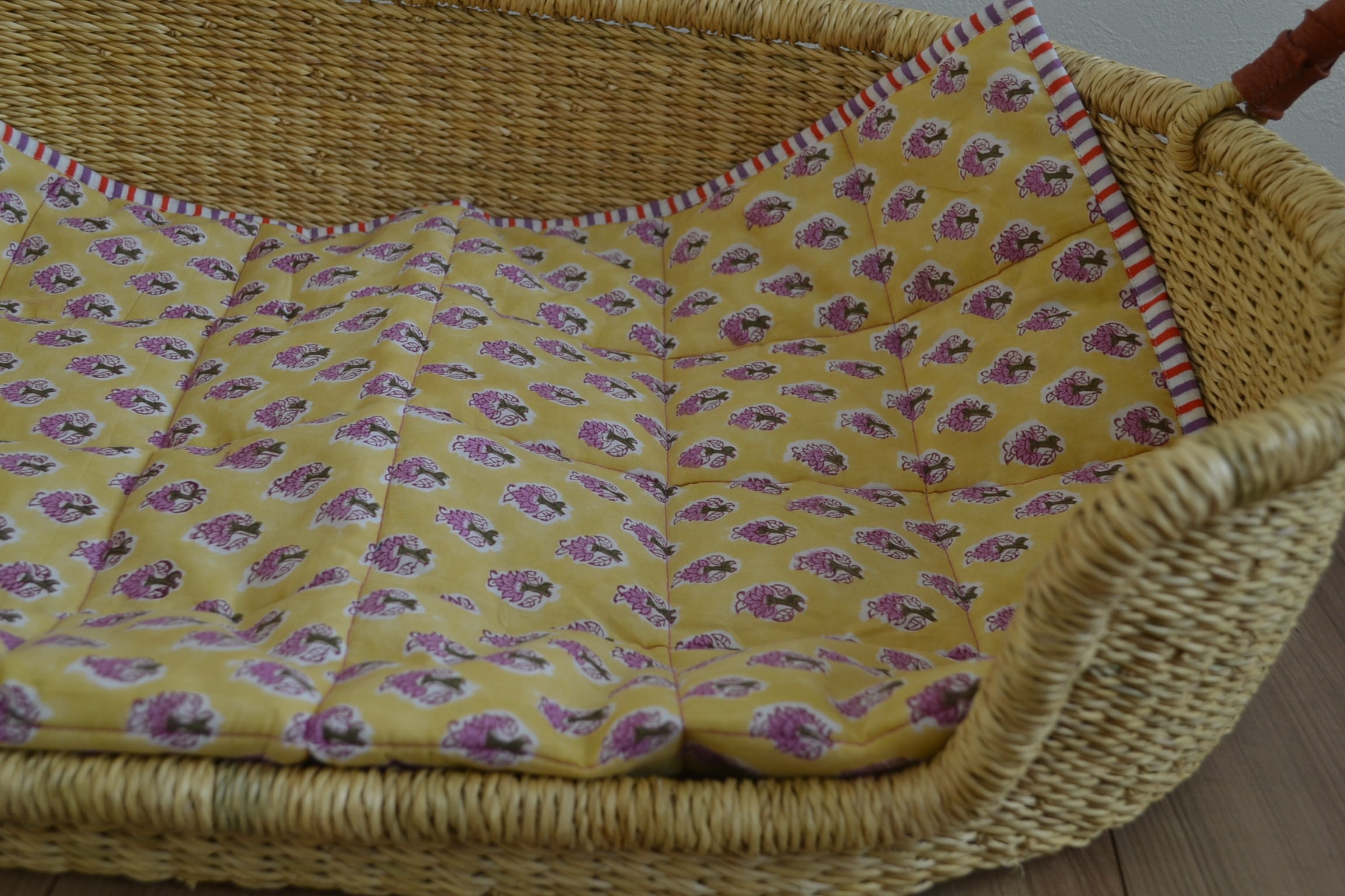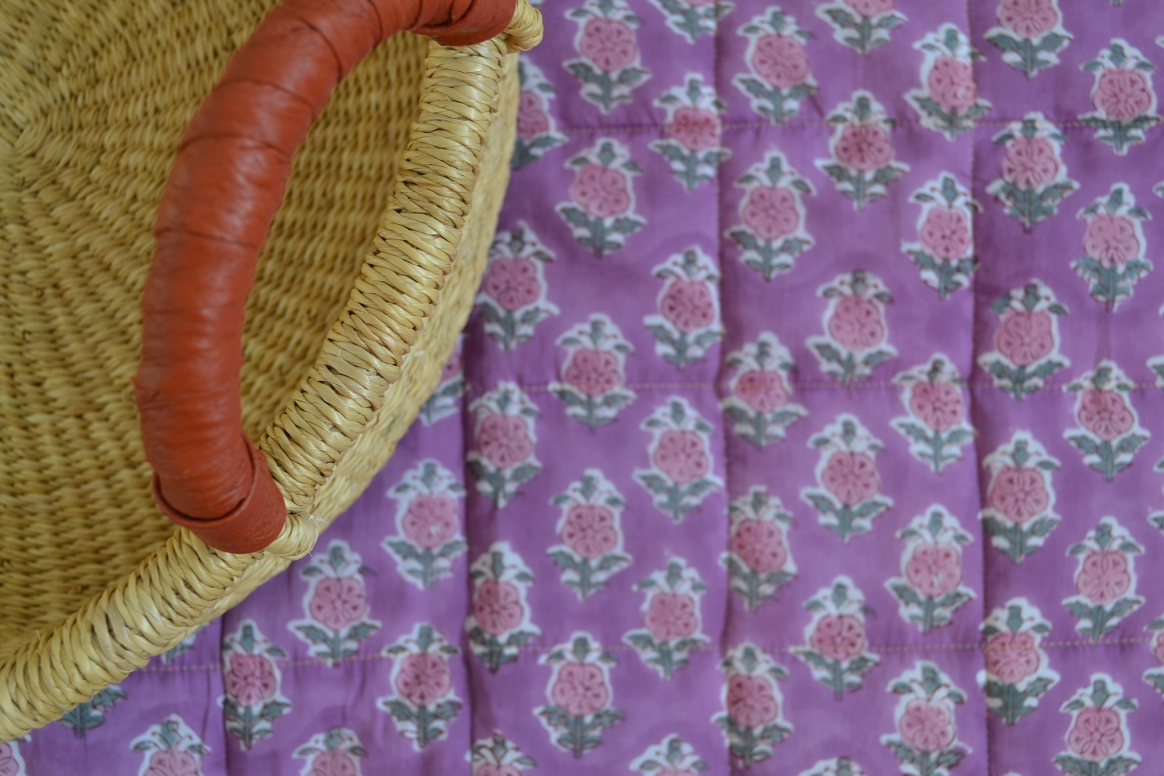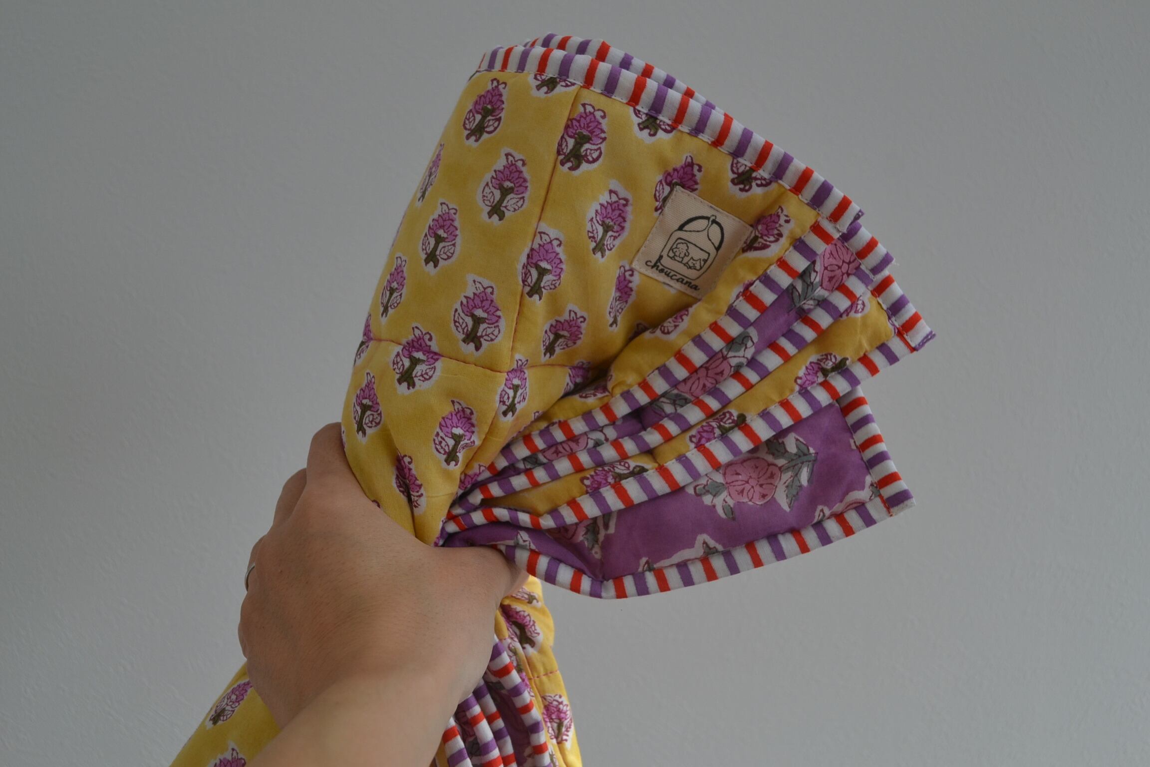 インドのブロックプリントは木版画を押し付けて職人がひとつひとつ模様を描いている為、色のズレや濃淡、染料のハネなどがございます。又、キルトステッチの糸の飛び出しがある場合がございますのでご了承くださいませ。
