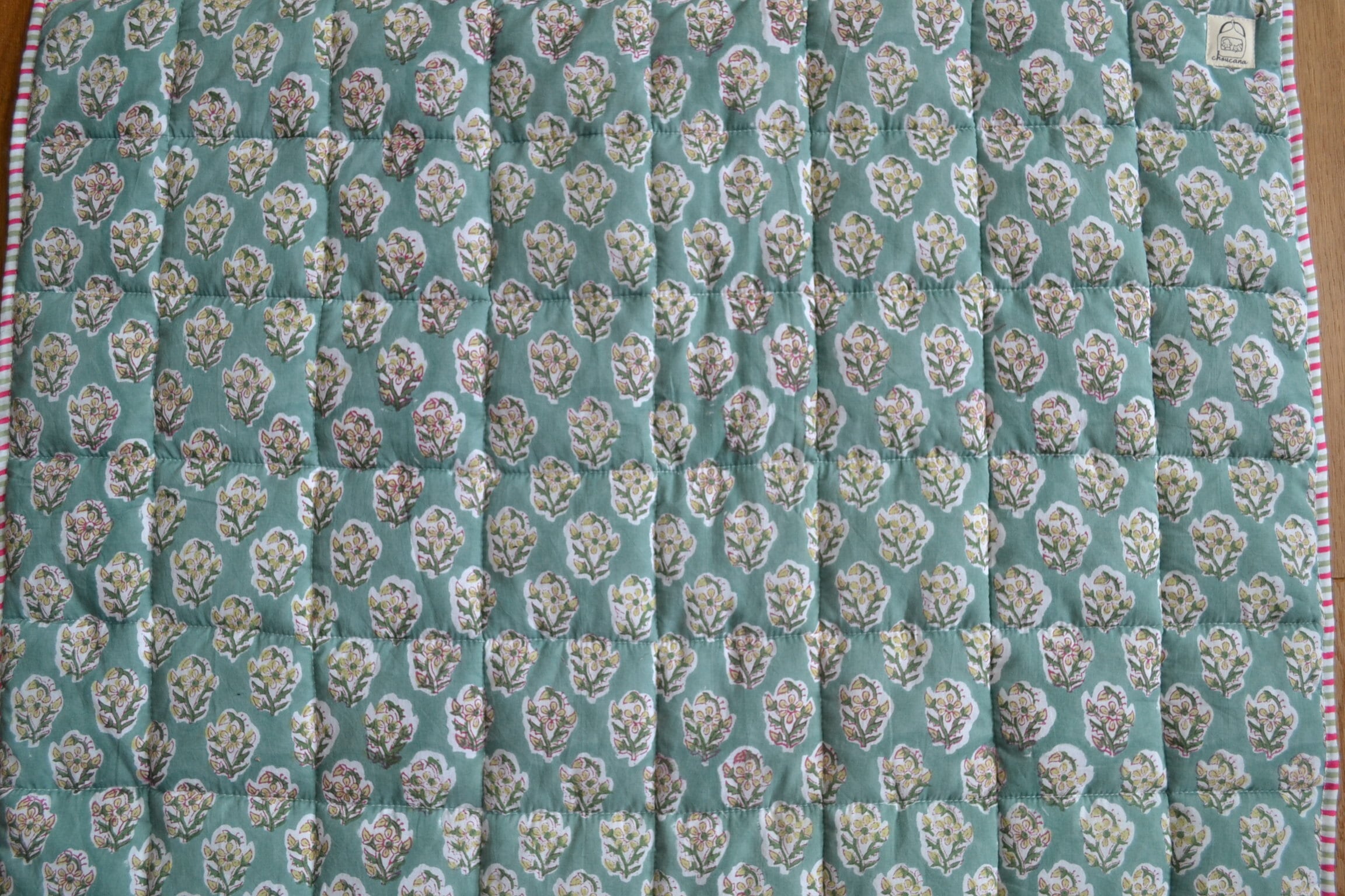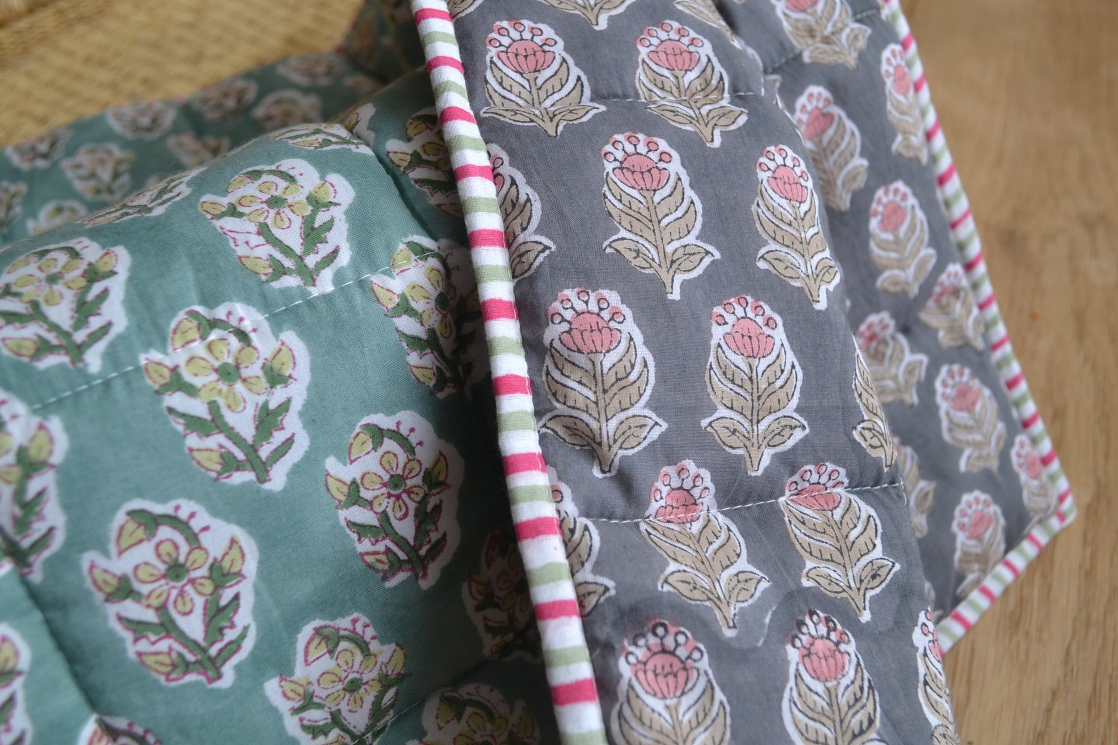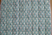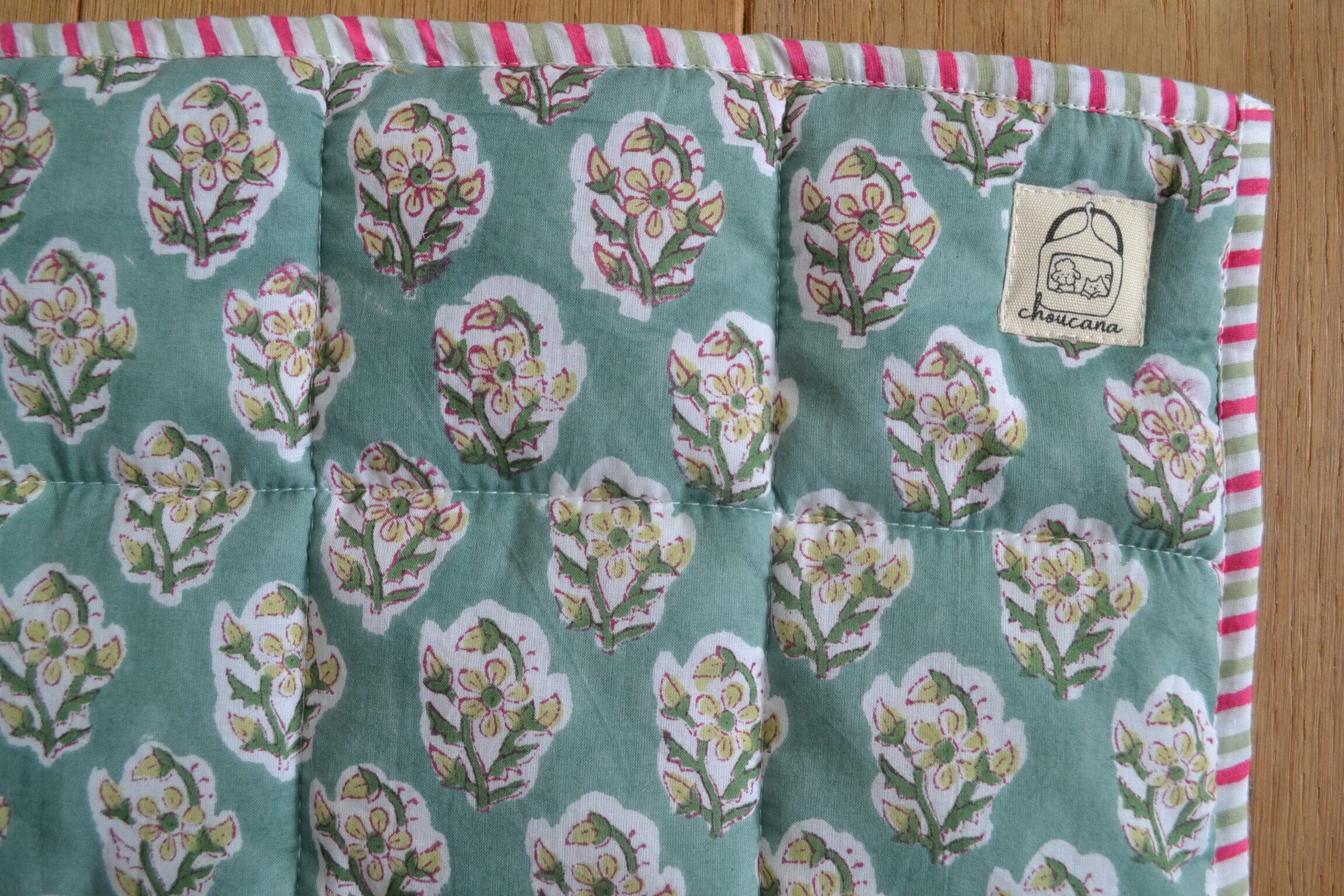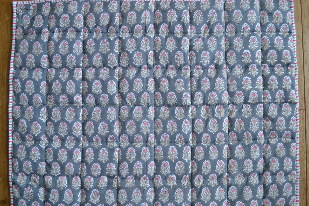 インドのブロックプリントは木版画を押し付けて職人がひとつひとつ模様を描いている為、色のズレや濃淡、染料のハネなどがございます。又、キルトステッチの糸の飛び出しがある場合がございますのでご了承くださいませ。