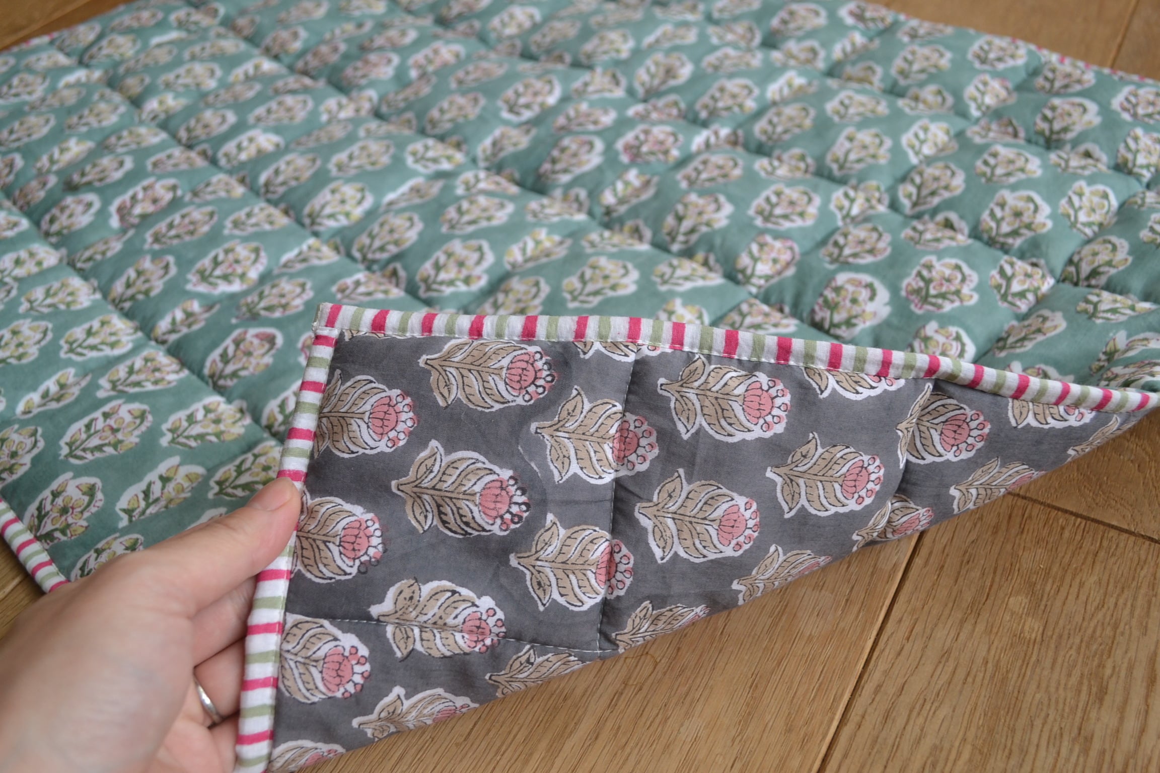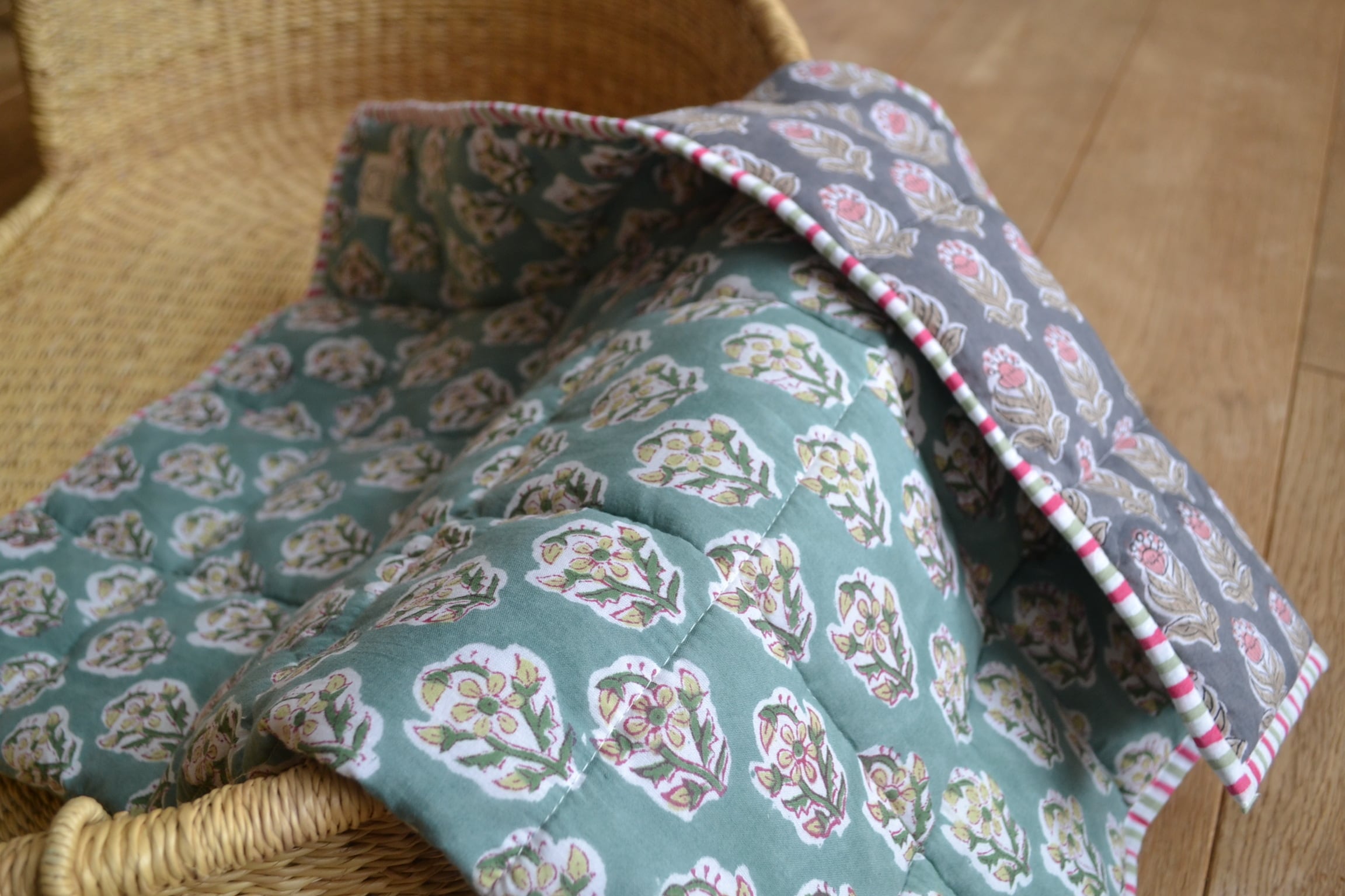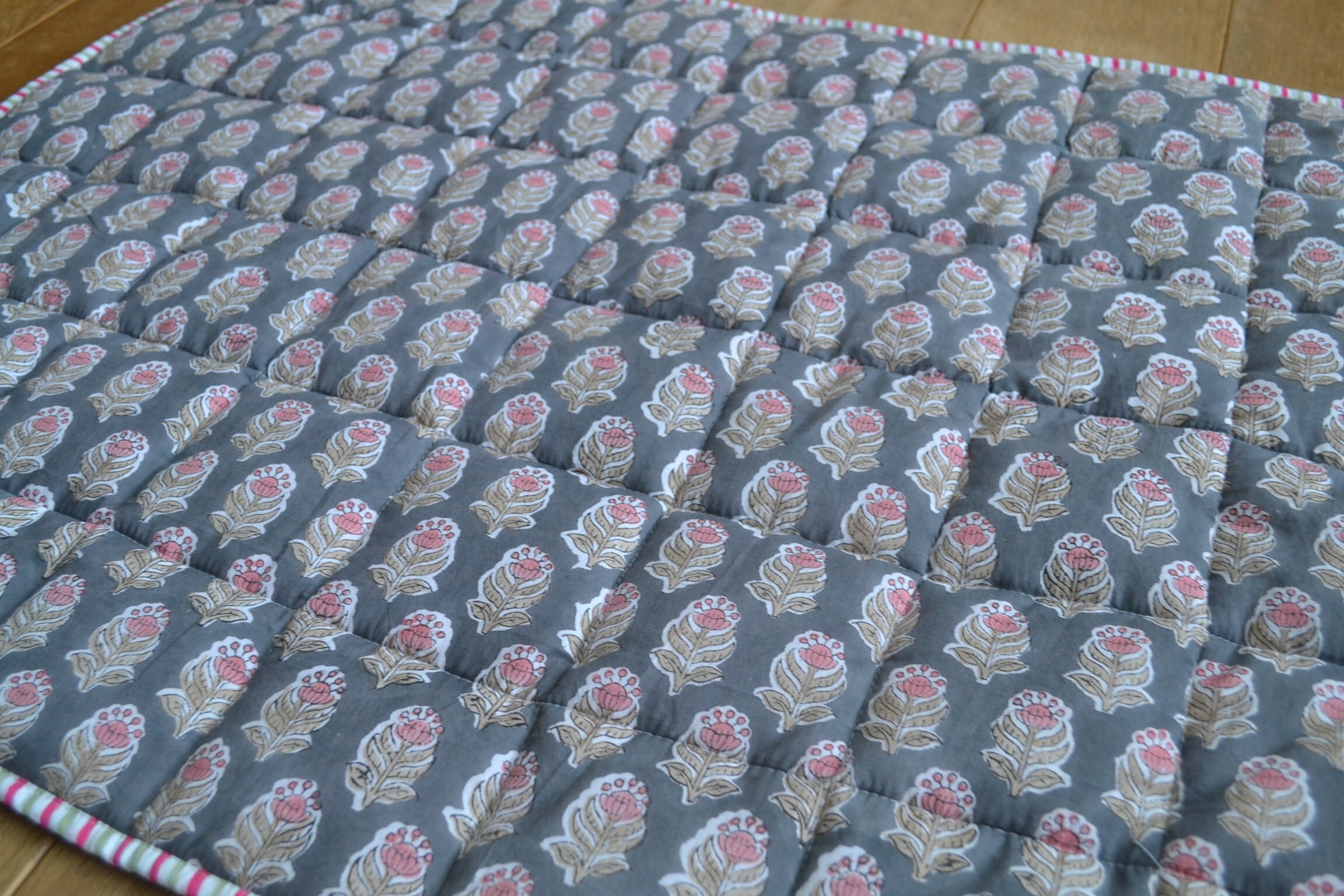 インドのブロックプリントは木版画を押し付けて職人がひとつひとつ模様を描いている為、色のズレや濃淡、染料のハネなどがございます。又、キルトステッチの糸の飛び出しがある場合がございますのでご了承くださいませ。