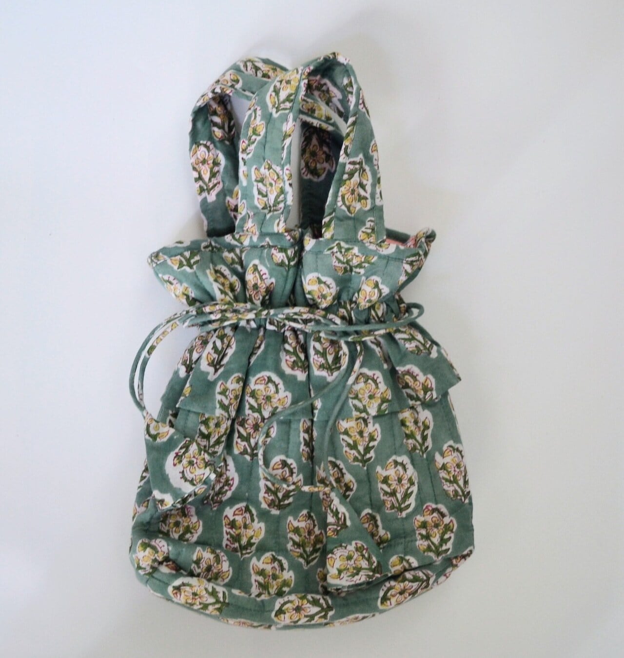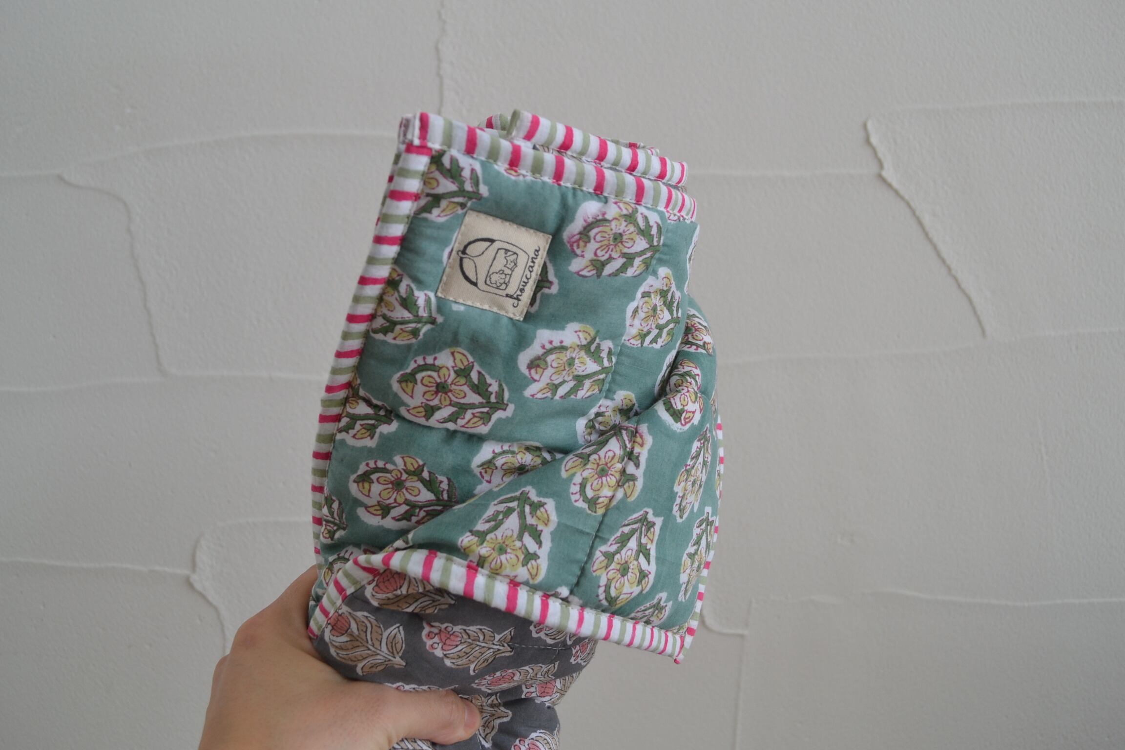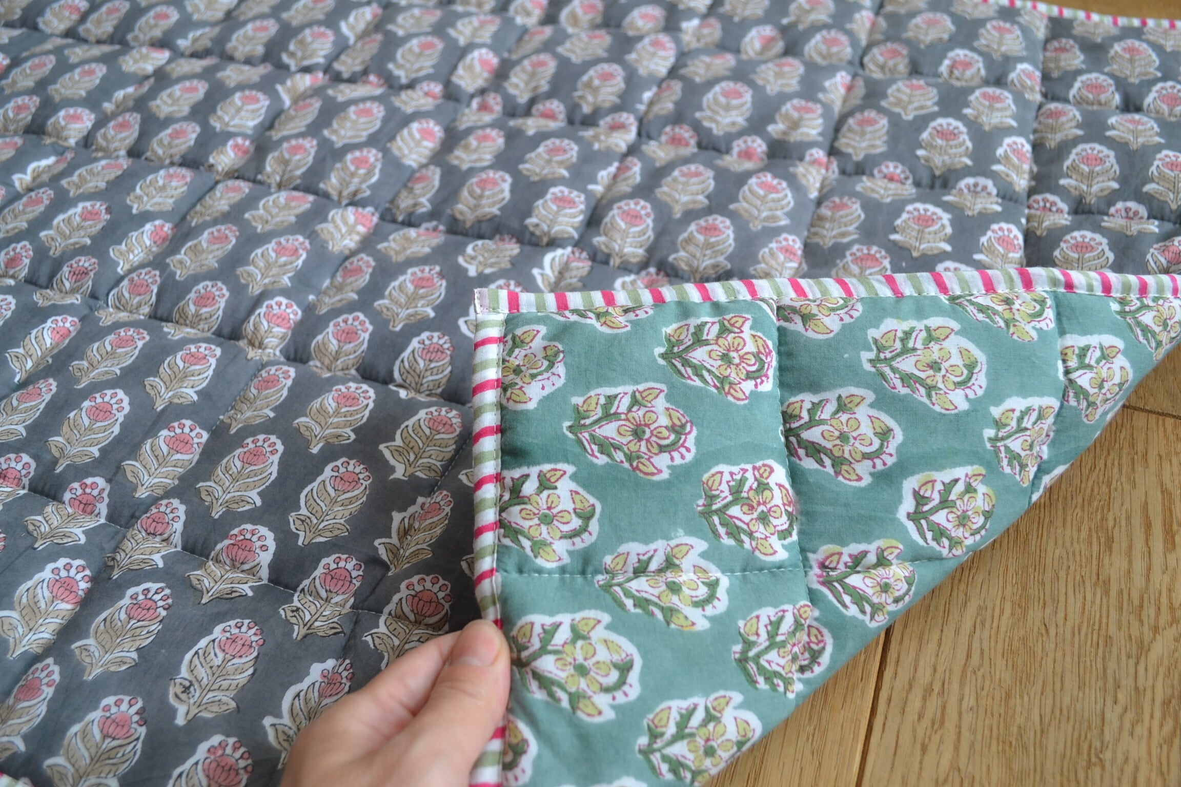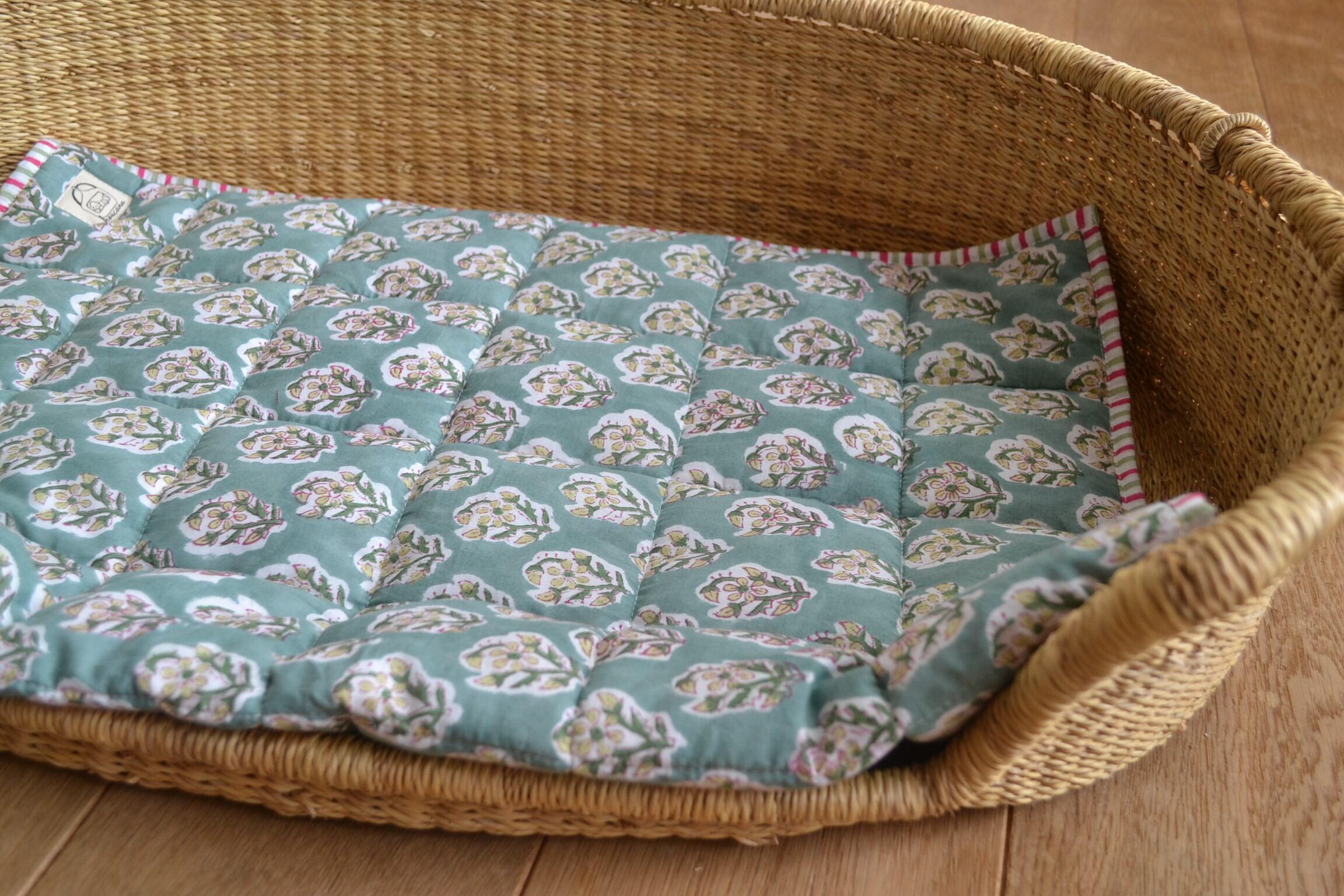 インドのブロックプリントは木版画を押し付けて職人がひとつひとつ模様を描いている為、色のズレや濃淡、染料のハネなどがございます。又、キルトステッチの糸の飛び出しがある場合がございますのでご了承くださいませ。
