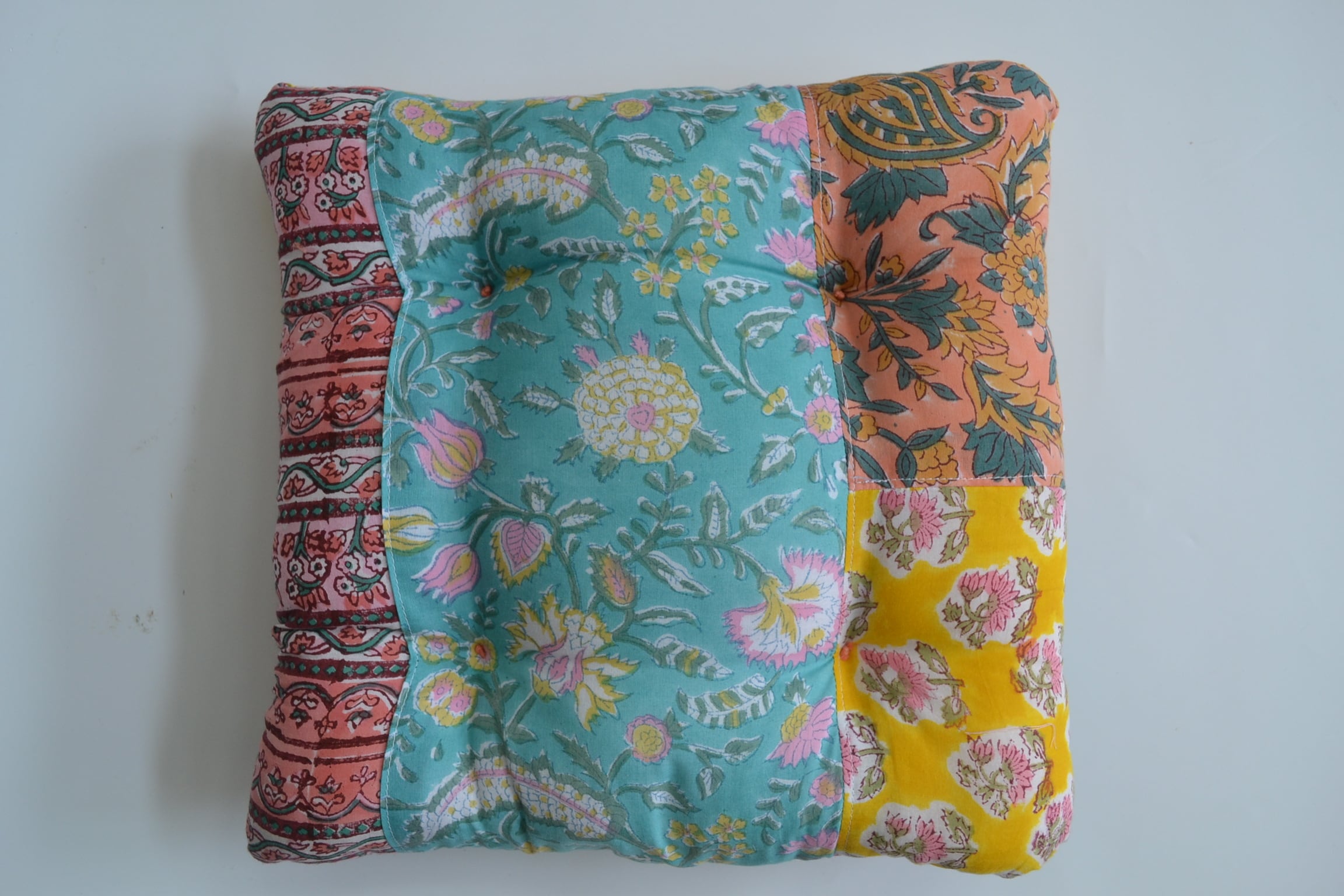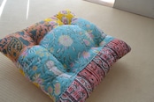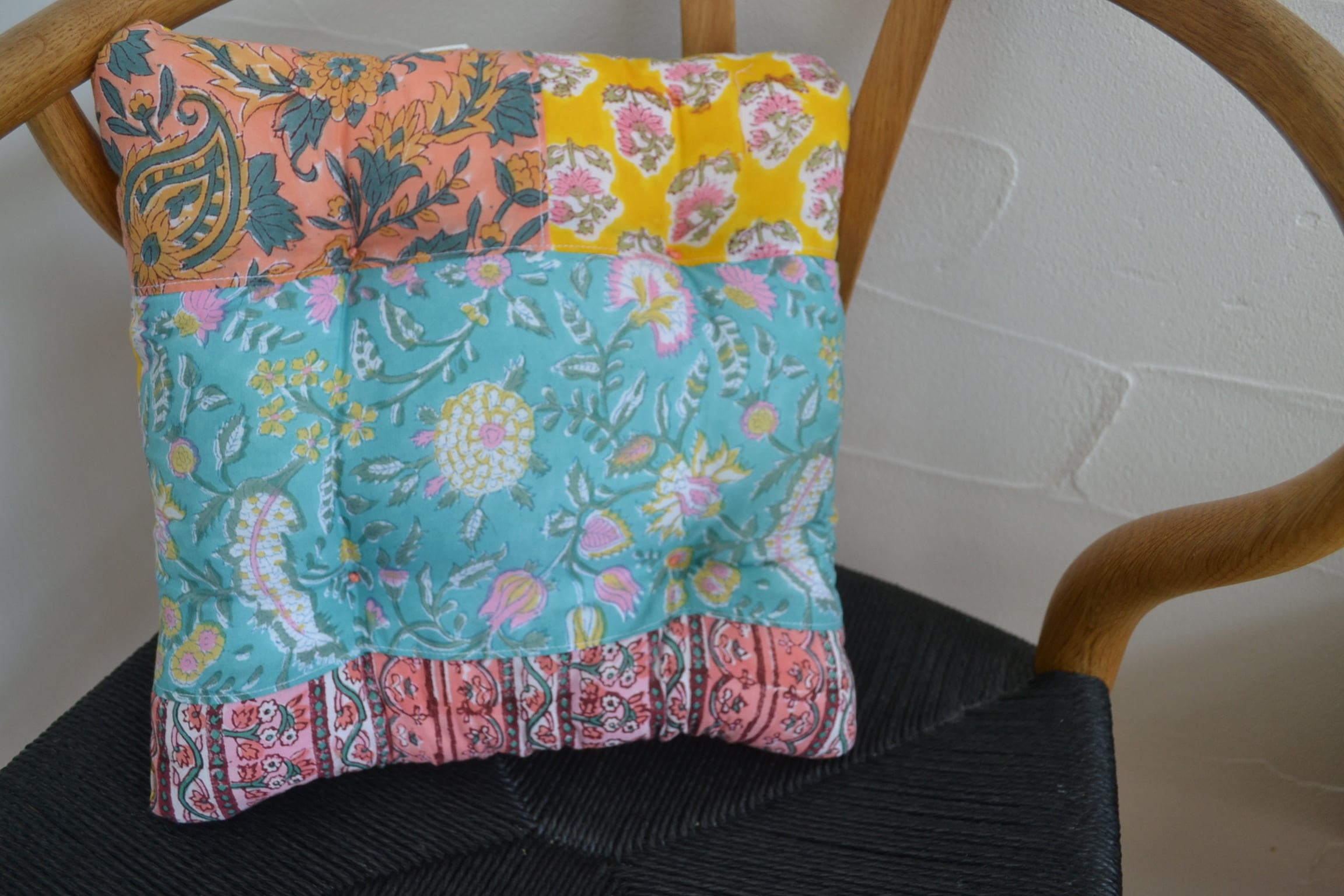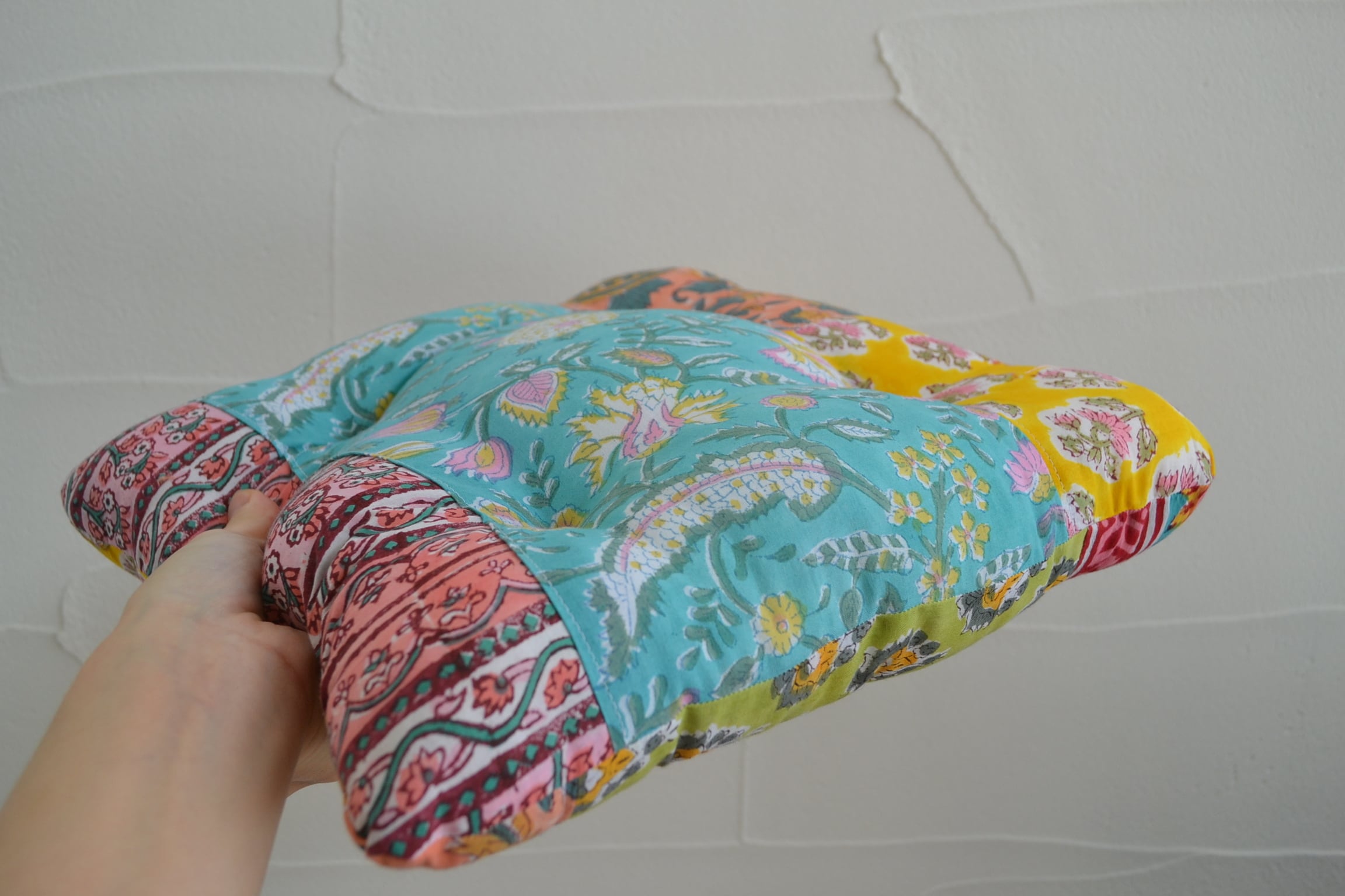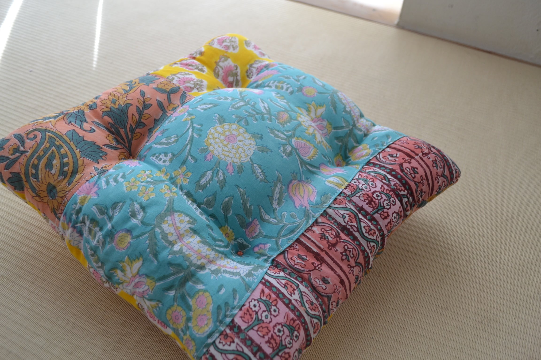 ブロックプリント生地はインドからお取寄せ、国内で一つ一つ丁寧に製作。クッションは店主が裁断、縫製を行っており、心を込めて制作しています。