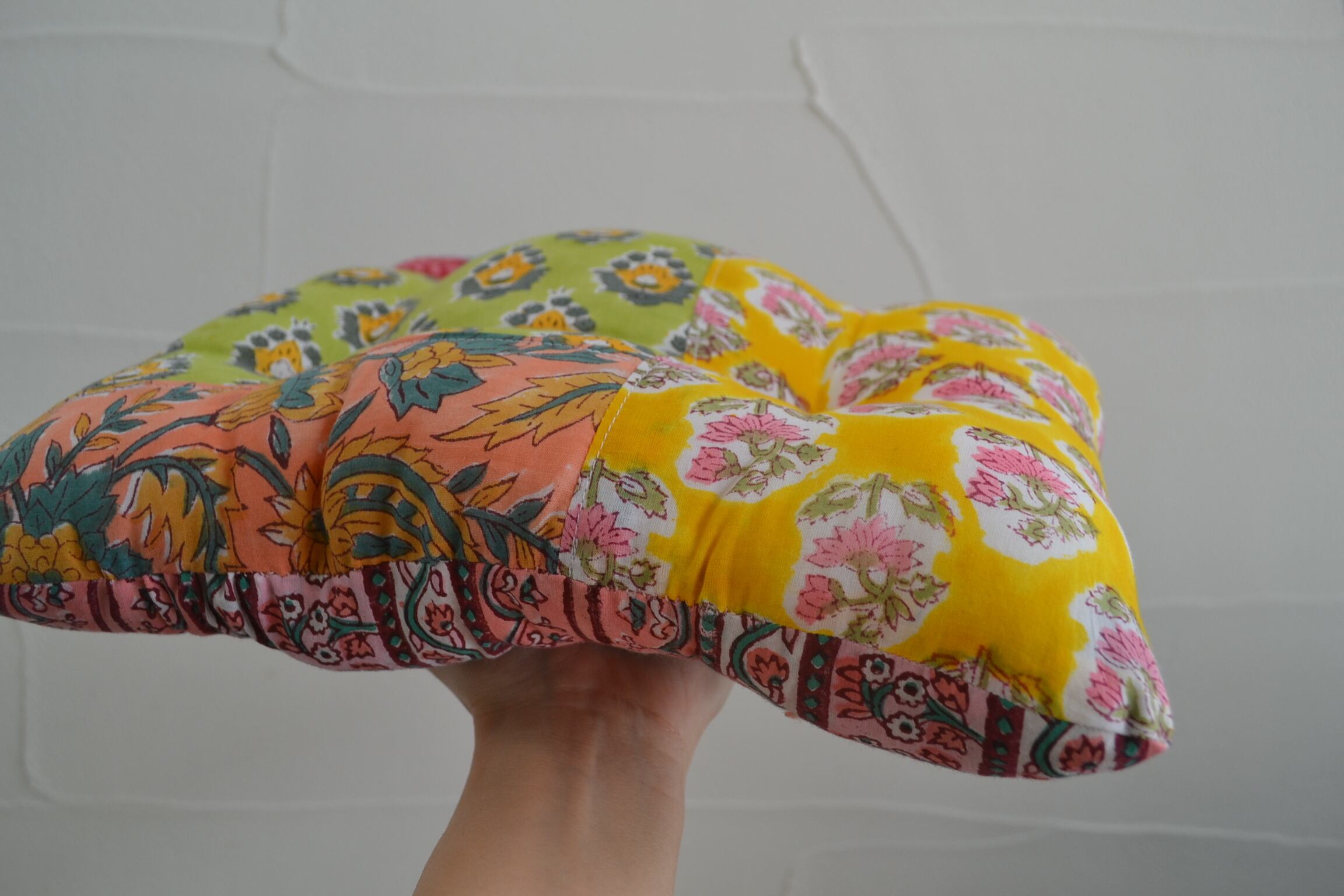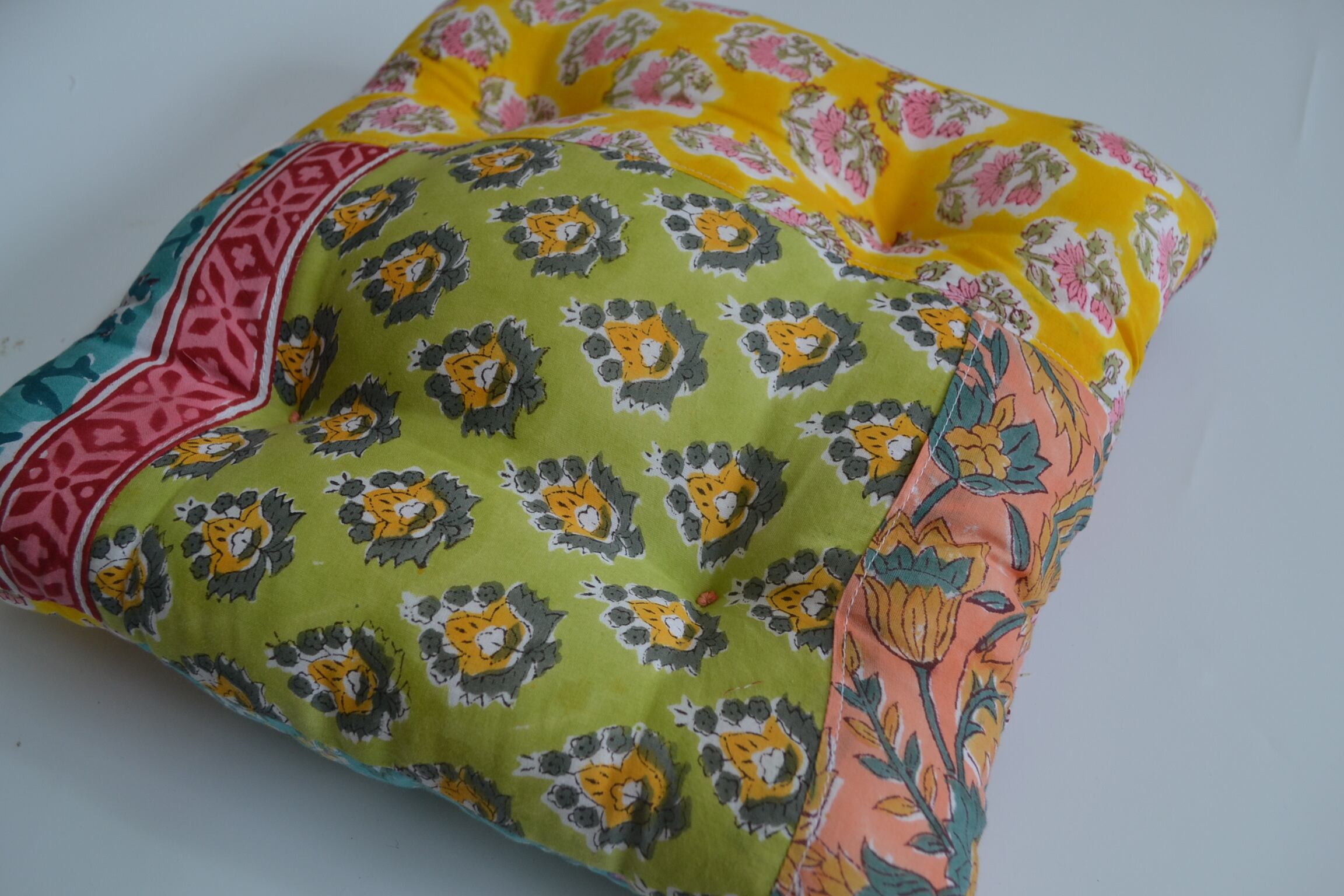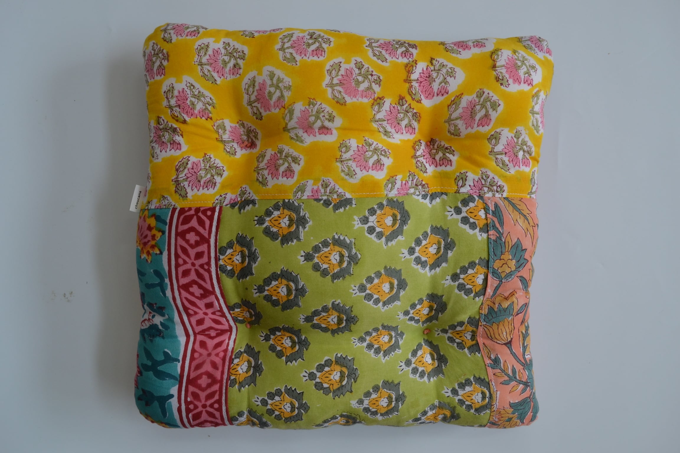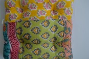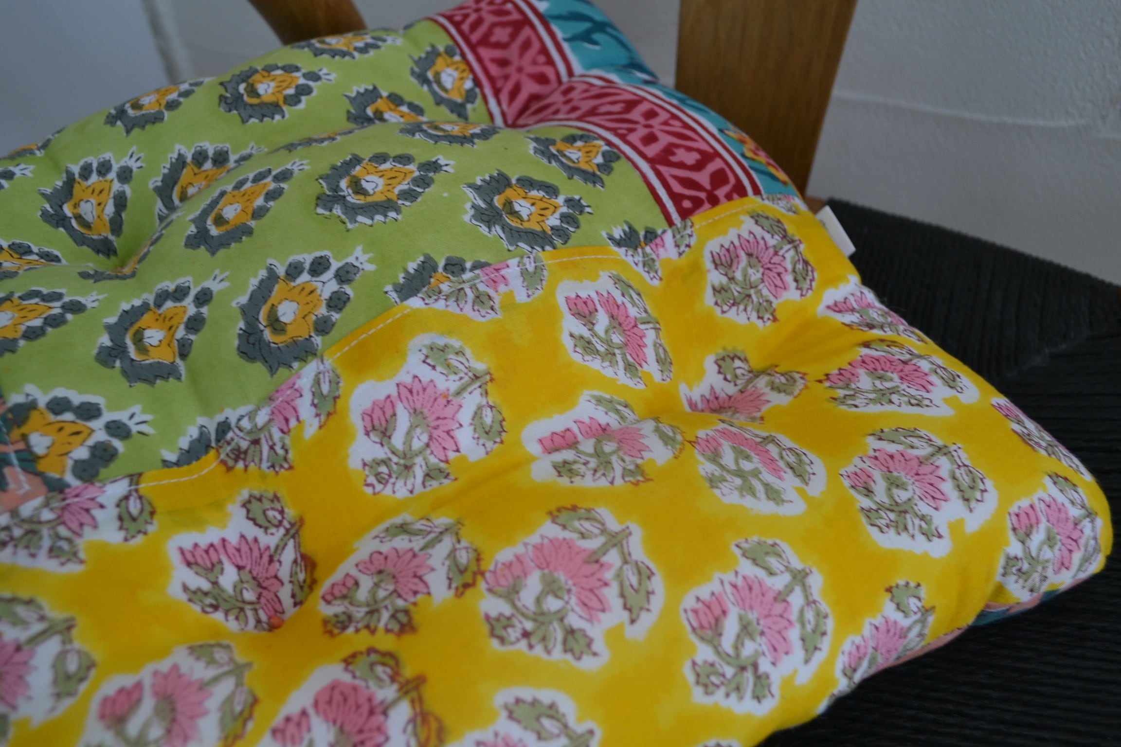 ブロックプリント生地はインドからお取寄せ、国内で一つ一つ丁寧に製作。クッションは店主が裁断、縫製を行っており、心を込めて制作しています。