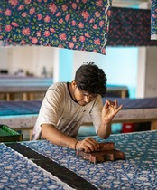 ①インドの伝統的技法で作られたブロックプリント生地使用