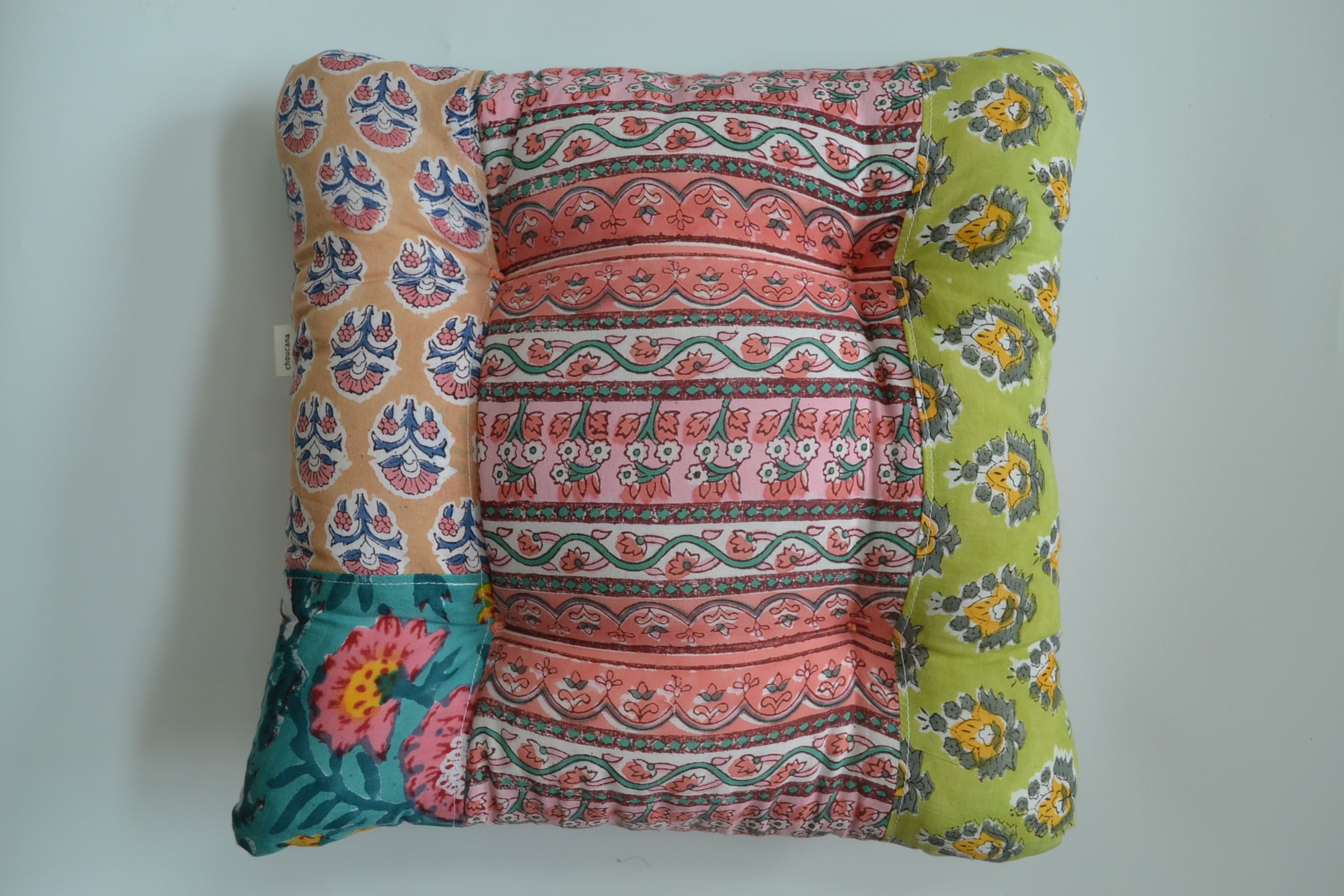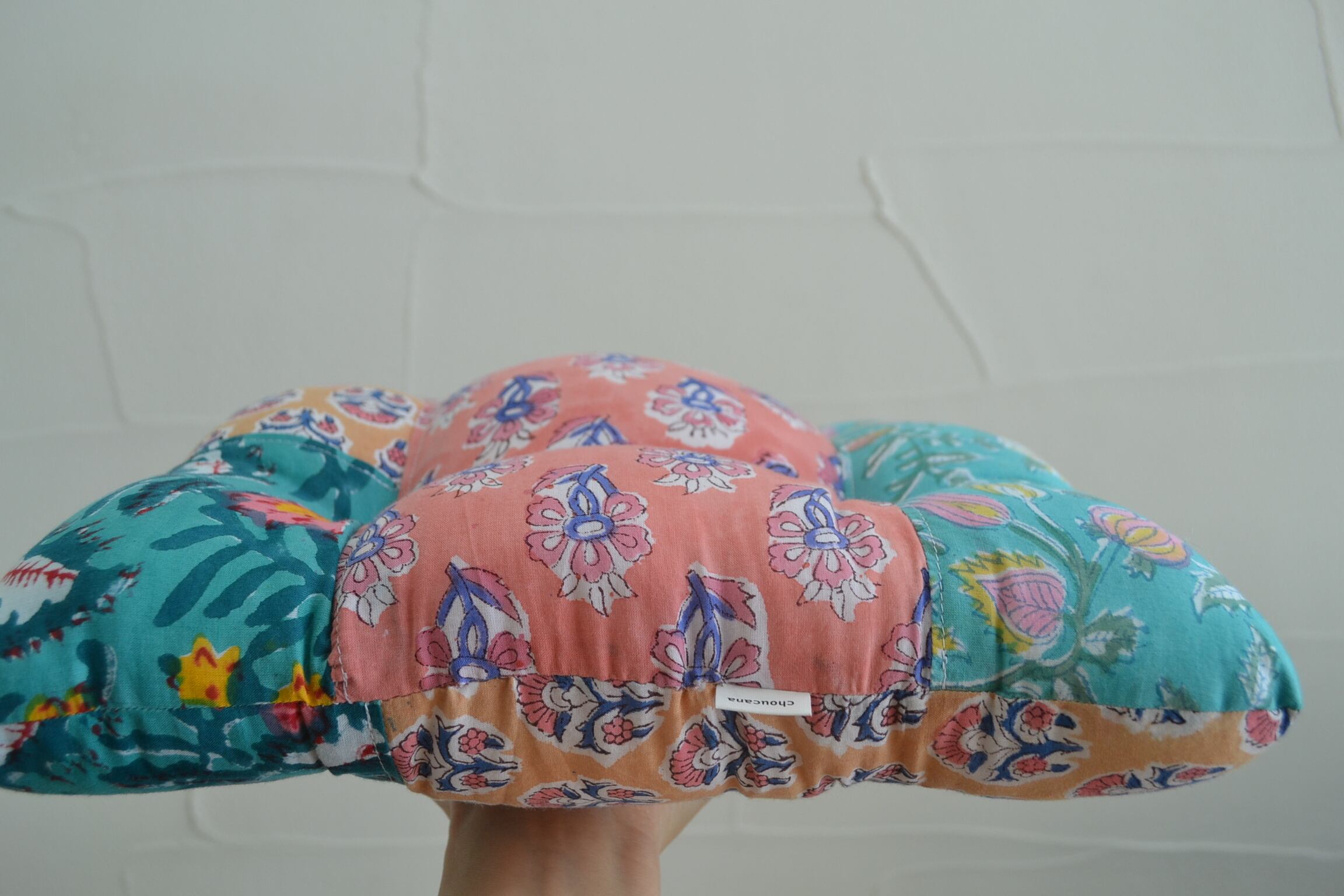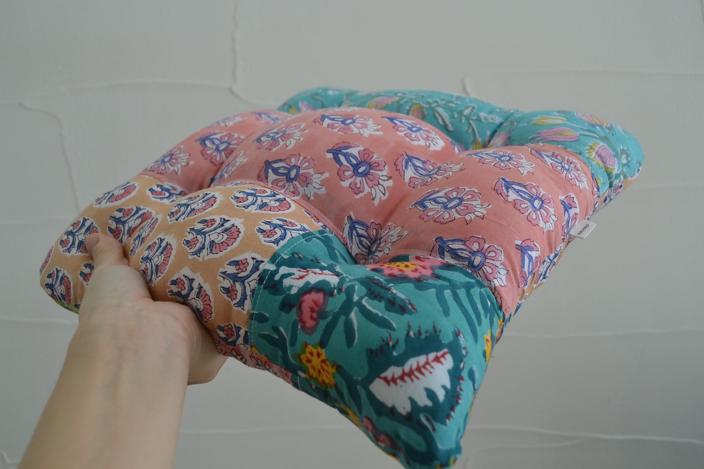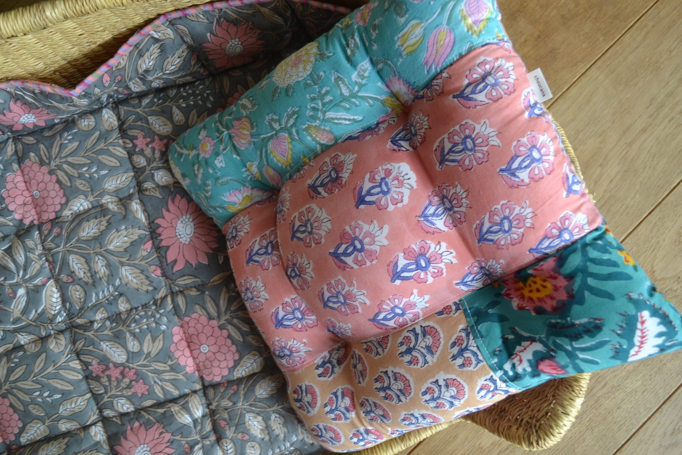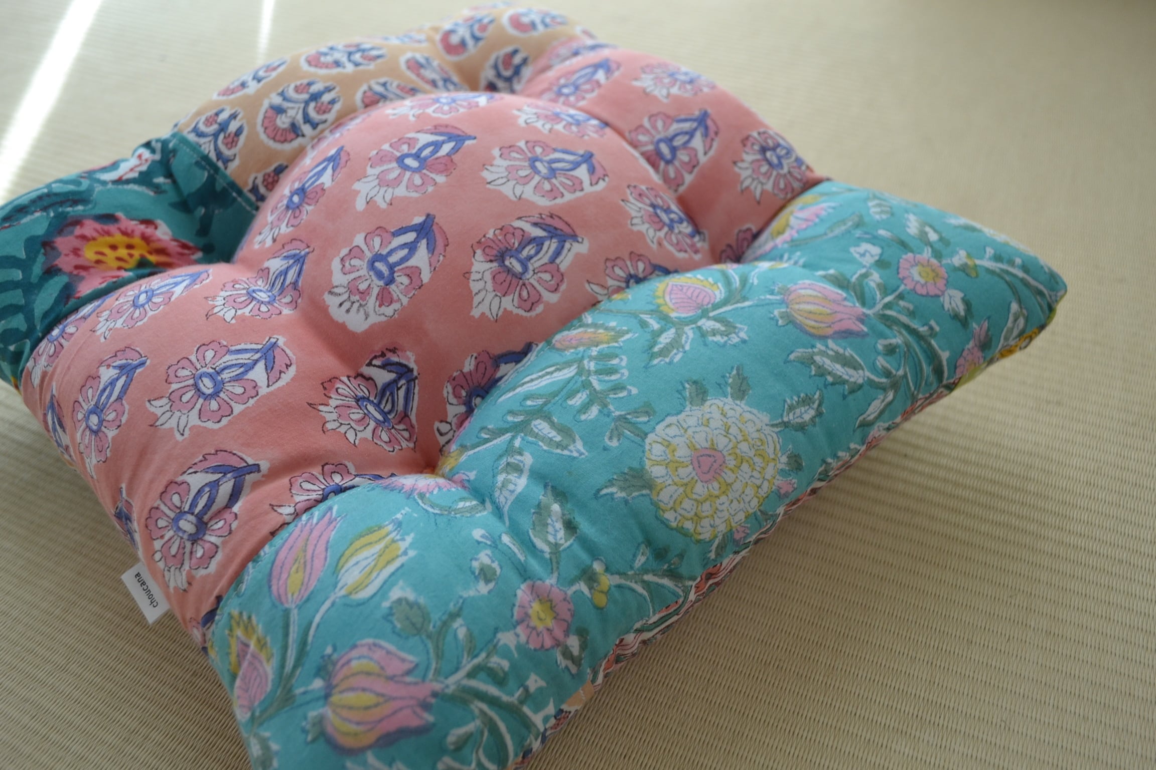 ブロックプリント生地はインドからお取寄せ、クッションは店主が裁断、縫製を行っており、心を込めて制作しています。