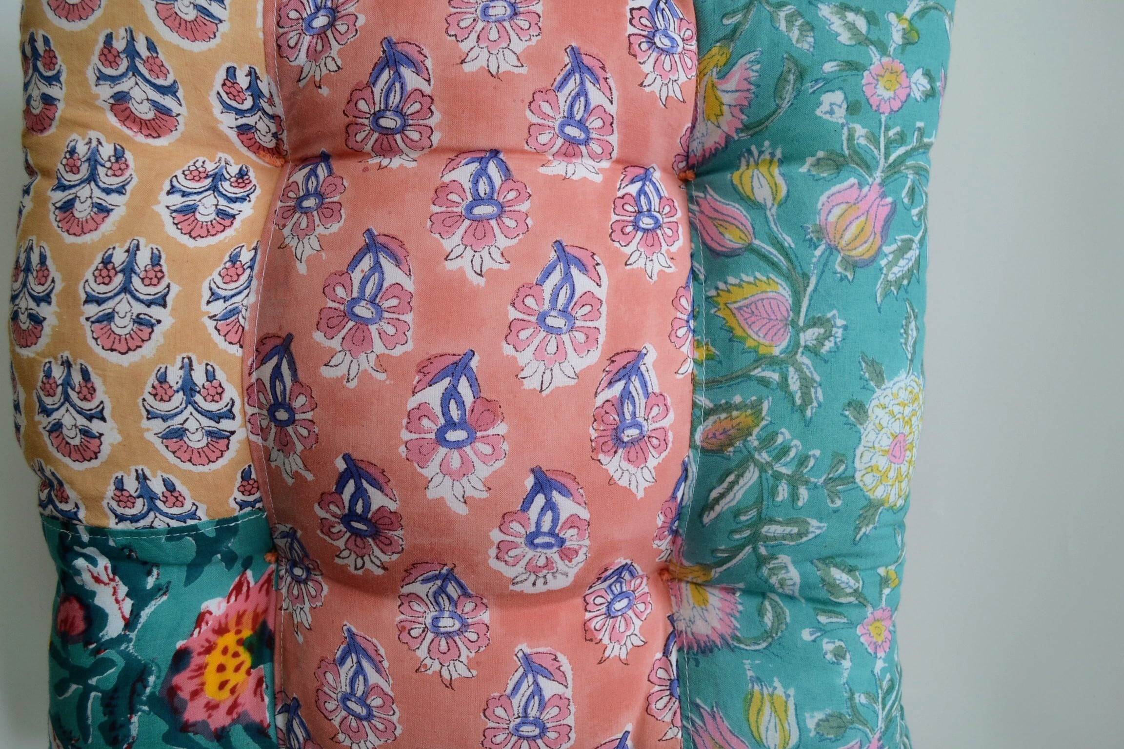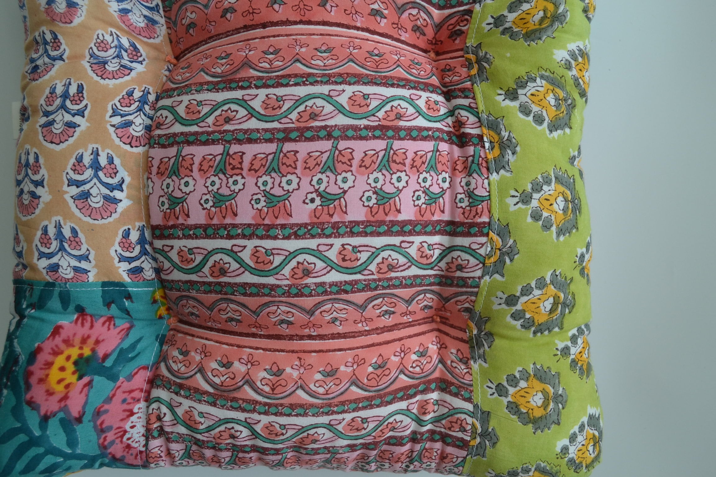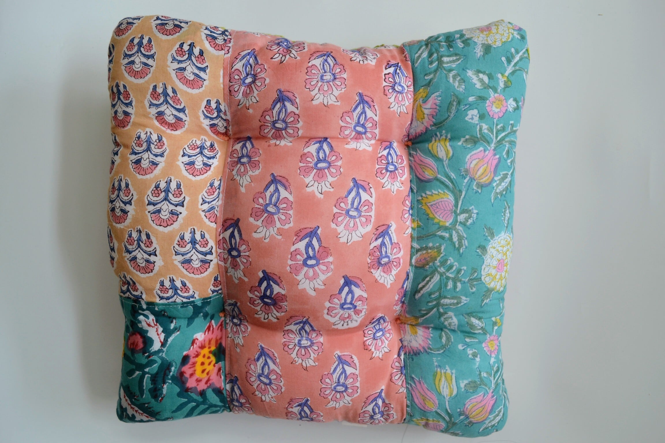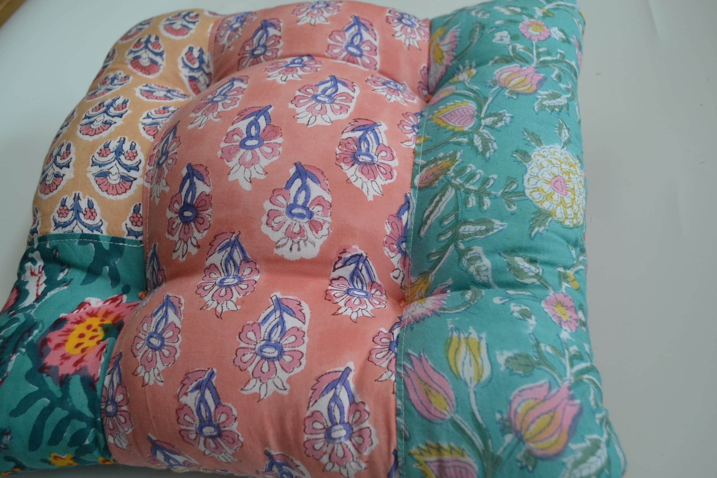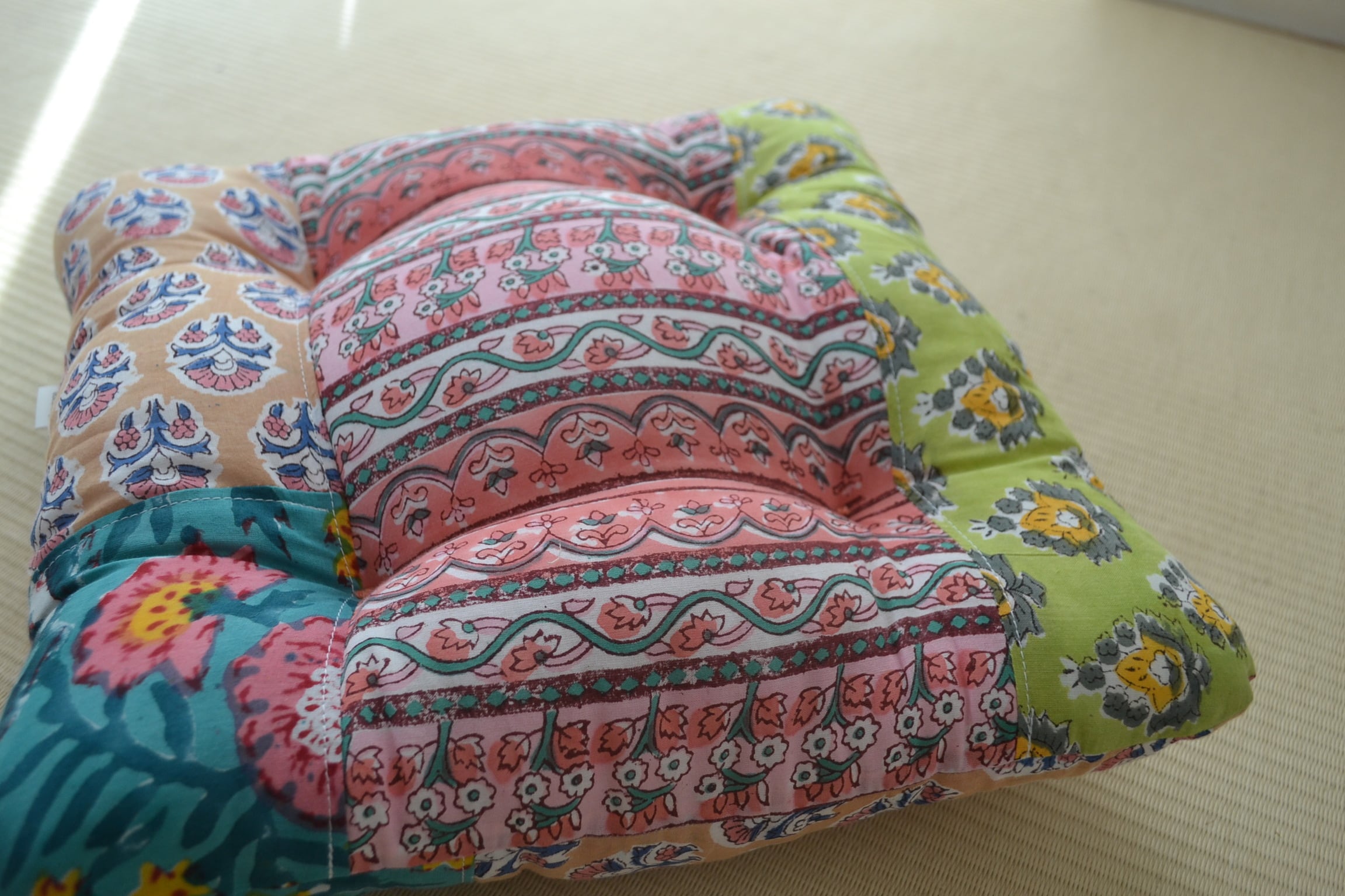 ブロックプリント生地はインドからお取寄せ、クッションは店主が裁断、縫製を行っており、心を込めて制作しています。