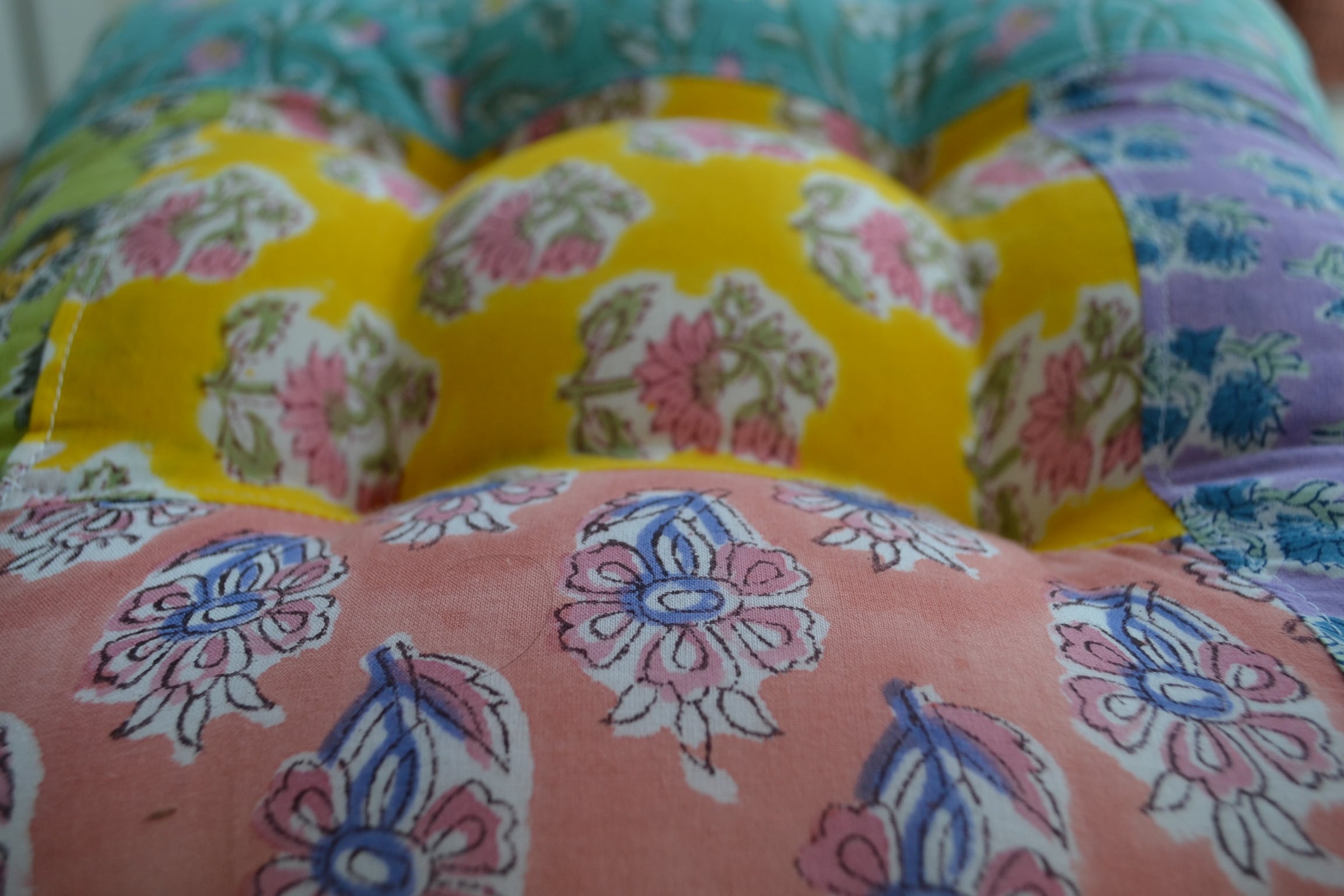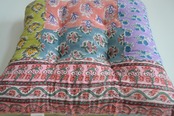 インドのブロックプリントは木版画を押し付けて職人がひとつひとつ模様を描いている為、色のズレや濃淡、染料のハネなどがございます。