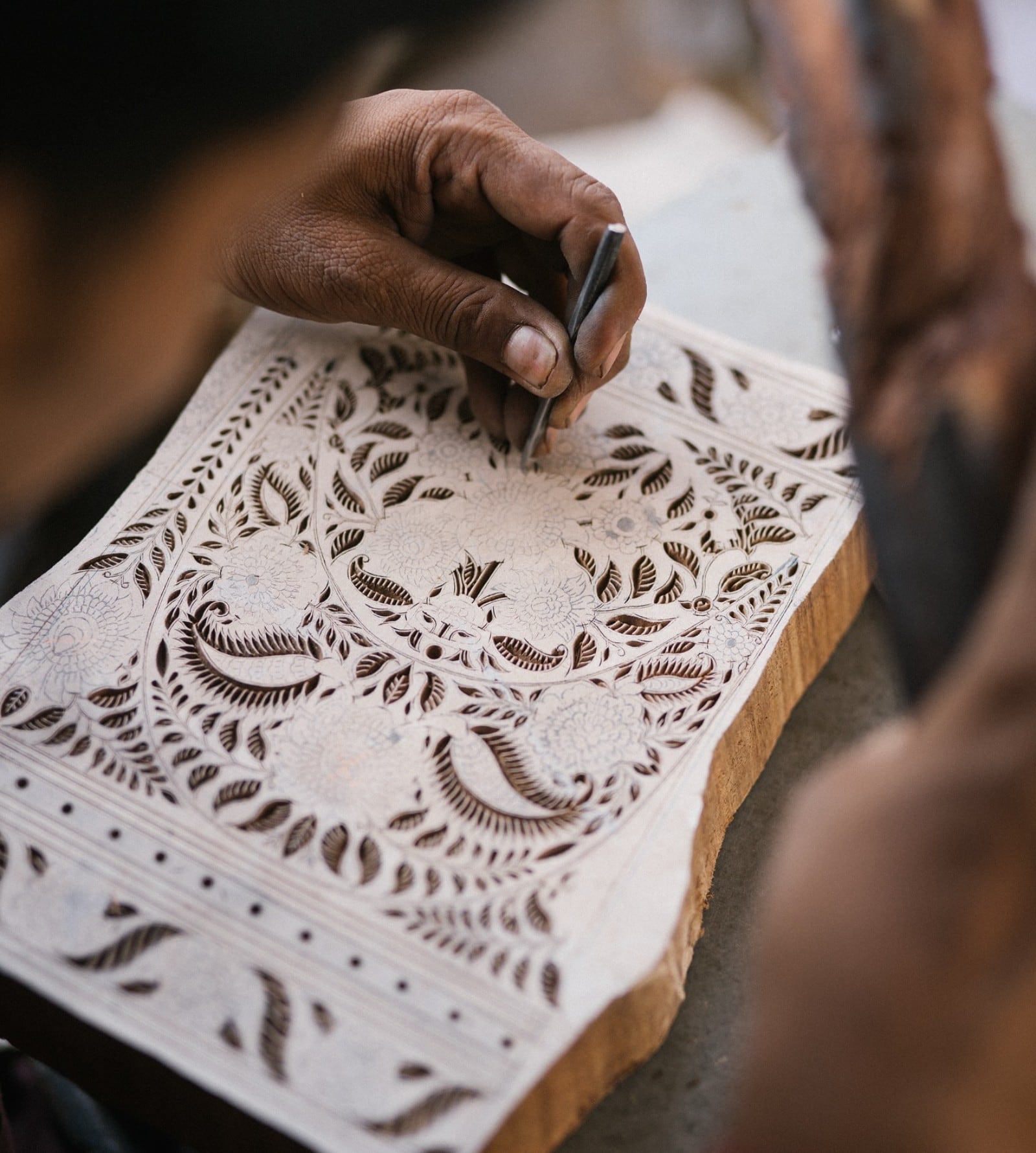①インドの伝統的技法で作られたブロックプリント生地使用