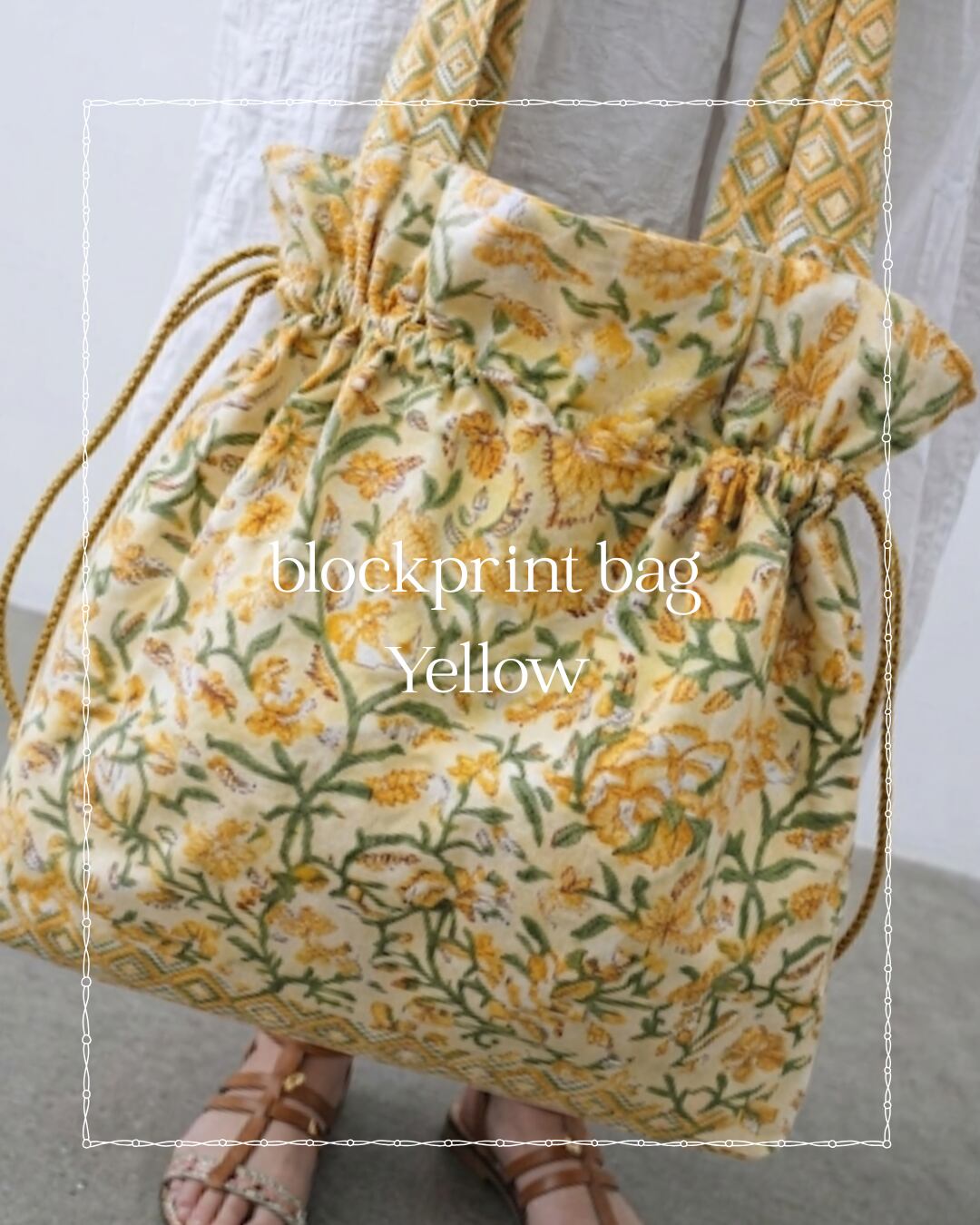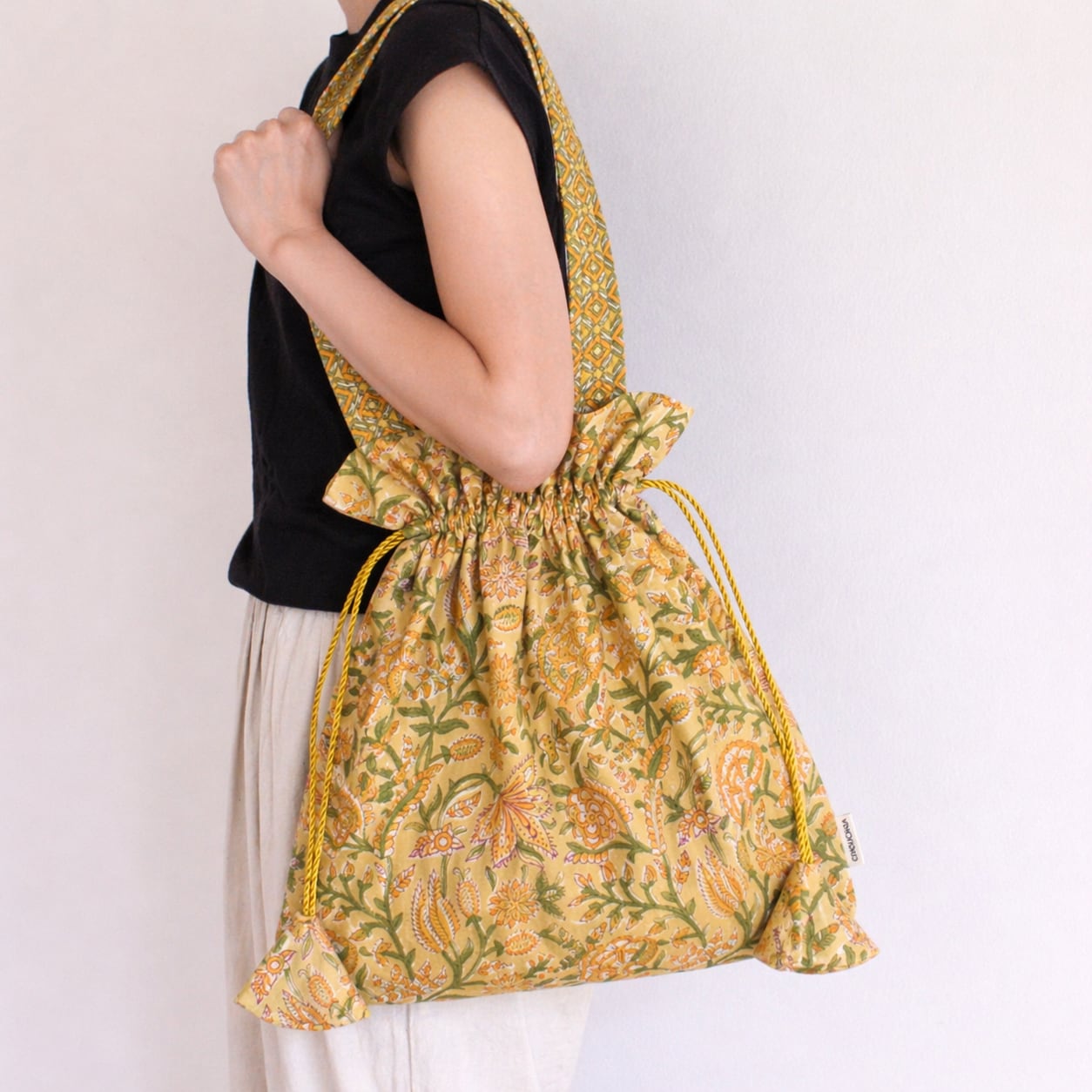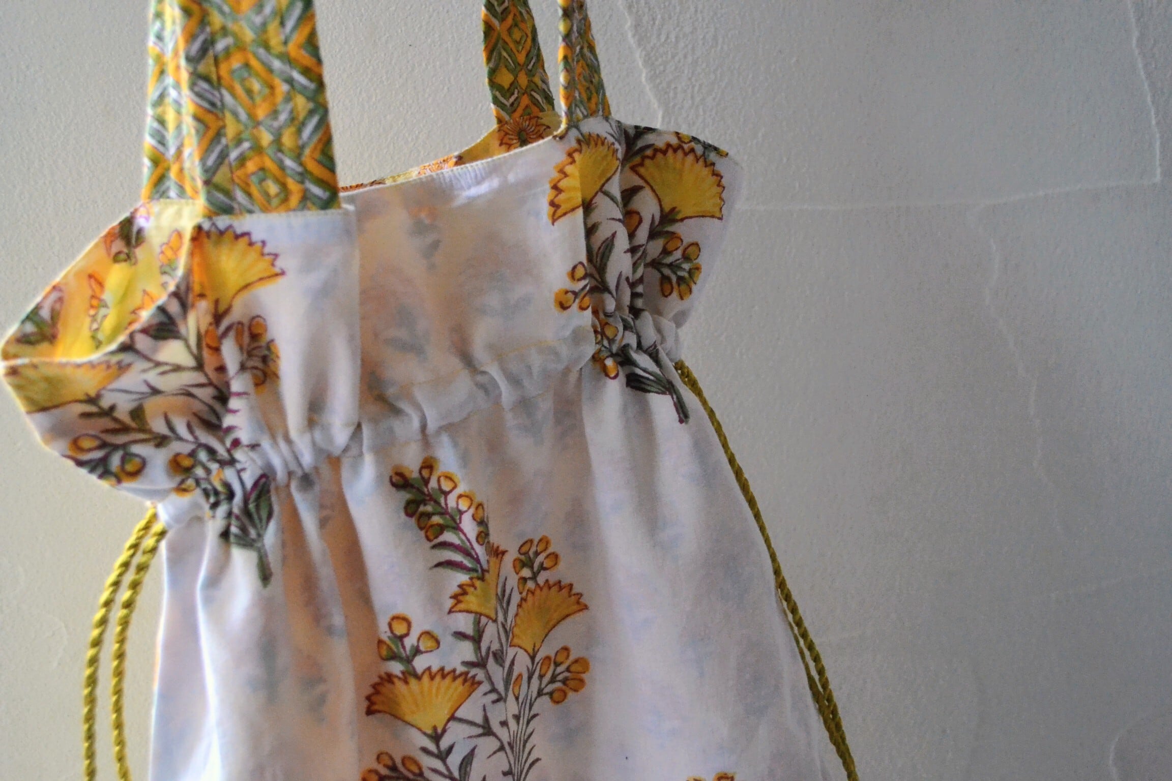 やさしい風合いのブロックプリントに、 きゅっと絞れる可愛い巾着デザイン。