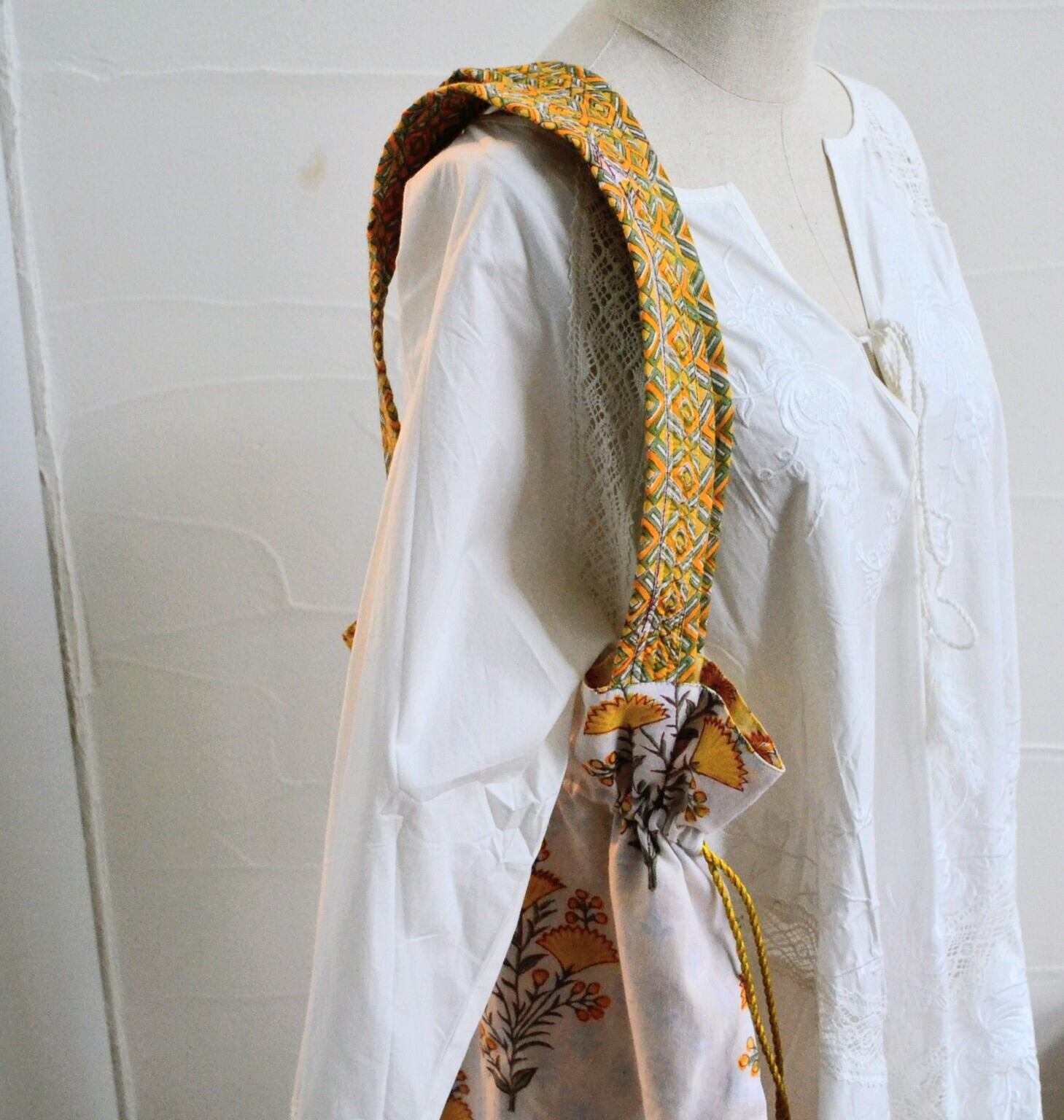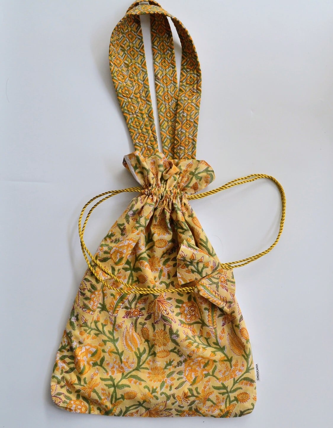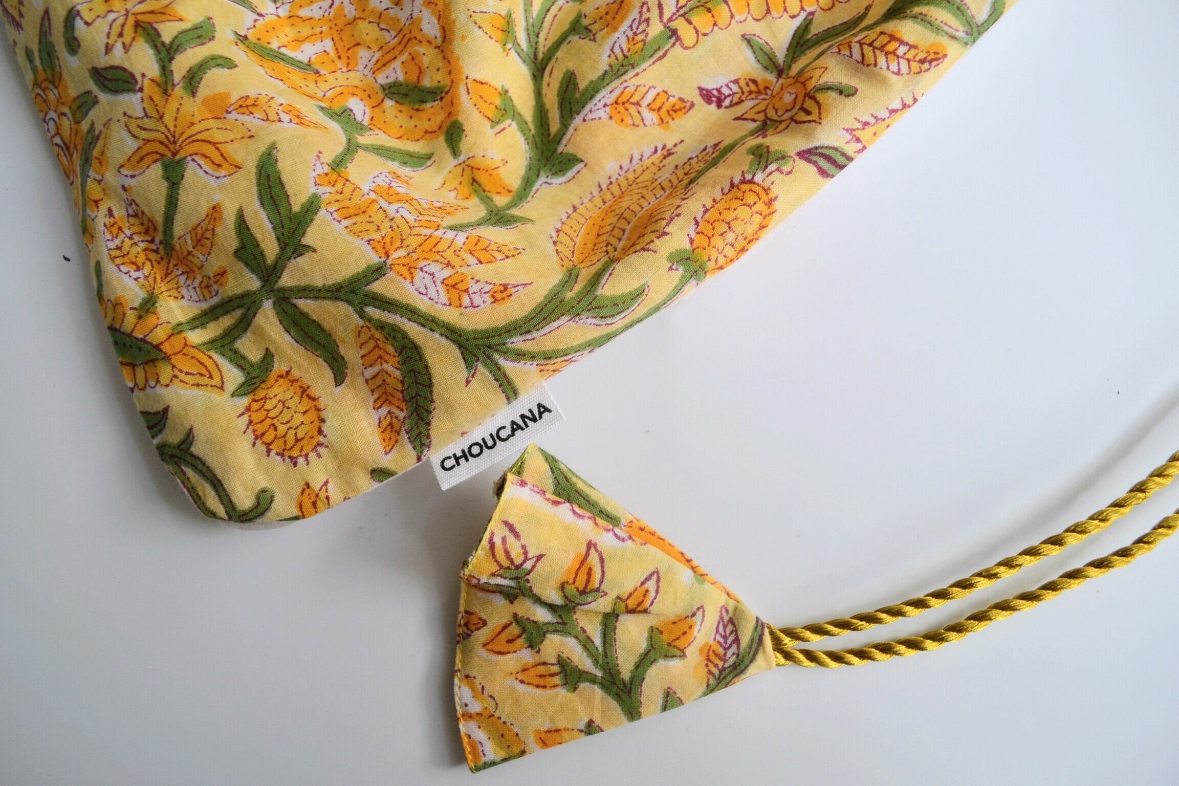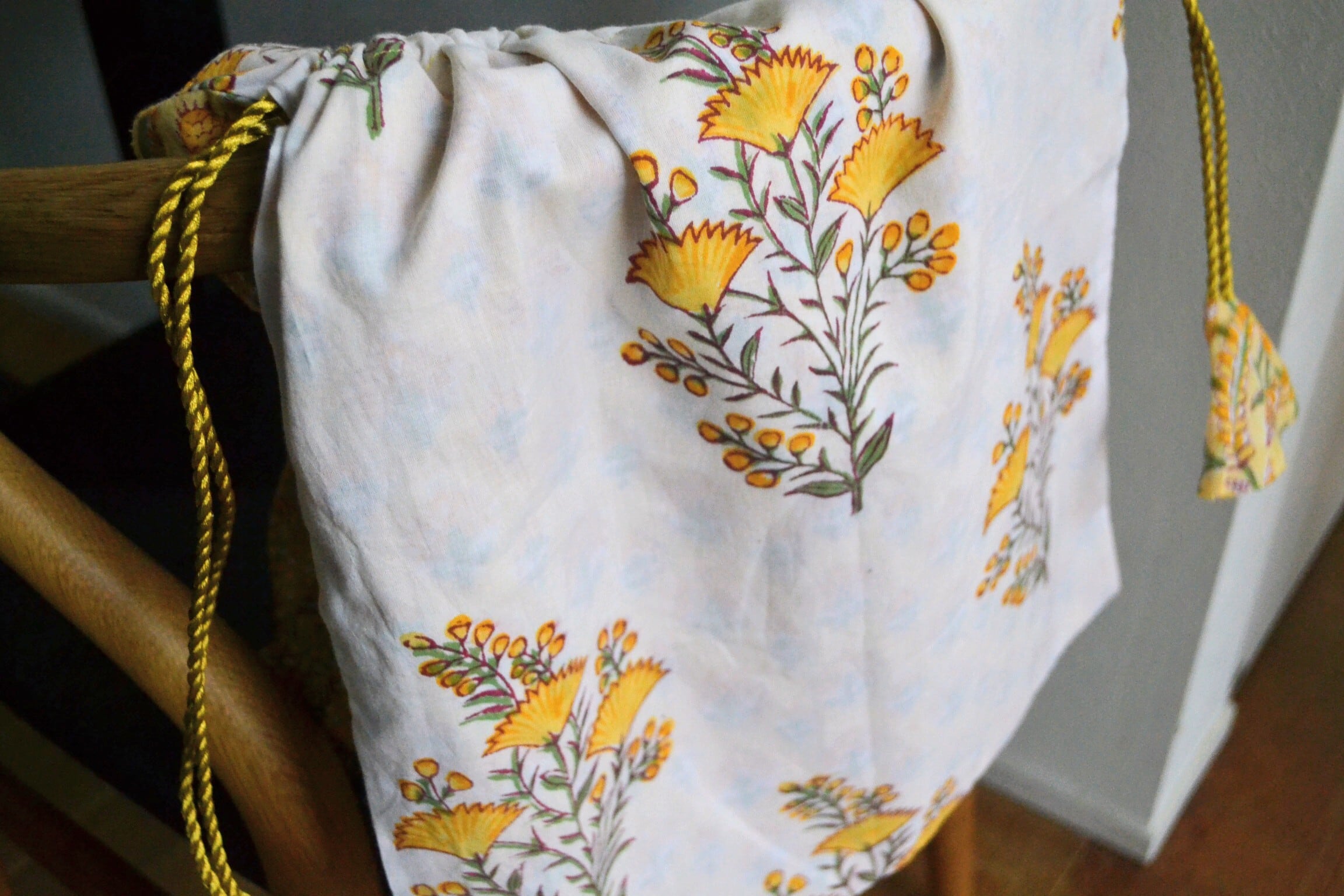 やさしい風合いのブロックプリントに、 きゅっと絞れる可愛い巾着デザイン。