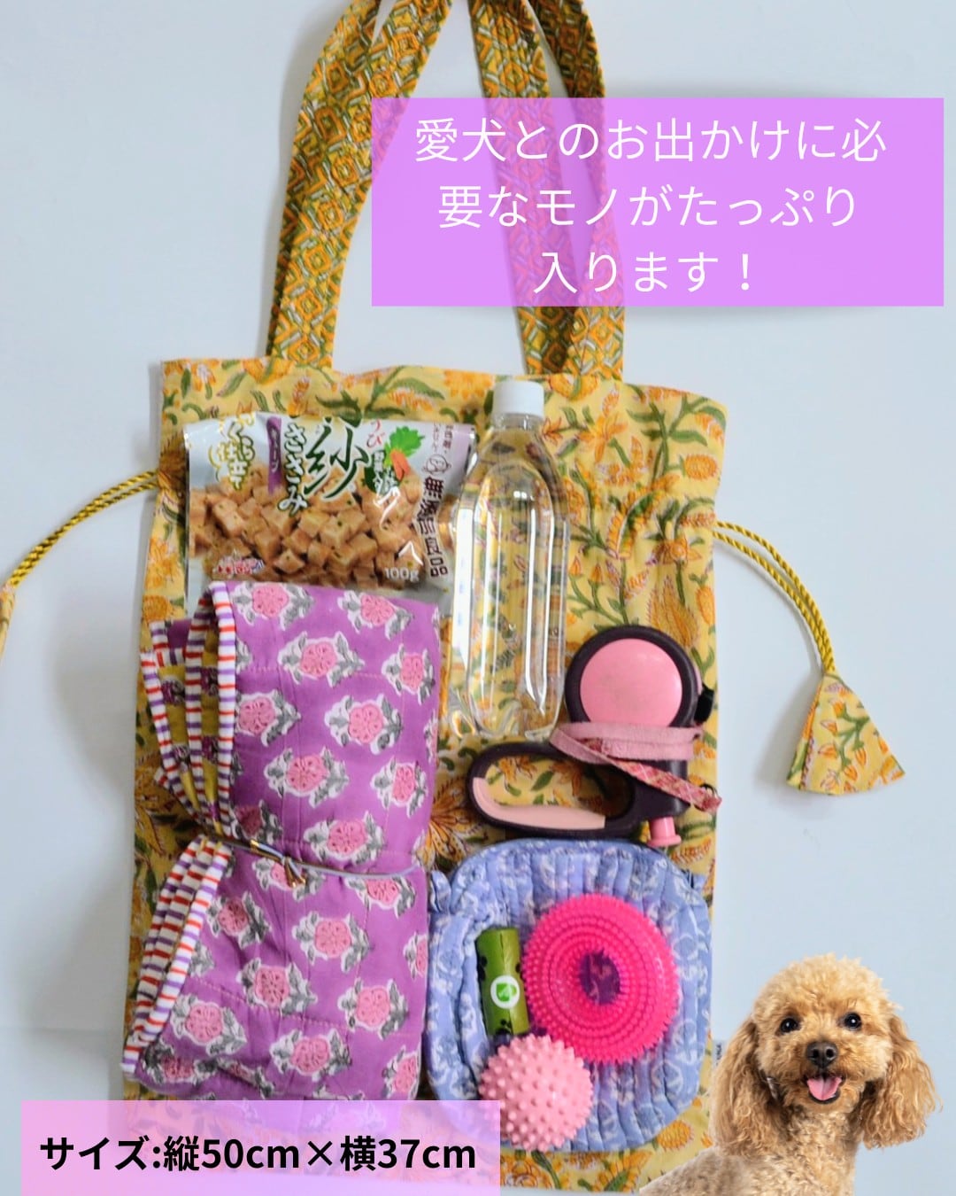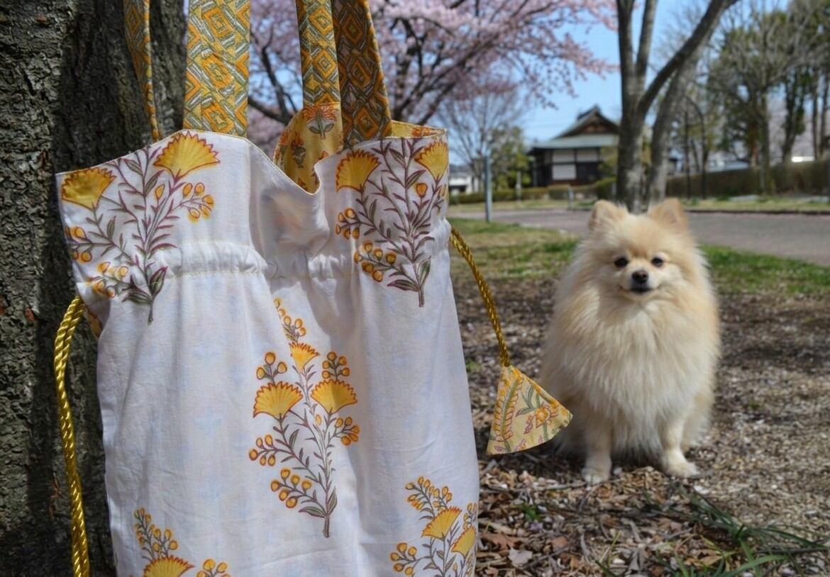 【サンフラワーイエロー】愛犬とのお出かけトートバッグ/ブロックプリント/リバーシブル