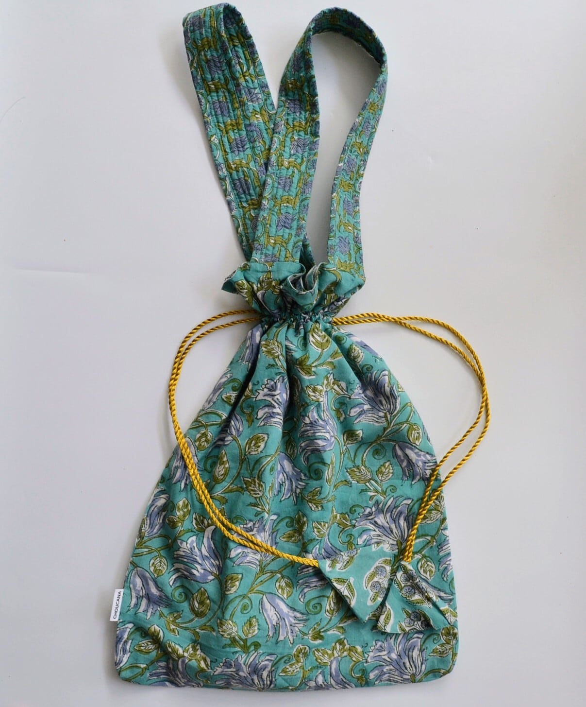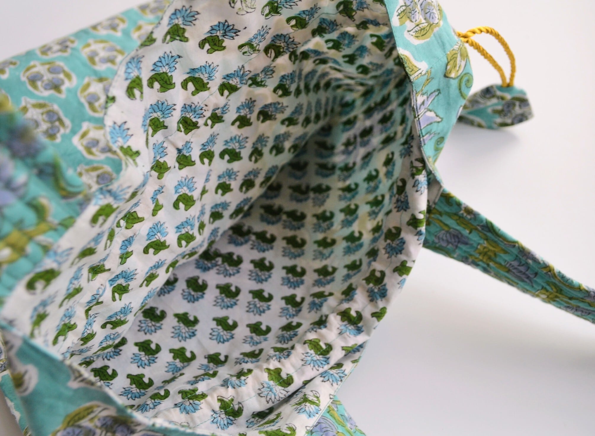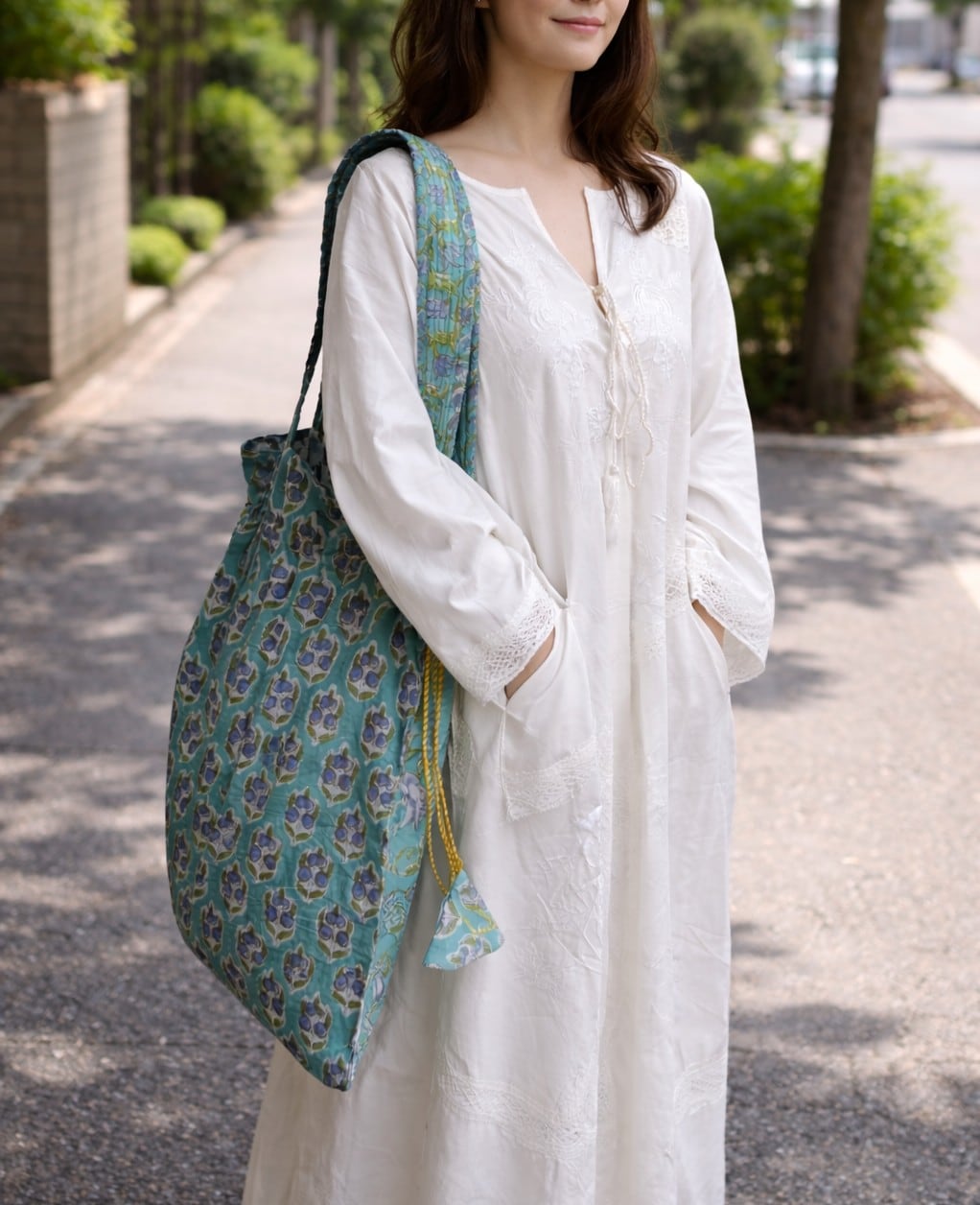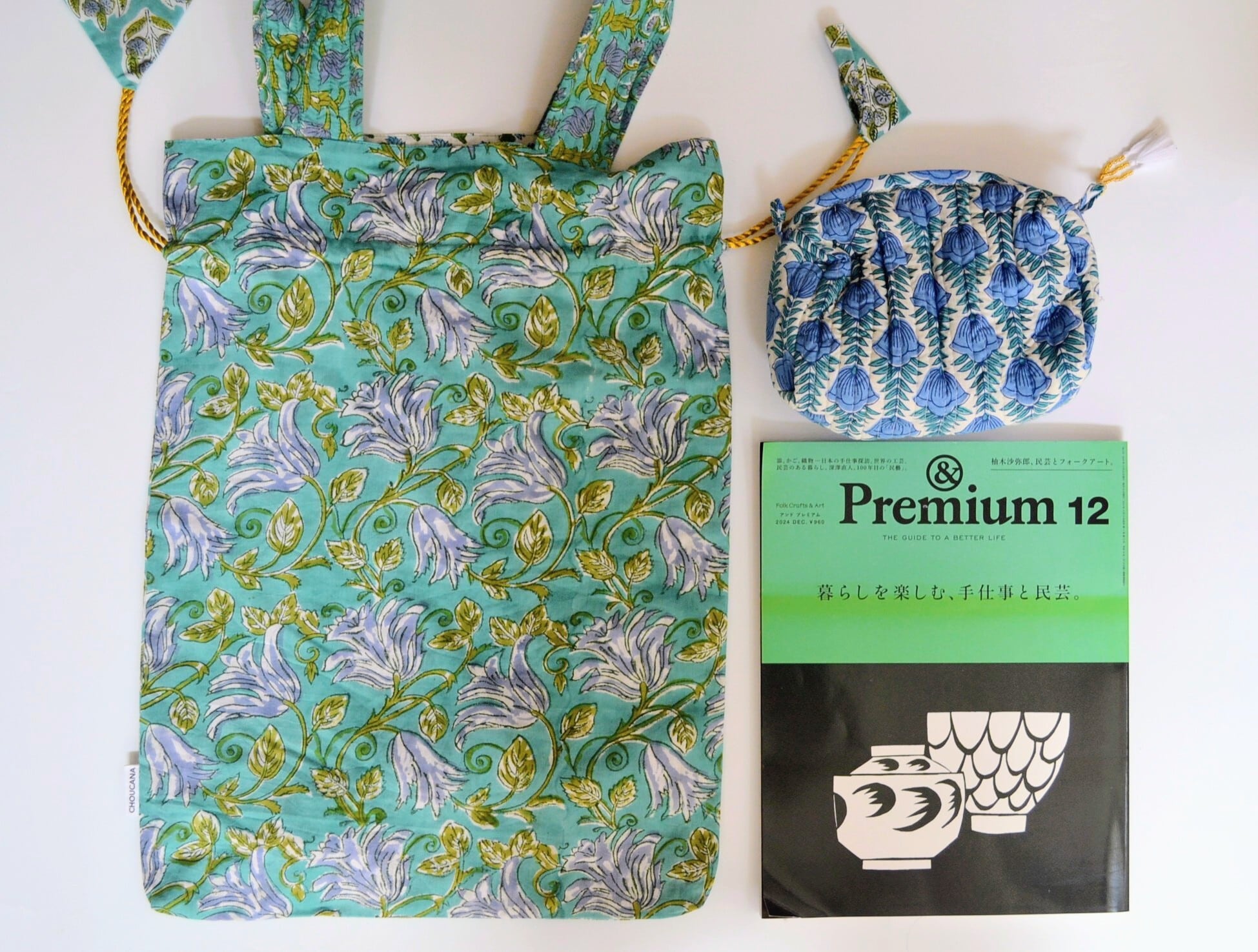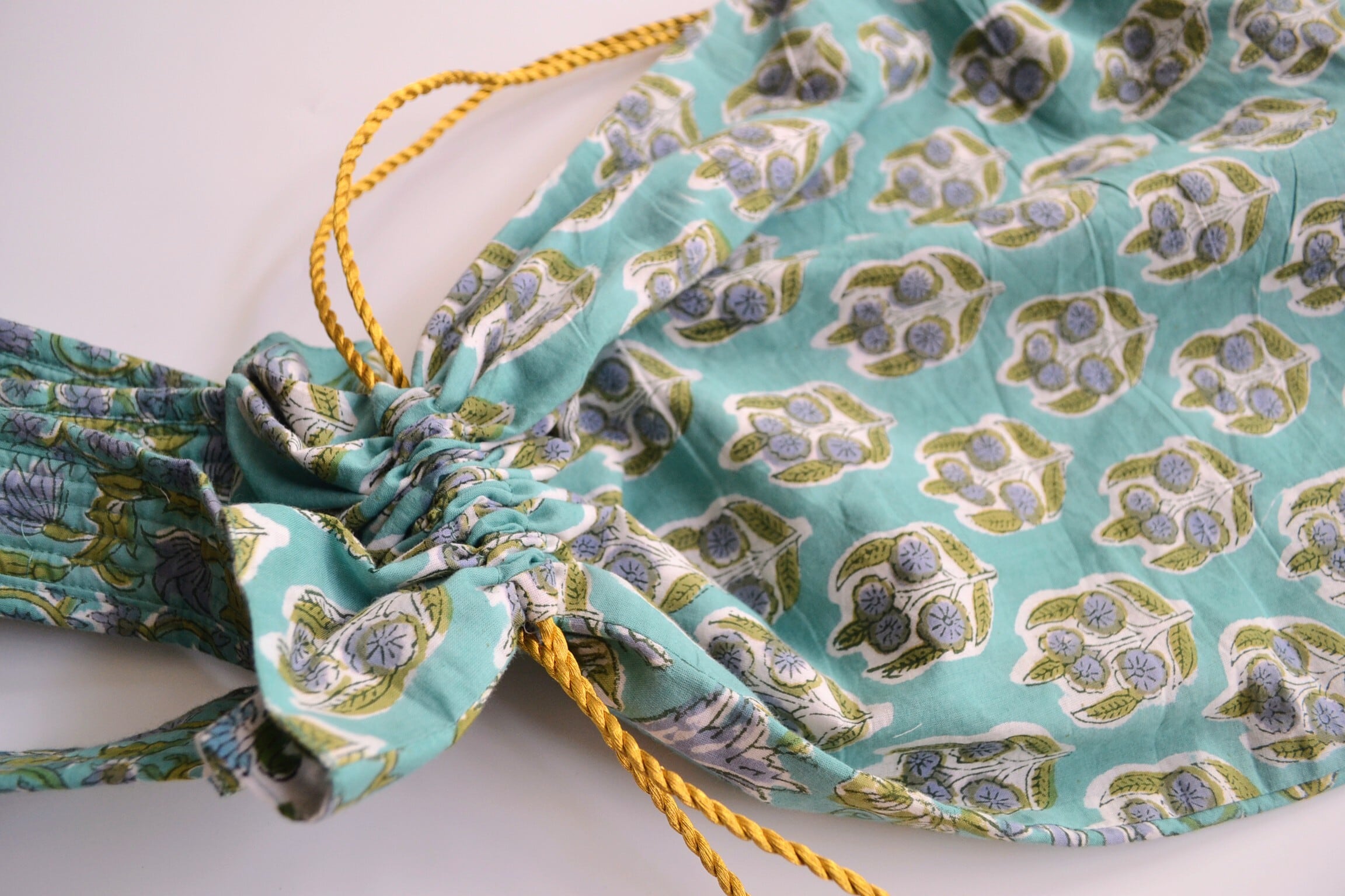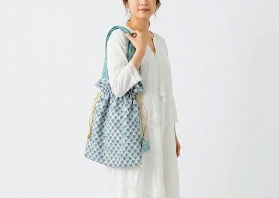 やさしい風合いのブロックプリントに、 きゅっと絞れる可愛い巾着デザイン。そして、ブロックプリント模様もリバーシブルなのでその日の気分で表情を変えられます。