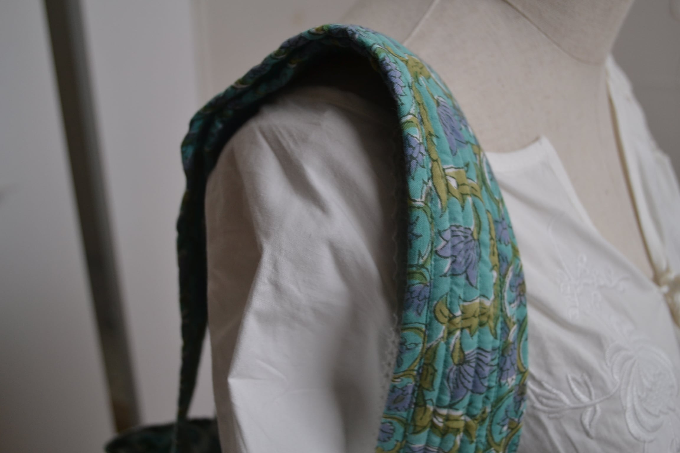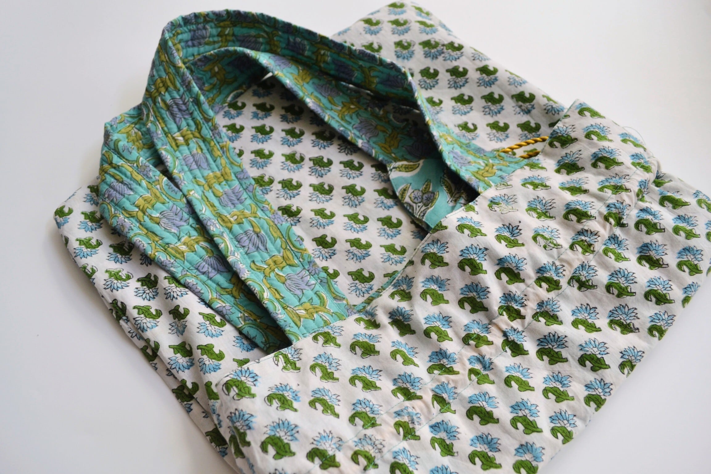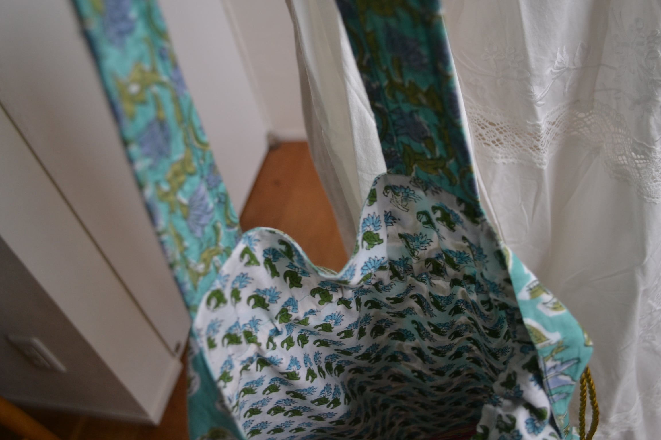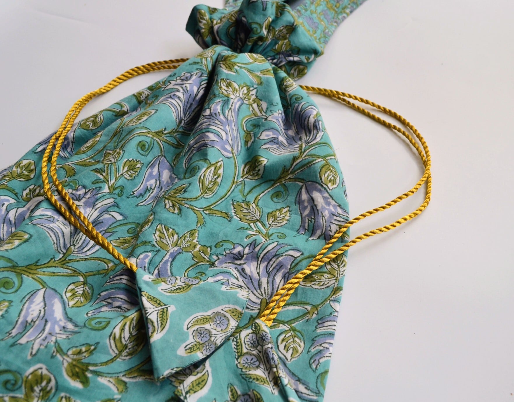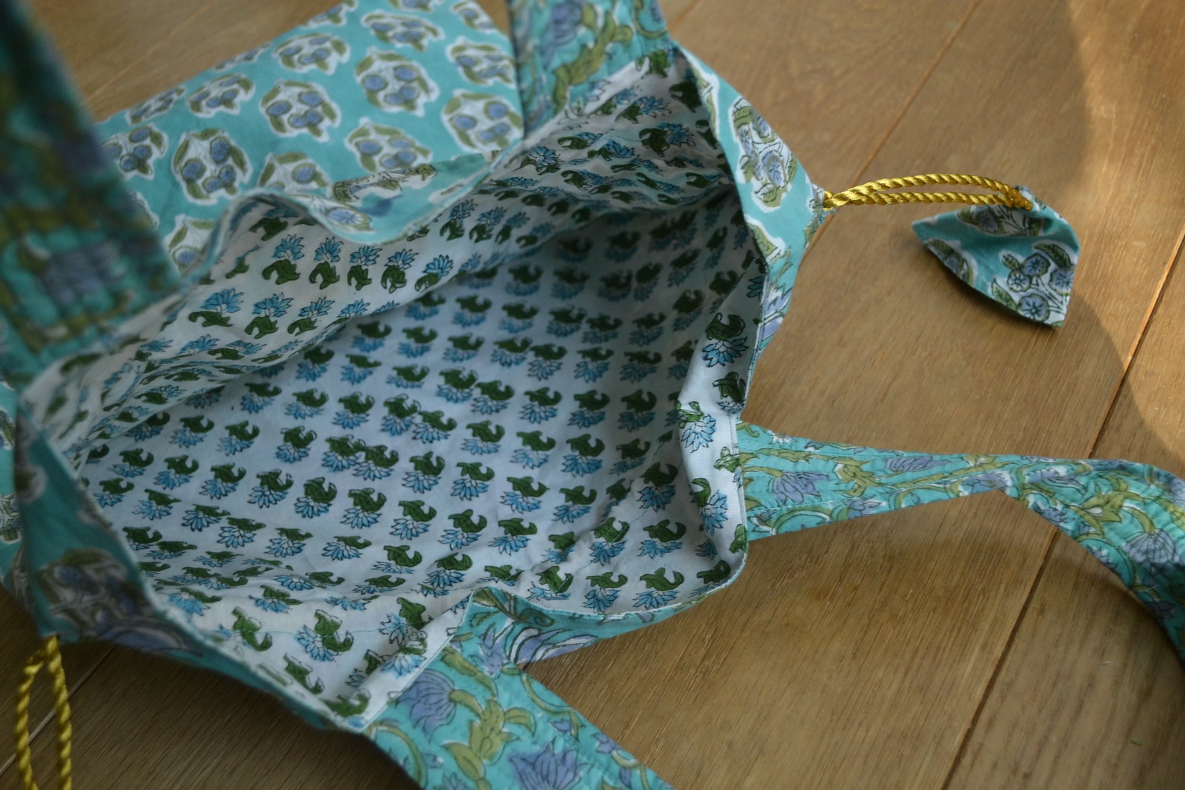 やさしい風合いのブロックプリントに、 きゅっと絞れる可愛い巾着デザイン。そして、ブロックプリント模様もリバーシブルなのでその日の気分で表情を変えられます。