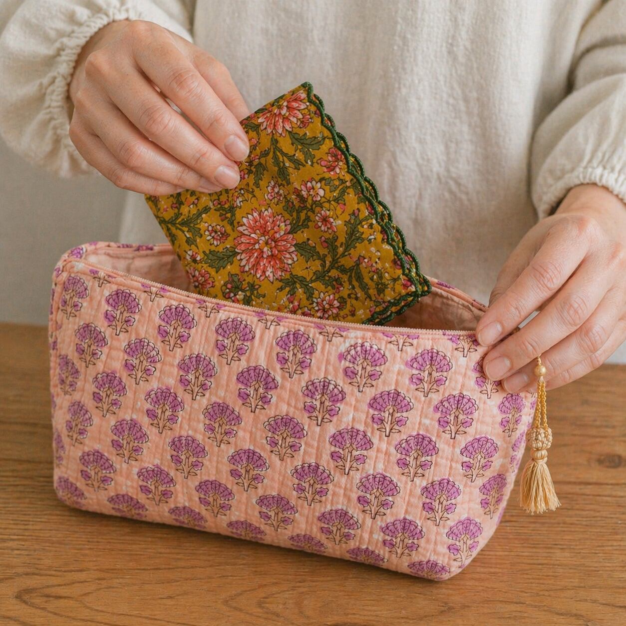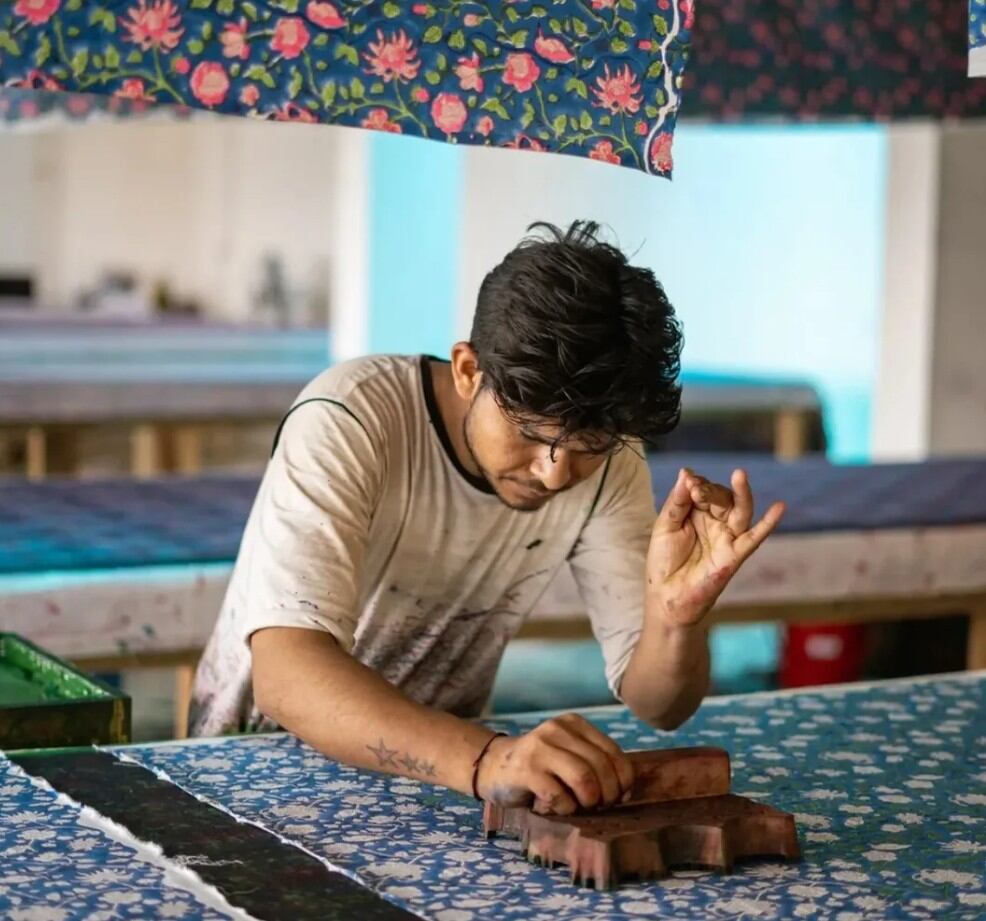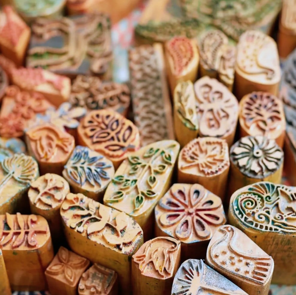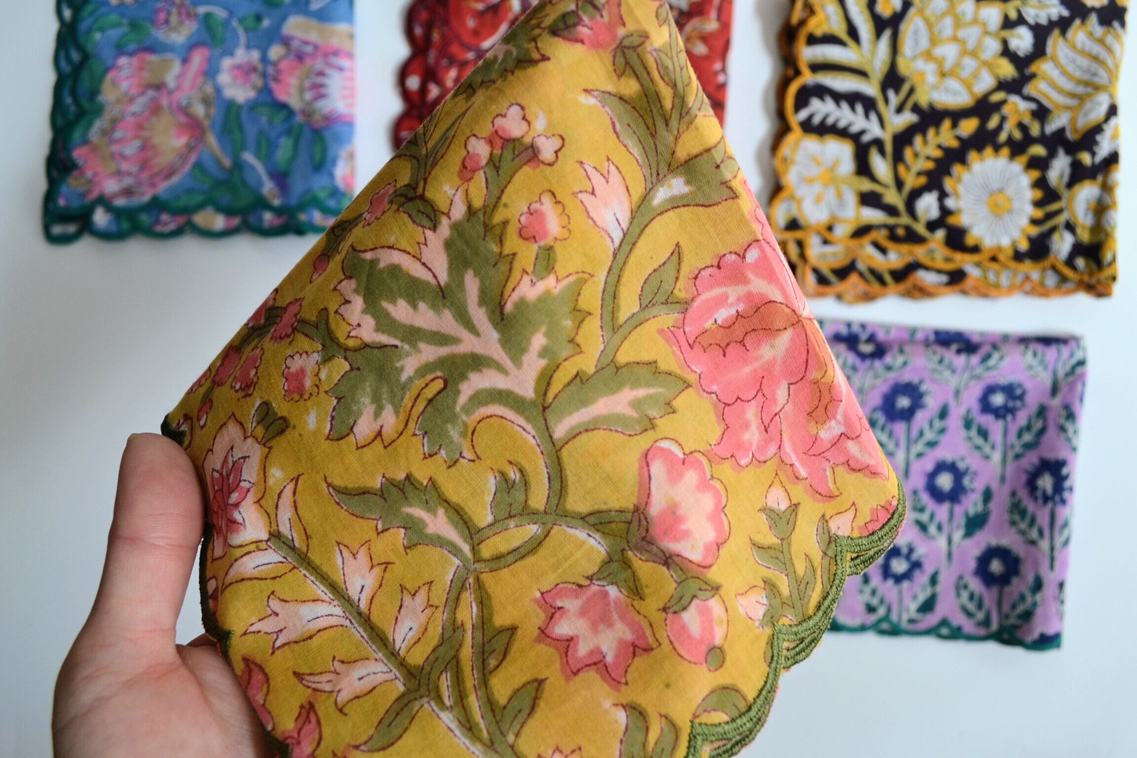 インドの伝統技法「ブロックプリント」で一枚一枚丁寧に仕上げたハンカチです。木版を使い、職人の手で柄を重ねていくことで生まれる、かすれやにじみ――それは機械では再現できない、唯一無二の表情。どこか懐かしく、やさしい風合いが魅力です。