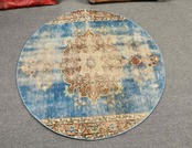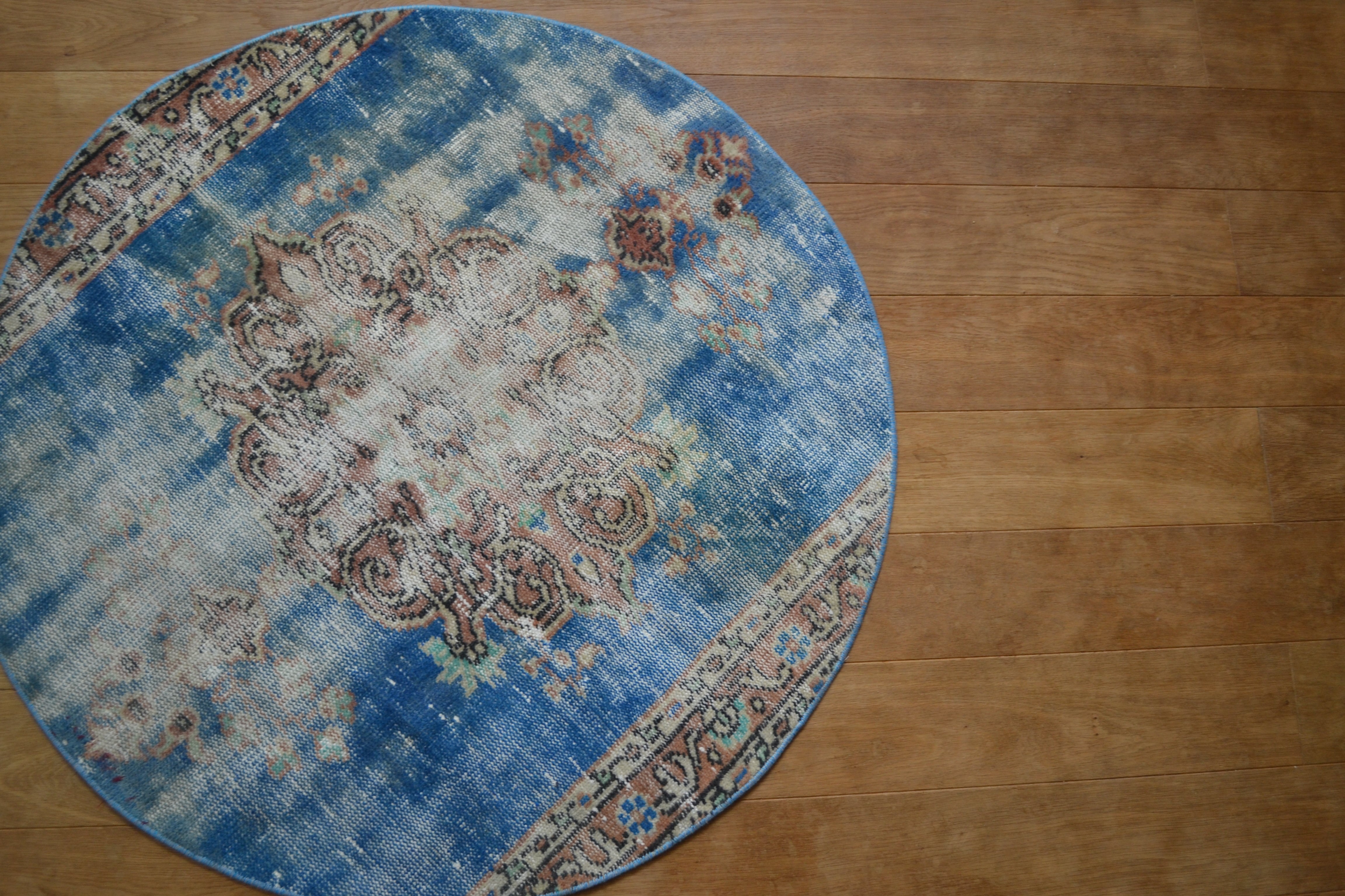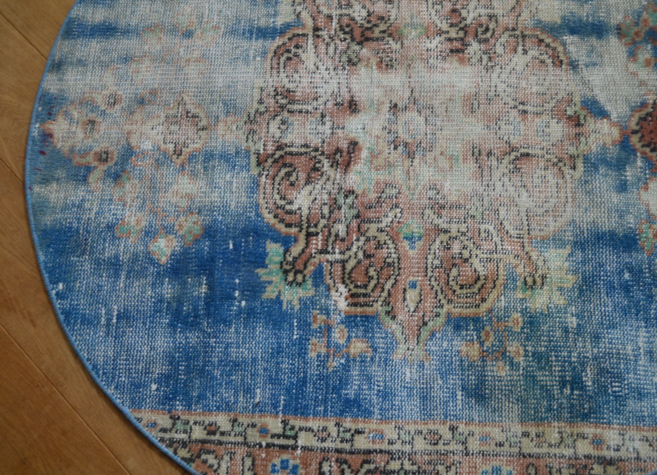 天然塗料で染められた手紡ぎのオーガニックウールから手作りされた一点もののヴィンテージラグ。珍しい丸型は他ではなかなか手に入らない貴重な一品となっています。