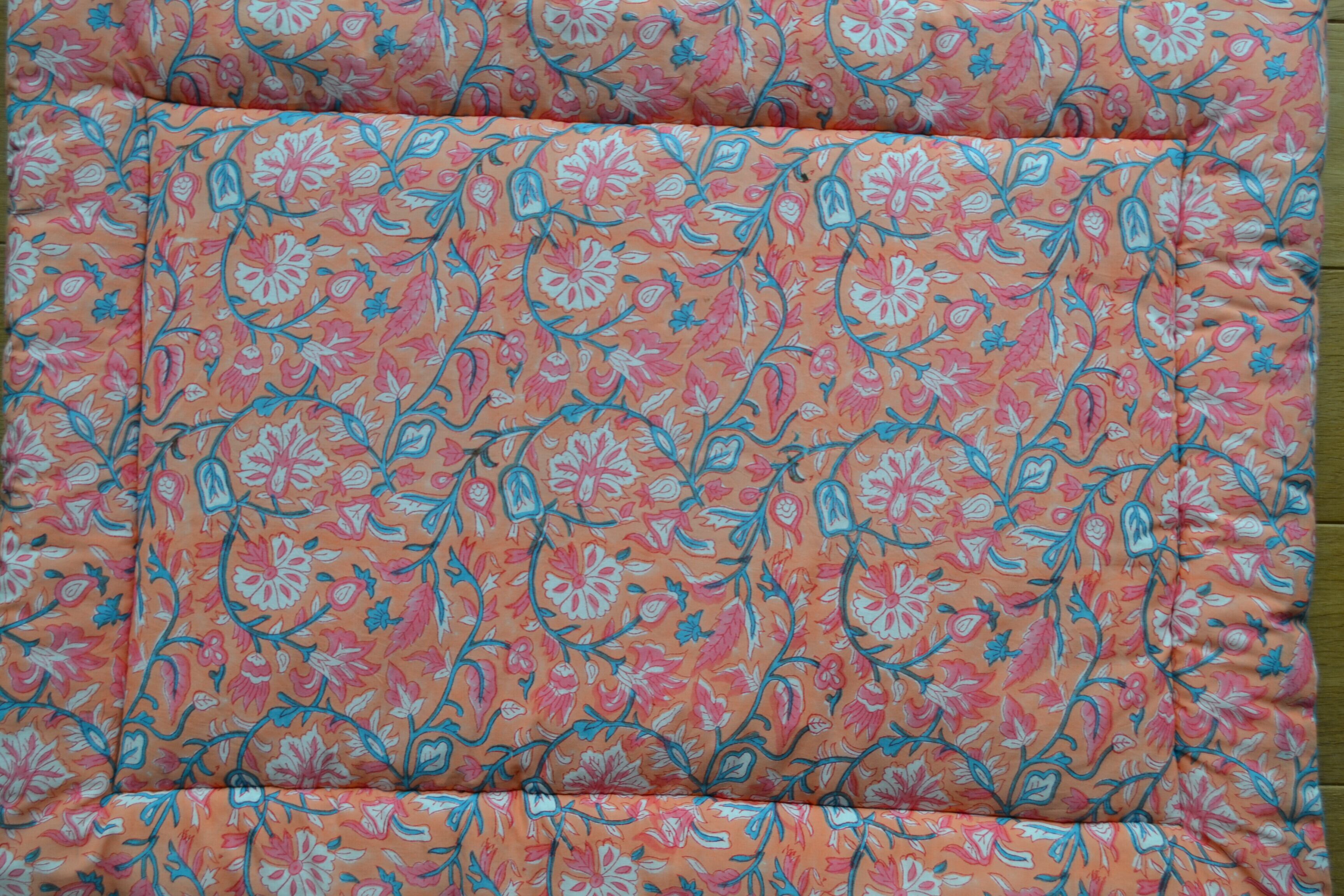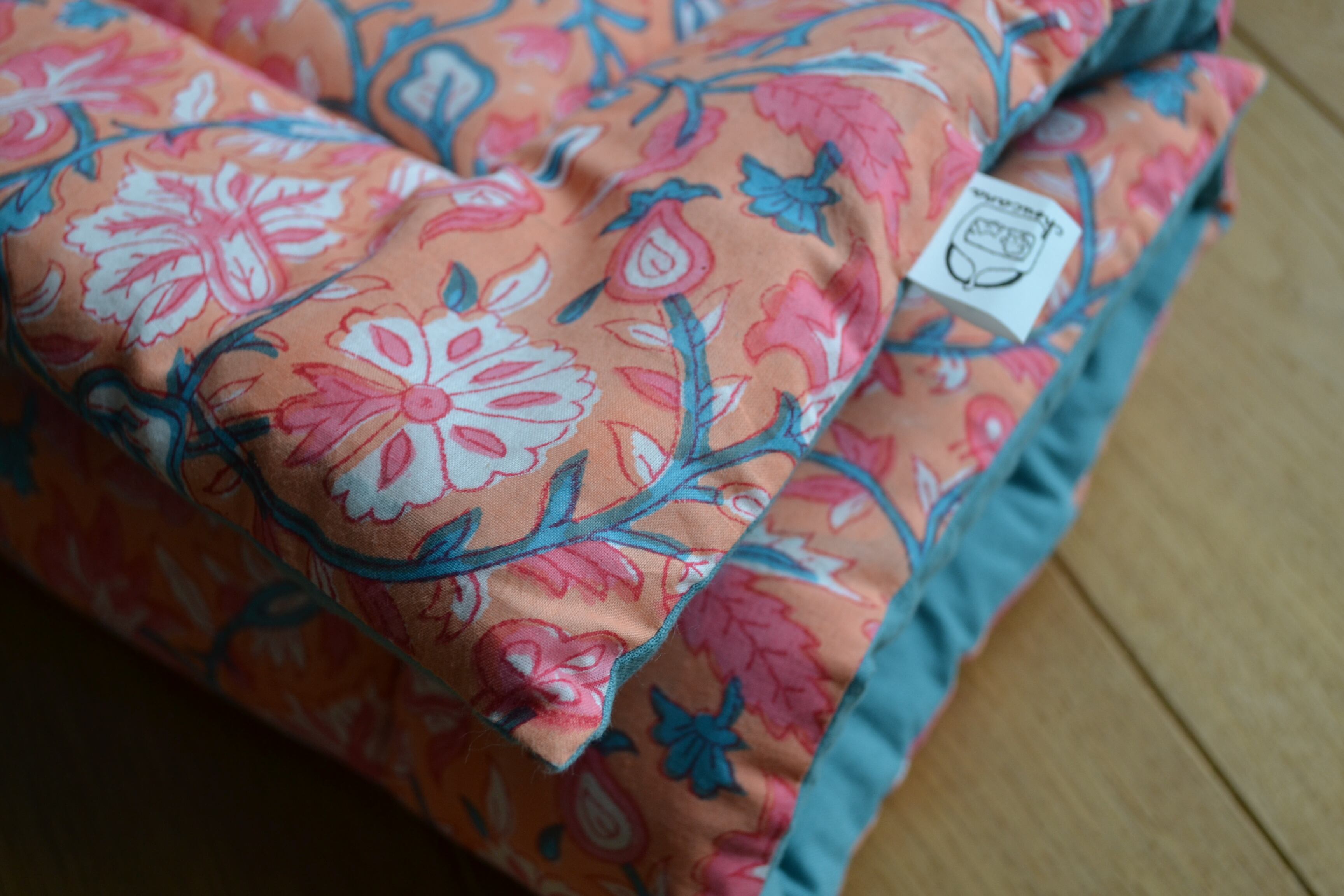 ブロックプリント生地はインドからお取寄せ、マットは国内で一つ一つ丁寧に、