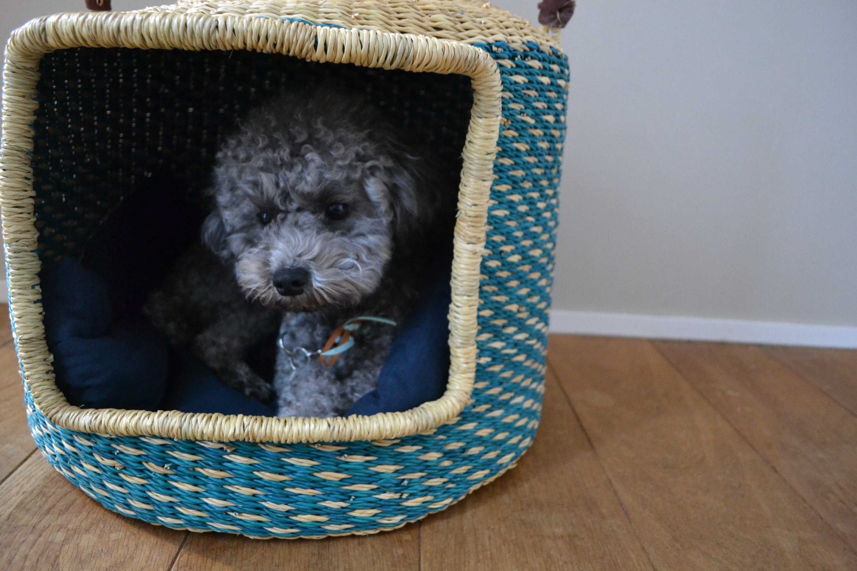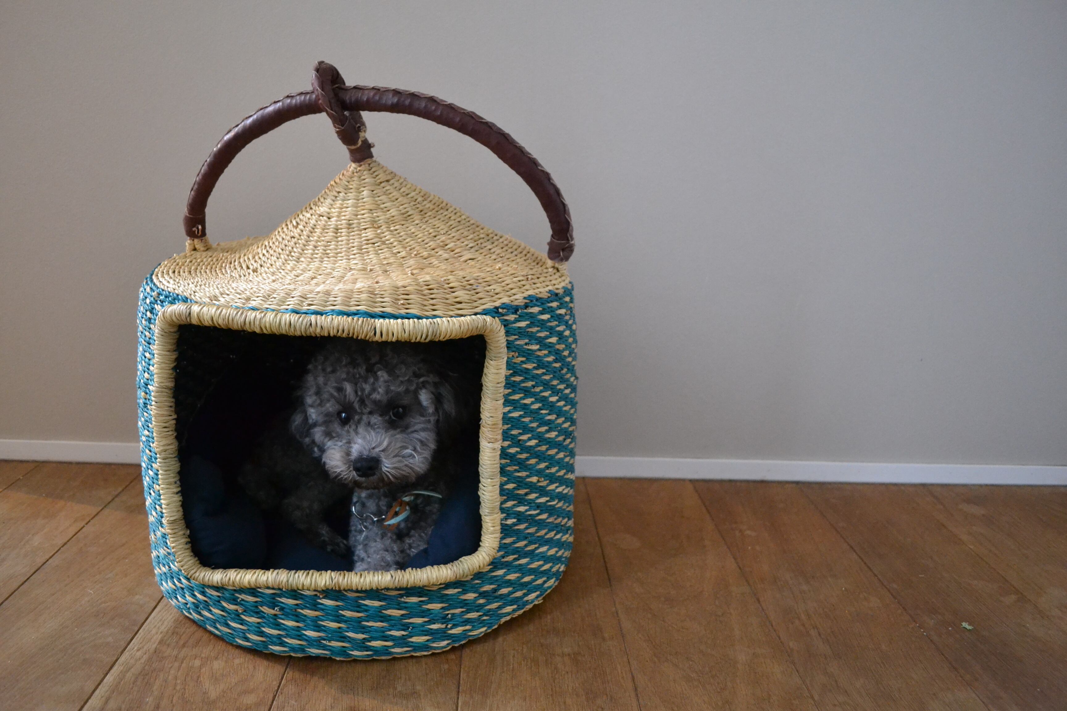 コチラの屋根付きボルガバスケットはMサイズで3キロ未満の小型犬、または猫ちゃんにおススメです!可愛い持ち手付きなので、お掃除の際の移動もラクラク。