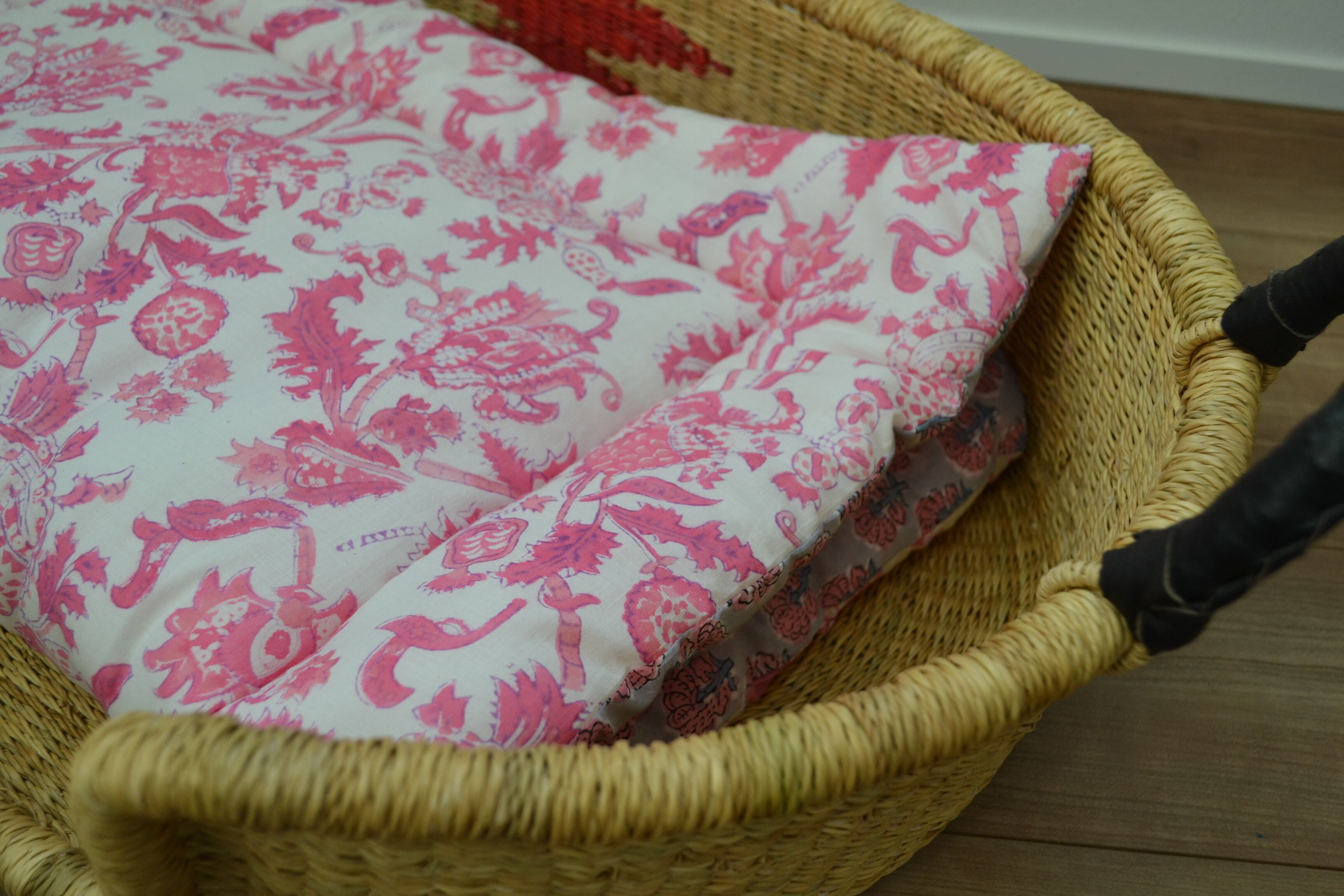 ブロックプリント生地はインドからお取寄せ、マットは国内で一つ一つ丁寧に製作。