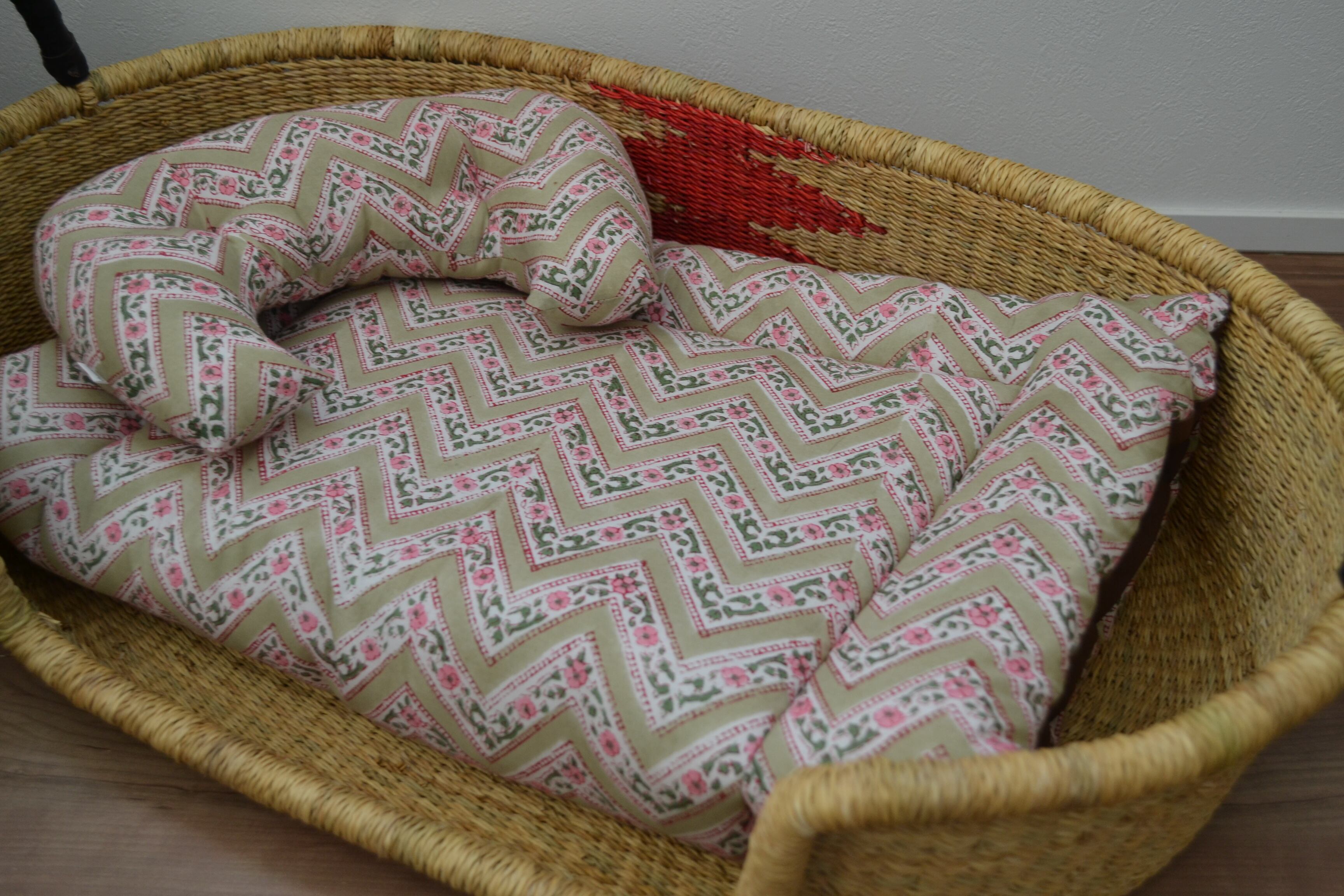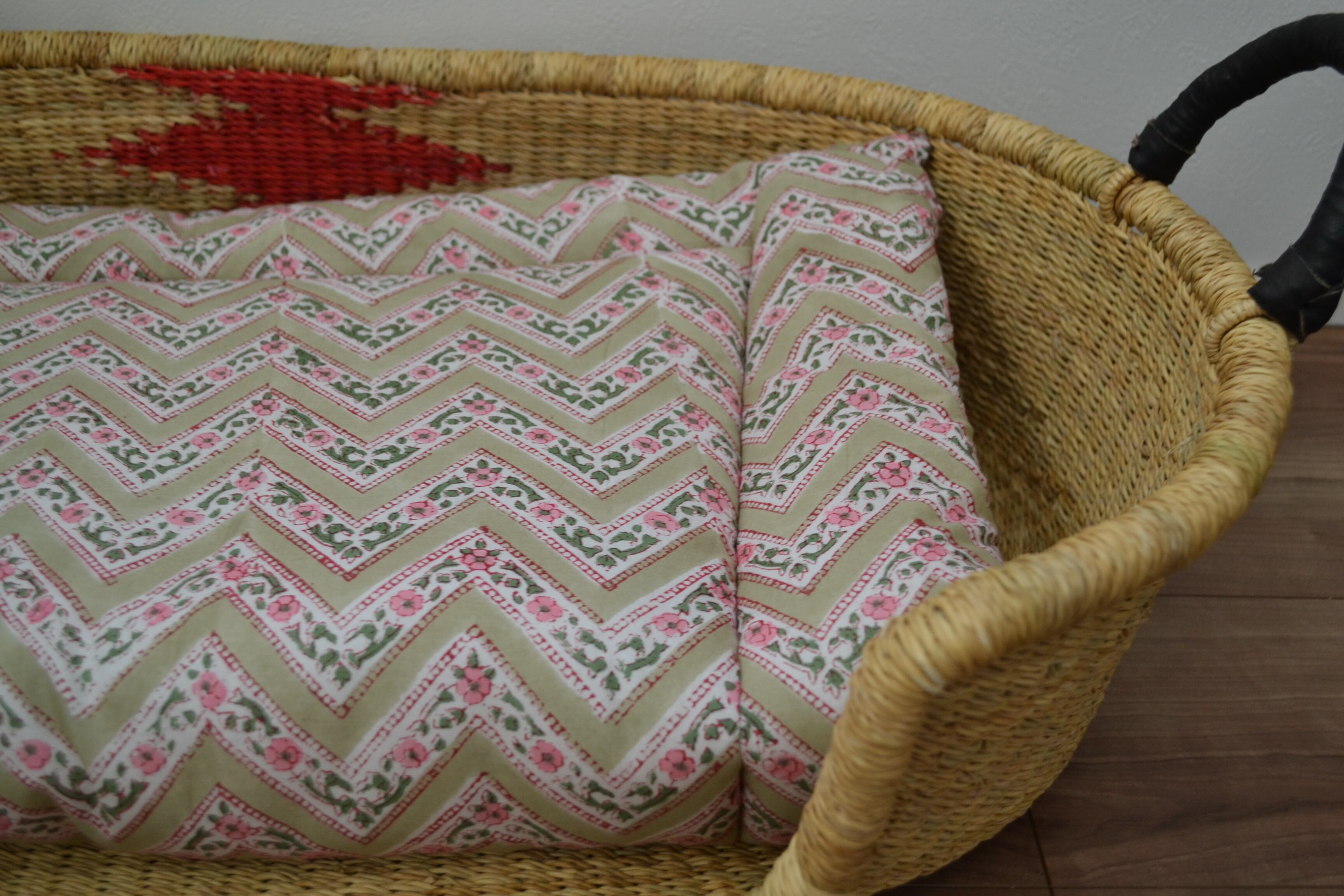 ブロックプリント生地はインドからお取寄せ、マットは国内で一つ一つ丁寧に製作。