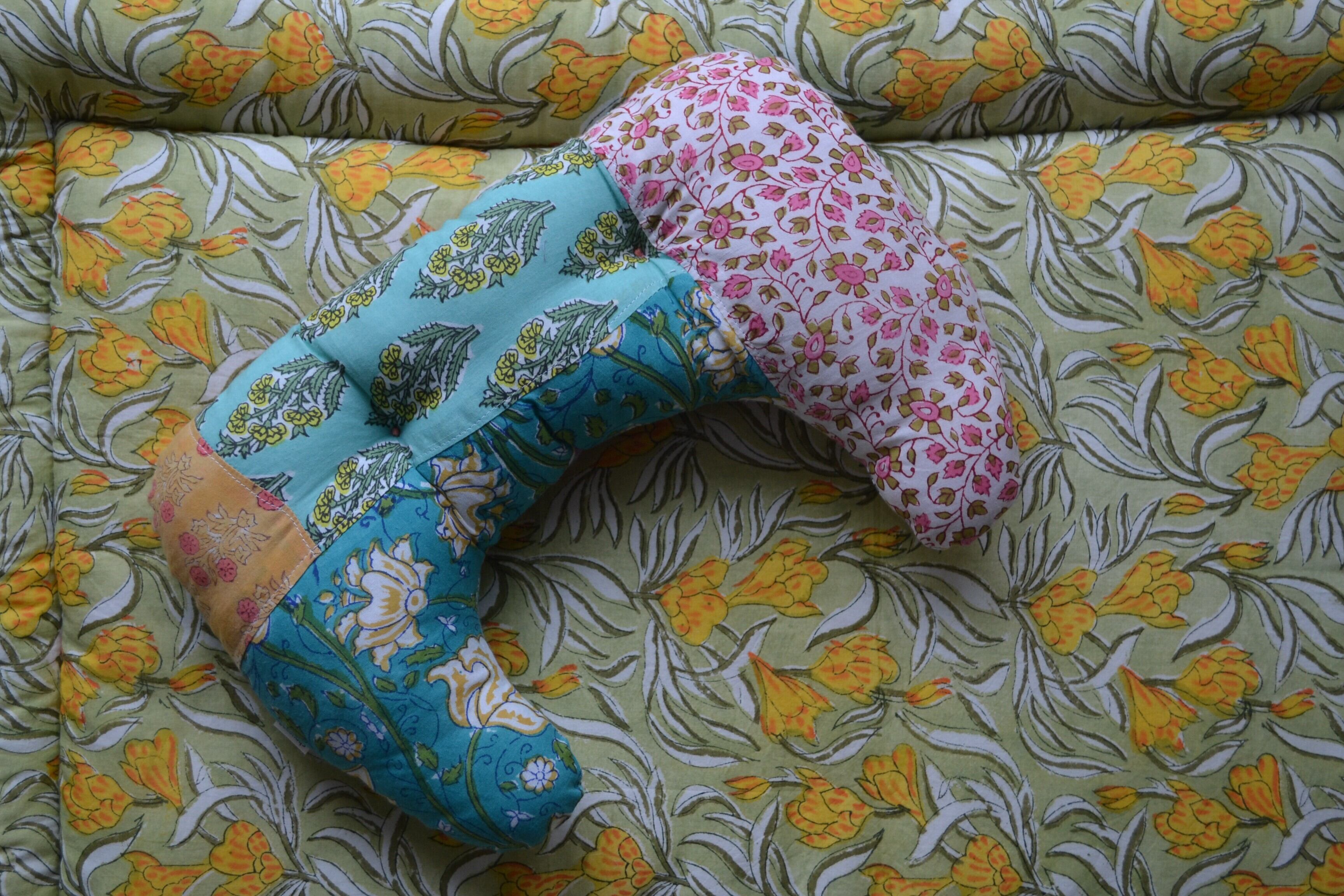 ブロックプリント生地はインドからお取寄せ、マットは国内で一つ一つ丁寧に製作。
